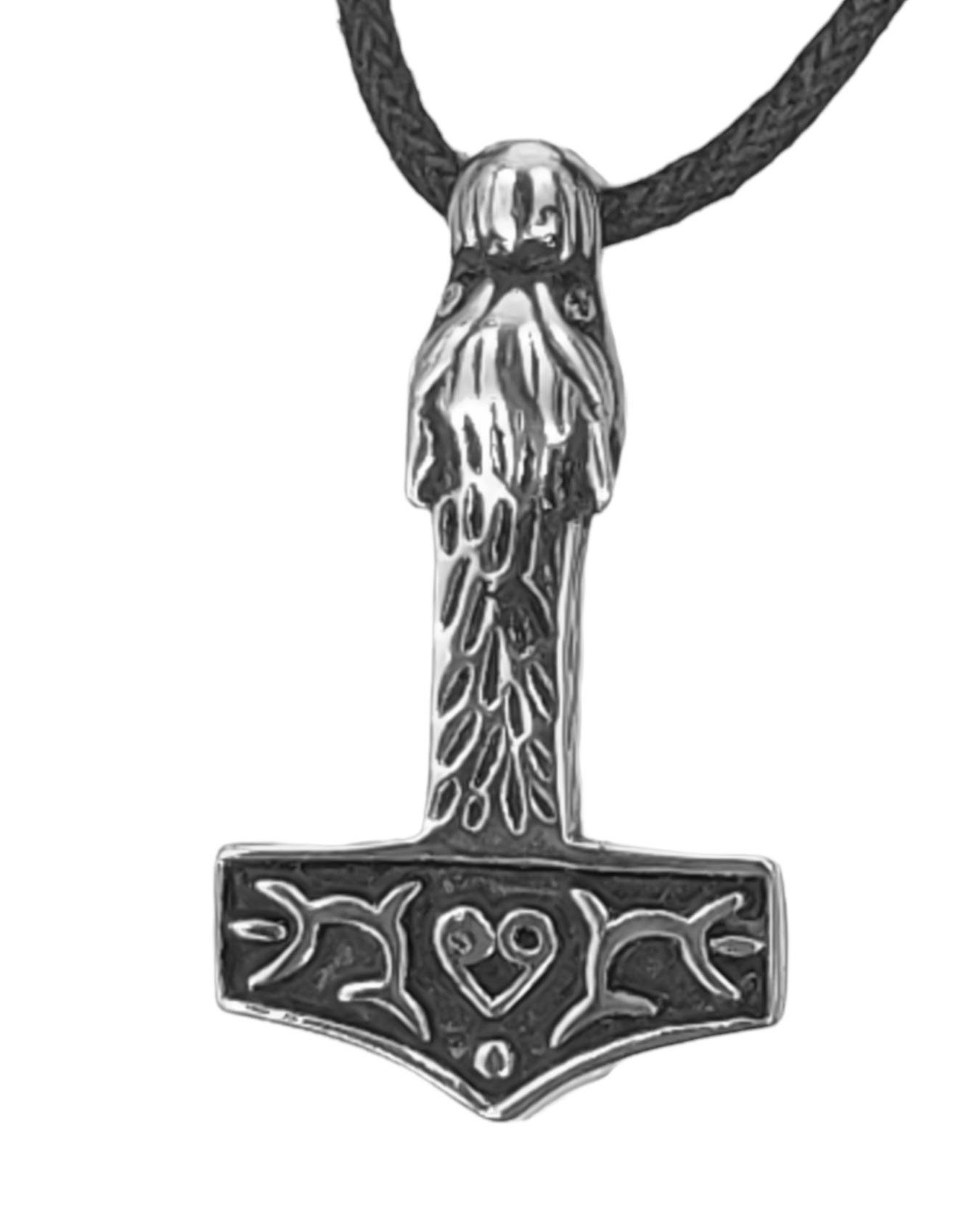 Hochwertig verarbeiteter Thorshammer aus Edelstahl. Die Öse ist aufwändig als Wolfskopf gestaltet.