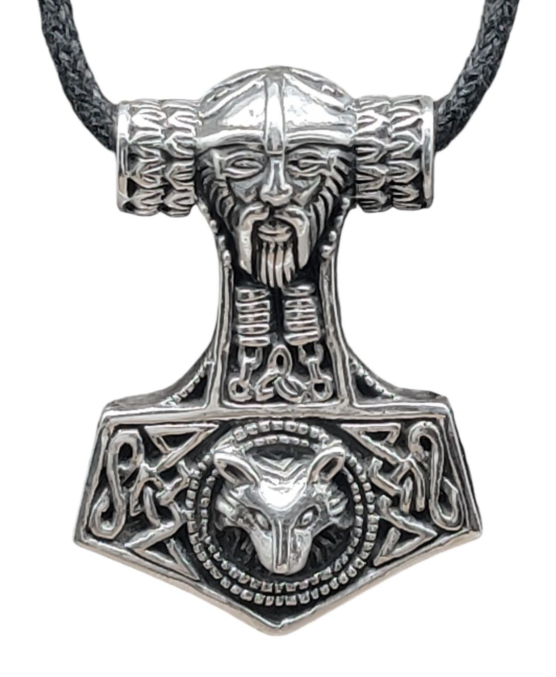 Der Hammer ist teilweise geschwärzt und mit Keltenknoten, dem Haupt Odins sowie einem Wolfskopf verziert. Die Rückseite das Anhängers ist hohl.