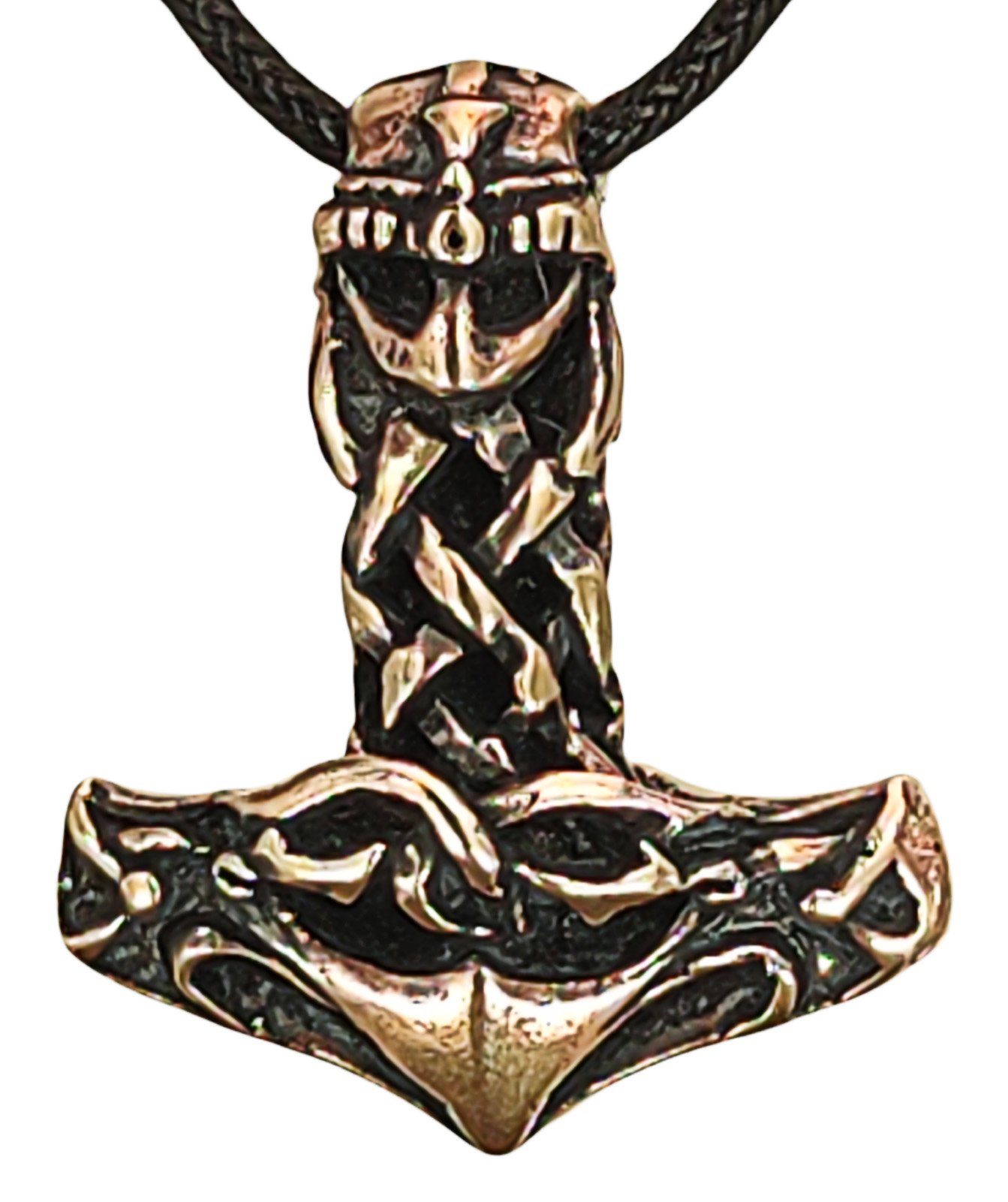 Schwerer, hochwertig verarbeiteter Thorshammer aus Bronze. Die Öse ist als Wikingerhelm gestaltet.