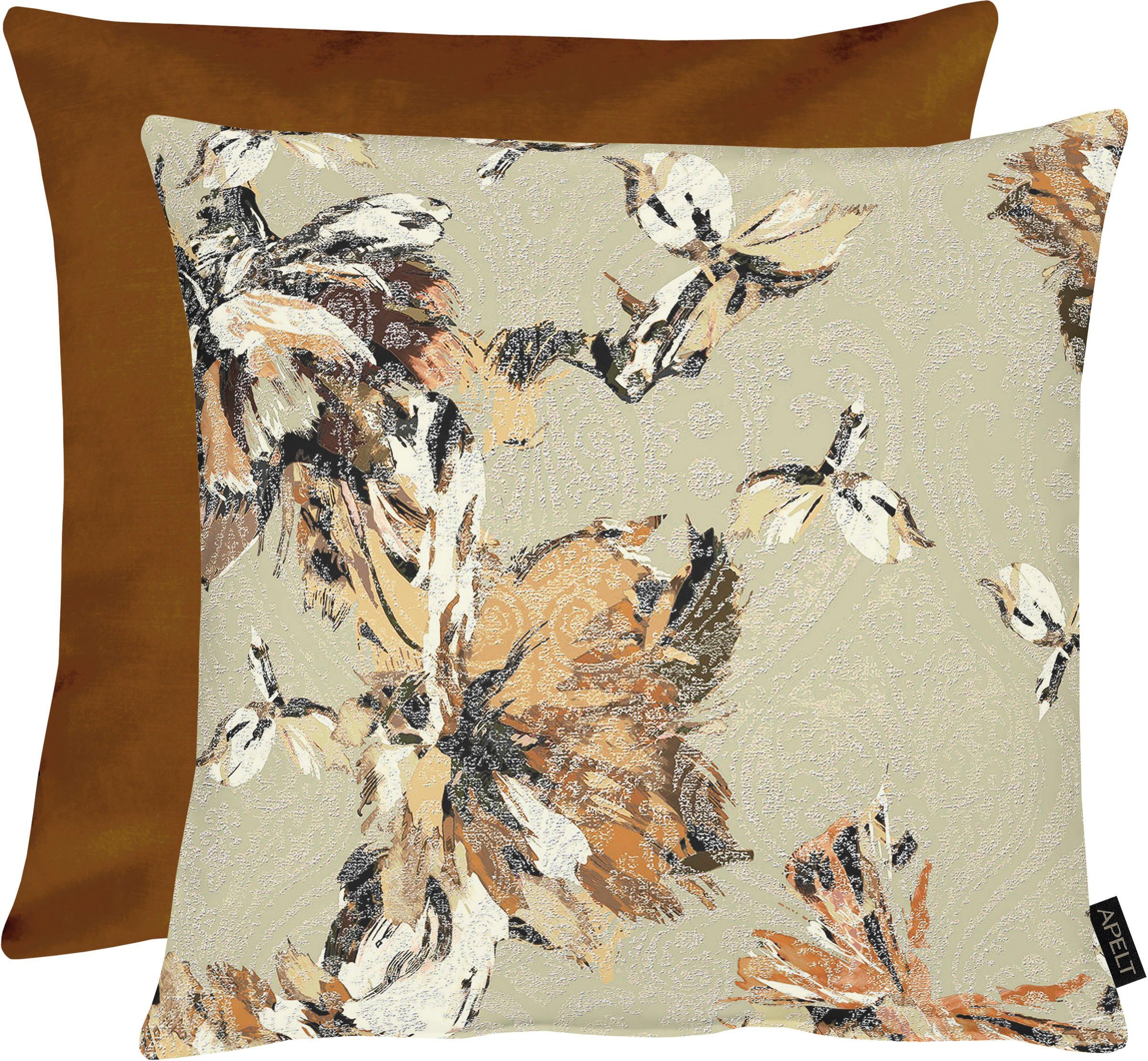 Hochwertiges Kissen aus dem Hause Apelt. Ein besonderes Jacquardgewebe digital bedruckt und mit Flocktechnik zusätzlich veredelt mit eleganten Blüten- und Blatt-Motiven und einer passenden Rücksteite aus weichem Samt. Die elegante Wohnfarbe ist geschaffen für zeitgemäßes Einrichten mit Textil. Die Kissenhülle hat einen praktischen Reißverschluss. Das hochwertige Material besteht aus 100% Polyester. Waschbar mit 30°C im Schonwaschgang, feucht aufhängen, auf 2 Punkt bügeln.Schadstoffgeprüft nach Ökotex Standard-1oo und made in Germany.