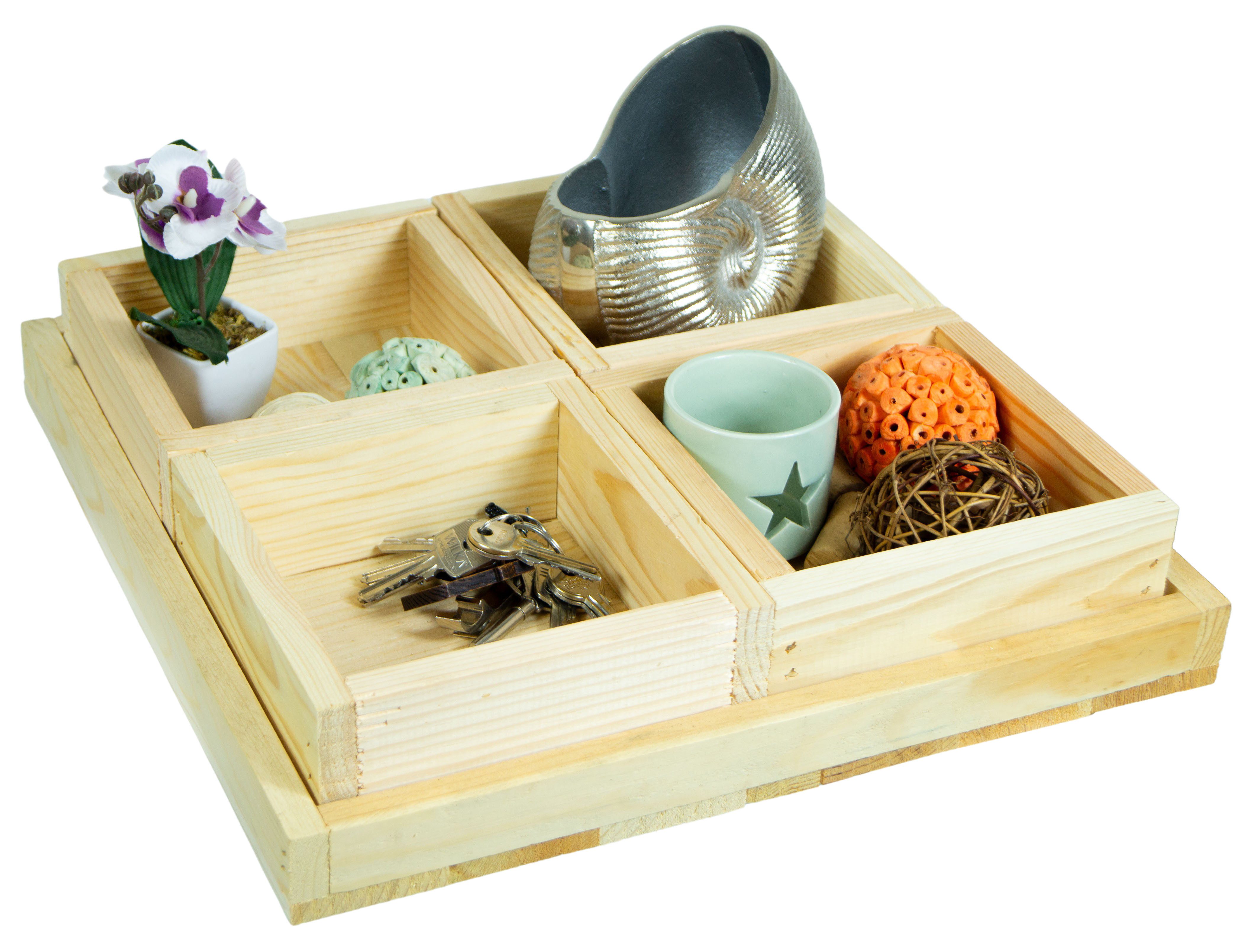 Dekorative Ordnung mit dem vielseitigen Tablett-Set Suchen Sie nach einer stilvollen und praktischen Lösung, um Ihre Dekorationen zu präsentieren und gleichzeitig Ordnung zu schaffen? Dann ist unser Dekotablett-Set genau das Richtige für Sie! Vielseitigkeit trifft auf Eleganz: Das Set besteht aus einem großen Tablett (40x40cm) und vier kleineren Kisten (18x18cm), die sowohl einzeln als auch zusammen verwendet werden können. Lassen Sie Ihrer Kreativität freien Lauf und gestalten Sie Ihre Dekoration ganz nach Ihrem Geschmack. Perfekt für jeden Anlass: Ob auf dem Wohnzimmertisch, im Schlafzimmer oder im Flur – unser Dekotablett-Set ist ein echter Blickfang und passt perfekt zu jedem Einrichtungsstil. Verwenden Sie es, um Kerzen, Vasen, Pflanzen oder andere Dekorationsgegenstände zu präsentieren. Die kleineren Kisten eignen sich hervorragend zur Aufbewahrung von kleinen Accessoires, Süßigkeiten oder anderen Dingen, die Sie griffbereit haben möchten. Hochwertige Materialien und Verarbeitung: Unser Dekotablett-Set ist aus hochwertigem Material gefertigt und sorgfältig verarbeitet. So können Sie sicher sein, dass Sie lange Freude daran haben werden. Geschenkidee: Unser Dekotablett-Set ist auch eine tolle Geschenkidee für Freunde und Familie. Es ist ein praktisches und stilvolles Geschenk, das jedem gefallen wird. Bestellen Sie jetzt Ihr Dekotablett-Set und schaffen Sie Ordnung und Stil in Ihrem Zuhause!