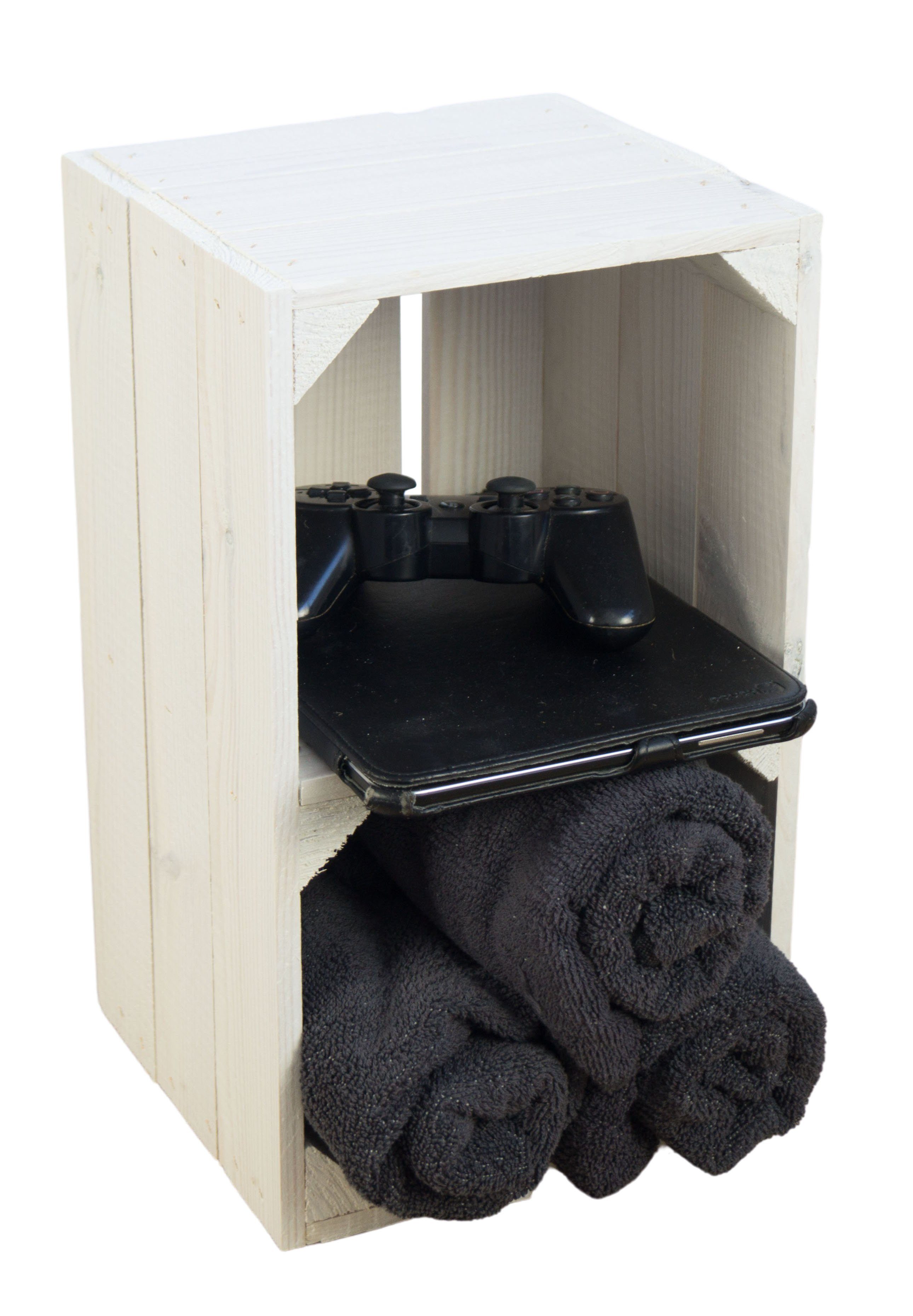 Außerdem wurde hier ein Brett in der Mitte montiert, sodass sich die Kiste aufrecht stehend, wunderbar als kleiner