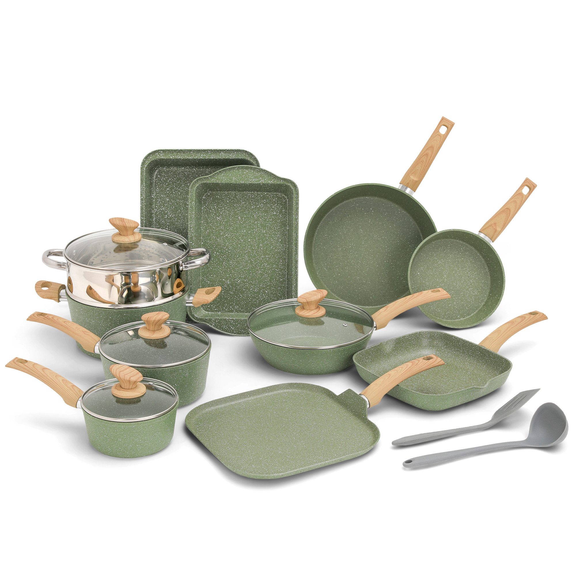 Entdecken Sie unser 17-teiliges Küchen-Kochgeschirr-Set! Dieses umfassende Set beinhaltet alles, was Sie zum Kochen brauchen: eine 20 cm Bratpfanne, eine 28 cm Bratpfanne, eine 24 cm tiefe Bratpfanne mit Deckel, eine quadratische Bratpfanne (24 cm und 29 cm), eine 1,5 qt Stielkasserolle mit Deckel, eine 3 qt Kasserolle mit Deckel, eine 5 qt Kasserolle mit Deckel sowie einen Dampfgarer/backform (35,5 x 23,5 x 5,5 cm) und ein rechteckiges Backblech (37 x 25 x 5,5 cm). Zwei Silikon-Utensilien sind ebenfalls enthalten. Diese Töpfe und Pfannen sind leicht zu reinigen, wobei Handwäsche empfohlen wird. Dank der Antihaftfähigkeiten unserer Granitware-Beschichtung haften Lebensmittel nicht. So können Sie gesund kochen, ohne viel Öl verwenden zu müssen. Sie können sogar Tomatensauce zubereiten, ohne sich Sorgen um unerwünschte Geschmäcker oder Gerüche machen zu müssen. Unser Induktionskochgeschirr-Set verfügt über einen Aluminiumkern, der eine schnelle und gleichmäßige Erwärmung ermöglicht und auf allen Herdarten funktioniert. Der hochmagnetische Edelstahlboden sorgt für eine hervorragende Induktionskompatibilität, ideal für Glaskochfelder. Die klassische 5-lagige Konstruktion sorgt für optimale Wärmeverteilung und Haltbarkeit. Der zusätzliche transparente Deckel aus gehärtetem Glas ermöglicht es Ihnen, den Kochvorgang jederzeit zu beobachten und verhindert ein Verschütten. Lassen Sie die natürlichen Säfte und Nährstoffe Ihrer Lebensmittel erhalten!