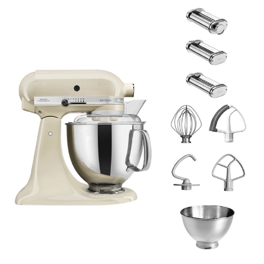 Leben Sie Ihre Kreativität mit dem KitchenAid Premiummodell Artisan 5KSM175PSE als ultimative Kochhilfe aus. Die Küchenmaschine lässt schon viele Herzen höher schlagen. Im Lieferumfang der KitchenAid Artisan 5KSM175PSE sind neben der 4,8 Liter Edelstahlschüssel mit Handgriff, eine 3,0 Liter Edelstahlschüssel ohne Griff, Spritzschutz, Flachrührer, Knethaken, Schneebesen, Flexibler Flachrührer, das Nudelwalzen 3er- Set enthalten. Mit diesem Set können Sie Lasagne, Spaghetti und Fettuccine zubereiten.