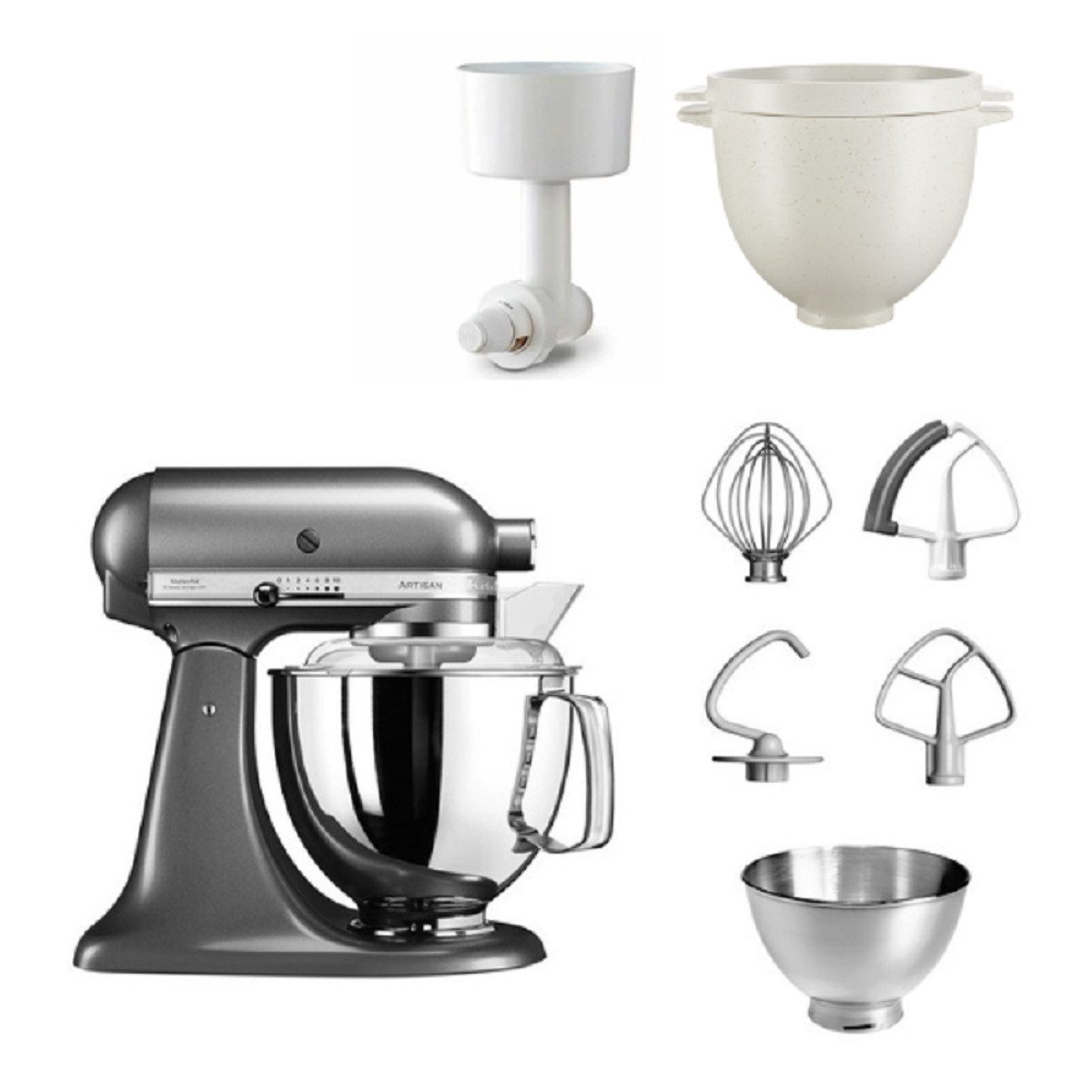Leben Sie Ihre Kreativität mit dem KitchenAid Premiummodell Artisan 5KSM175PSE als ultimative Kochhilfe aus. Die Küchenmaschine lässt schon viele Herzen höher schlagen. Im Lieferumfang der KitchenAid Artisan 5KSM175PSE sind neben der 4,8 Liter Edelstahlschüssel mit Handgriff, eine 3,0 Liter Edelstahlschüssel ohne Griff, Spritzschutz, Flachrührer, Knethaken, Schneebesen, Flexibler Flachrührer, ein Messerschmidt Getreidemühlenvorsatz und die Brotbackschüssel enthalten.