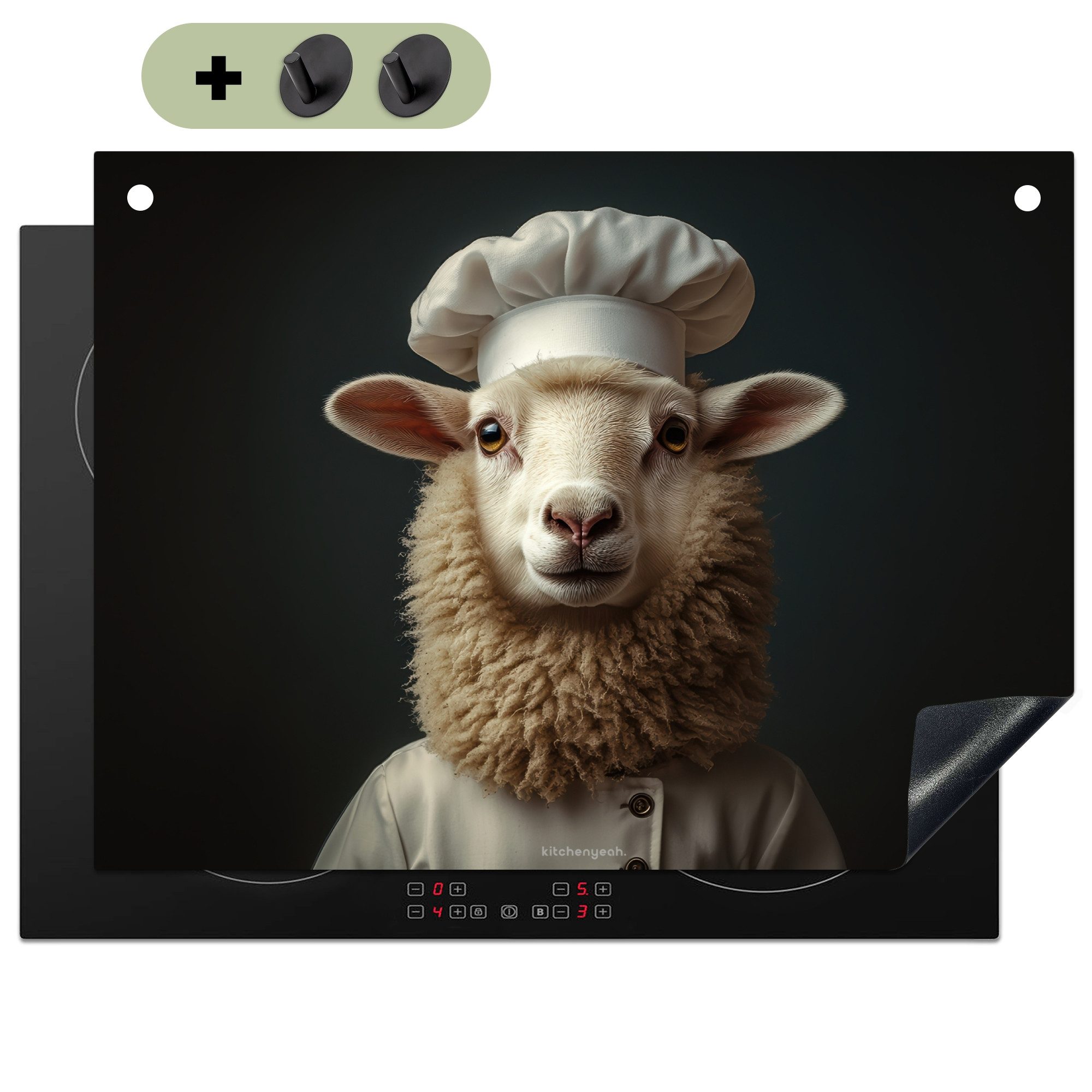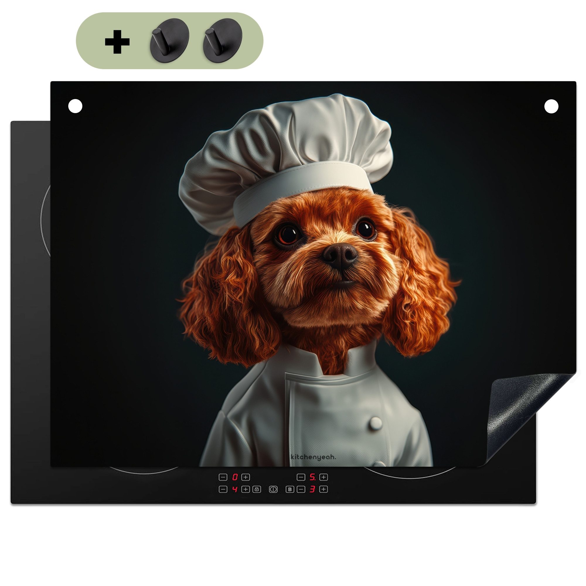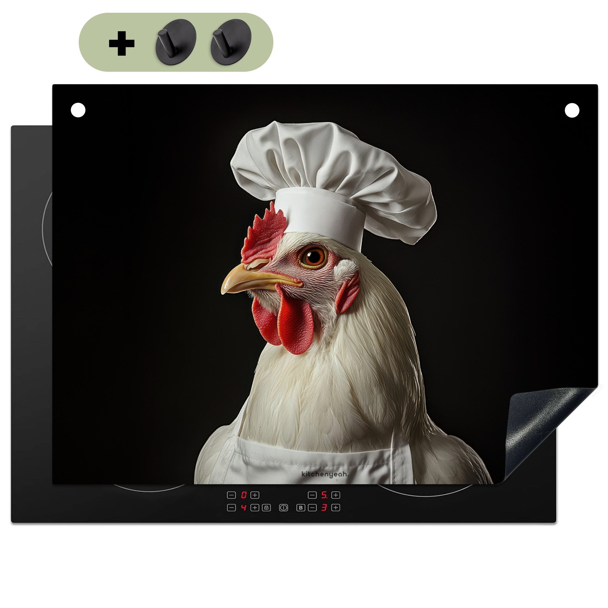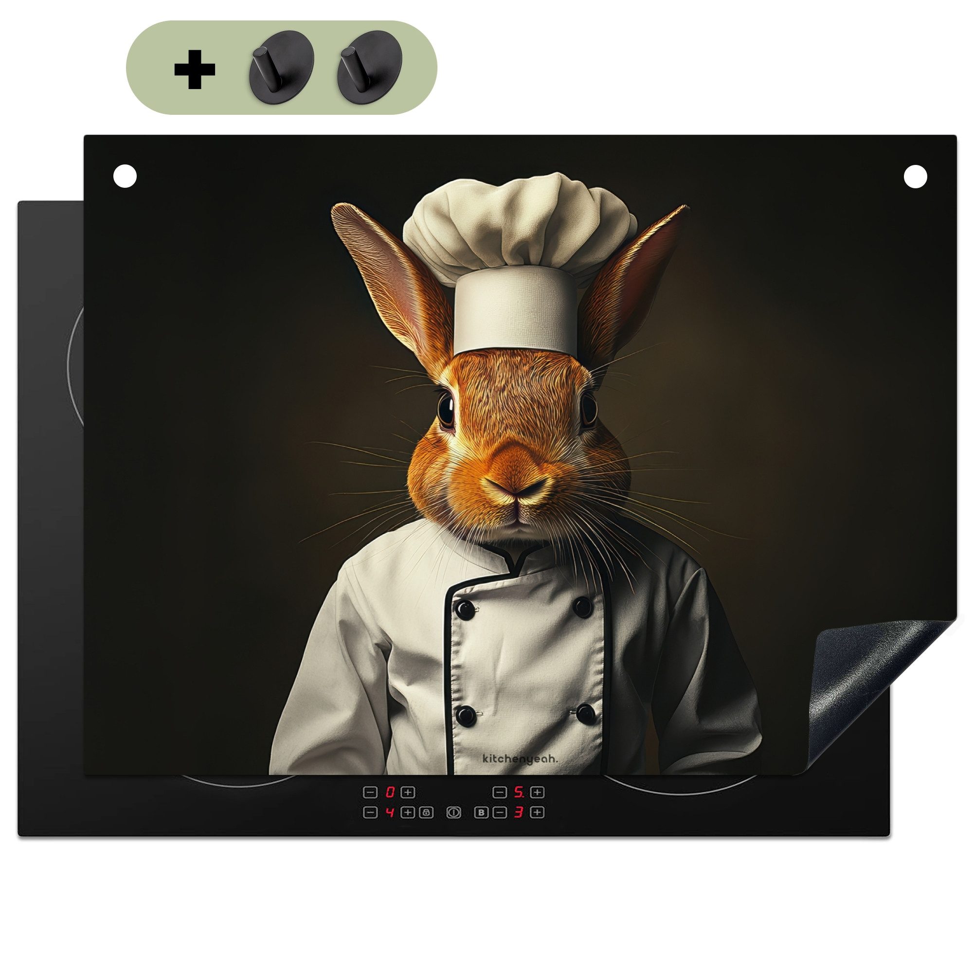 Ein elegantes Kaninchen mit warmem orangefarbenem Fell trägt eine Kochmütze und eine adrette weiße Kochjacke mit schwarzen Details. Seine langen Ohren und sein nachdenklicher Blick verströmen eine besondere Mischung aus Niedlichkeit und seriöser Handwerkskunst.