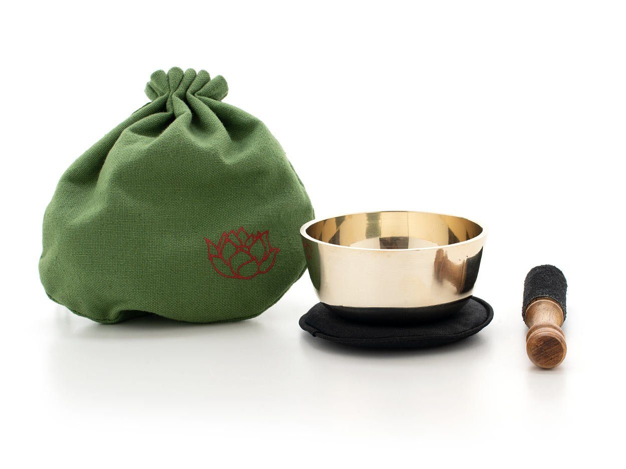 Im praktischen Stoffbeutel mit schönem Lotusmotiv findet die Klangschale auch unterwegs ihren Platz.