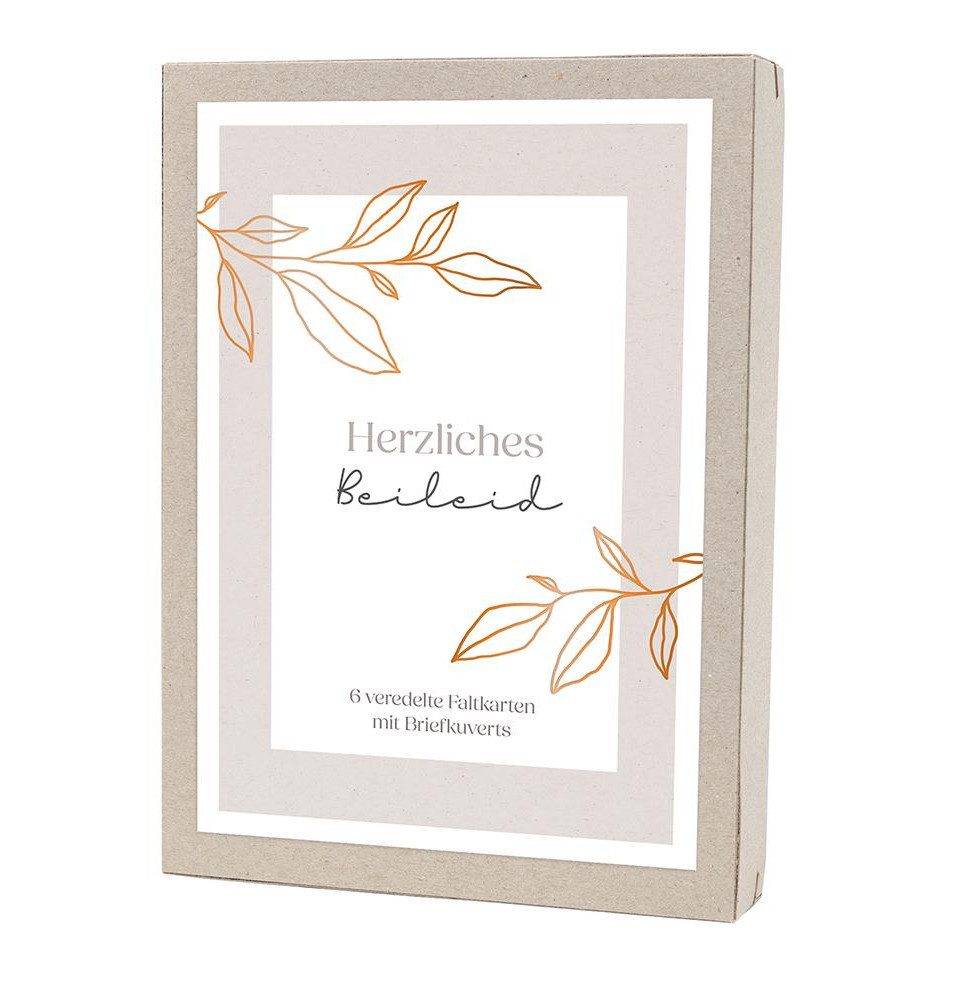 Box mit 6 versch. Faltkarten und Umschlägen für Trauer Format der Box: 13,3 x 18,2 x 3 cm. Die Karten sind auf Naturpapier gedruckt und mit Kupferfolie veredelt.