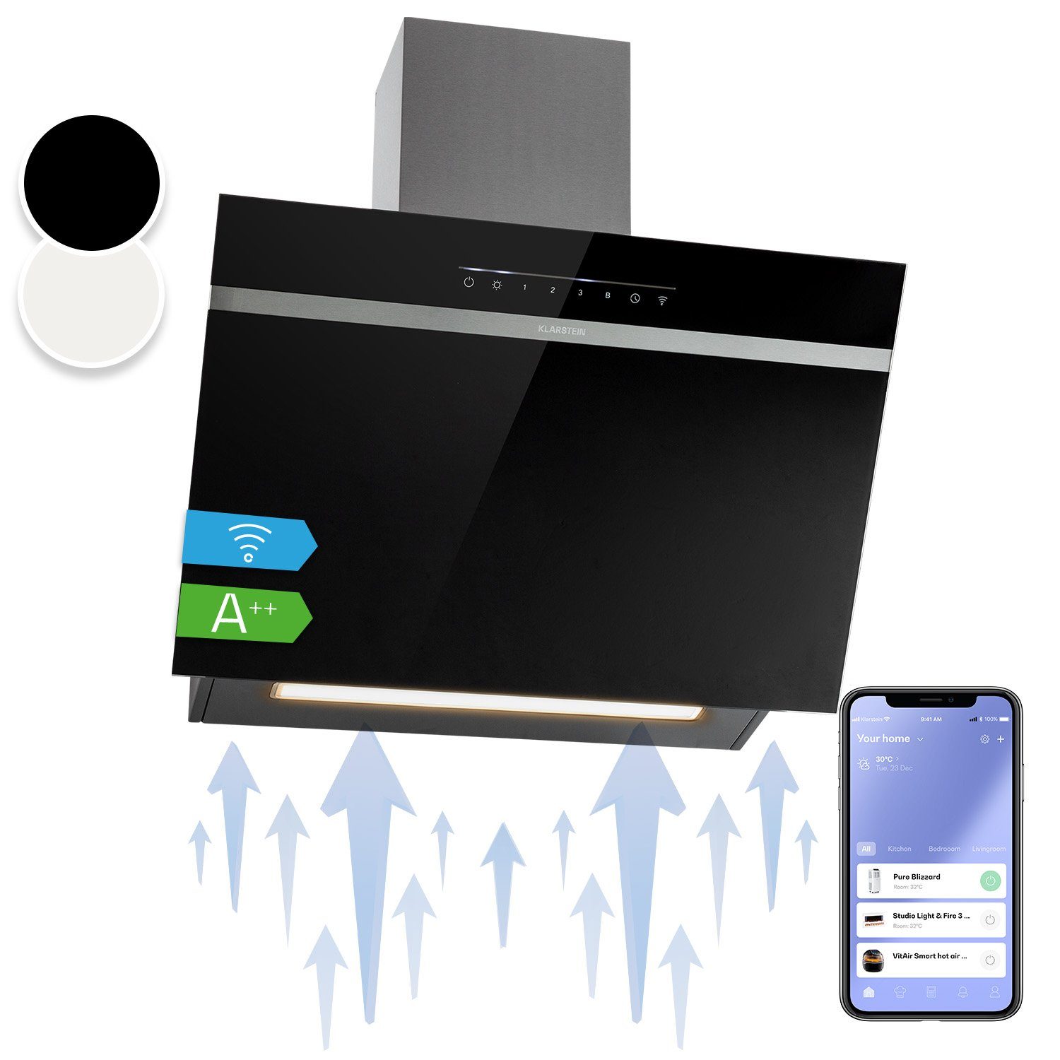 Mit 60 cm Breite ist die Klarstein Ava Dunstabzugshaube für kleine und mittlere Kochflächen und Küchenzeilen bestens geeignet. Technisch überzeugt sie nicht nur mit bis zu 515 Kubikmeter Abluftleistung, sondern auch mit ihrer besonders einfachen Bedienung. Unkompliziert funktioniert das entweder über WiFi mit der Klarstein-App oder direkt über die Red Line Touch-Bediensektion an der Frontseite. Hier kannst du nicht nur die drei Ventilationsstufen, eine Hochleistungs-Boosterfunktion oder den Nachlüfttimer auswählen. Sie ermöglicht dir auch, die integrierte LED-Kochflächenbeleuchtung sowohl in Helligkeit als auch Lichtwärme zu steuern.