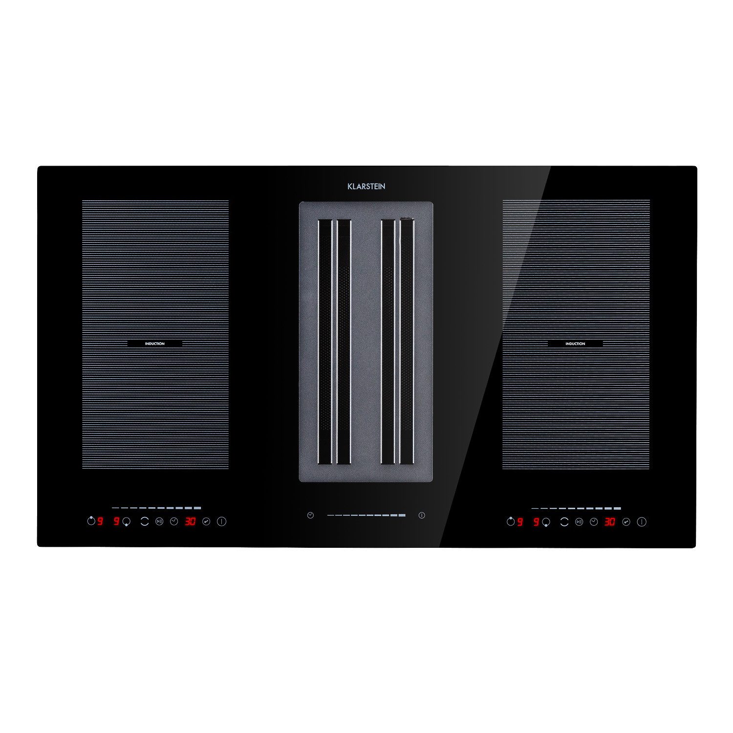 Vier Kochflächen für den kleinen bis großen Hunger besitzt das leistungsstarke Induktions-Kochfeld des Klarstein Full House 2.0 DownAir Systems. Jeweils zwei Kochflächen befinden sich links und rechts der Ansaugöffnung der DownAir-Haube und können dank VarioHeating System praktisch zu jeweils einer großen Flexzone, zum Beispiel für Kasserollen oder große Töpfe und Pfannen, verbunden werden. Jedes Kochfeld kann in 9 Stufen eingestellt werden. Topferkennung, Stop-and-Go-Funktion mit ThermalRecall, Restwärmeerkennung, Timer-Funktion und Kindersicherung runden das Einsatzspektrum der Kochfläche perfekt ab.