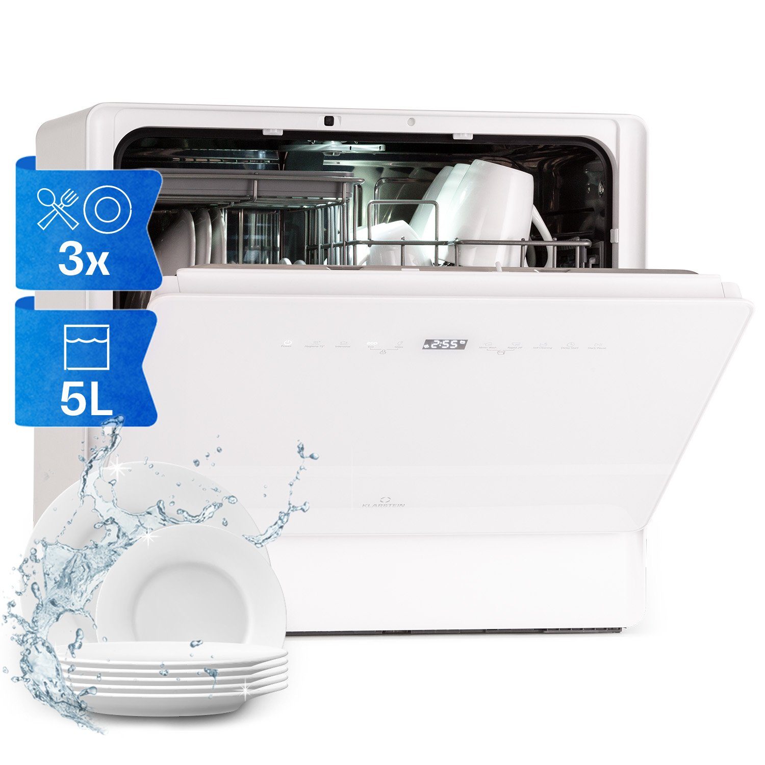Die Klarstein Emerald 5 Slim Geschirrspülmaschine ist mit ihrer kompakten Размер und zahlreichen Programmen ideal zur Nutzung in kleinen Wohnungen geeignet! Das Touch-Bedienfeld ermöglicht dabei eine einfache Bedienung und sorgt für beste Übersicht. Mit 7 verschiedenen Programmen und nur ca. 8 Litern Wasserverbrauch pro Spülgang bringt die Emerald 5 Slim dein Geschirr und Besteck zuverlässig zum Glänzen. Ein besonders nützliches Feature ist das automatische Öffnen der Frontklappe nach dem Spülvorgang, so kann Wasserdampf entweichen und das Geschirr ist direkt schrankfertig.