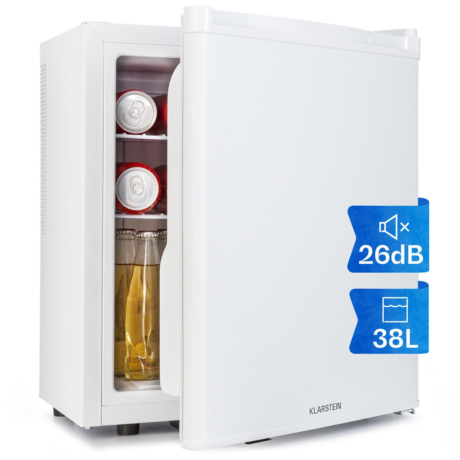 Platzsparend kühle Snacks und Drinks lagern: Der Happy Hour 38 Kühlschrank von Klarstein ist aufgrund seines besonders geräuscharmen Betriebs mit nur 26 dB und der kompakten Размер perfekt für kleine Haushalte, fürs WG-Zimmer oder Büro und besonders für Schlaf- und Gästezimmer geeignet. In seinem 38 Liter großen Innenraum finden auf 3 Ebenen allerlei Speisen, Getränke und Lebensmittel Platz. Zwei Gitterböden können auf drei Einschüben je nach Bedarf des Kühlschrankinhalts eingesetzt werden, während Eier, Butter und auch große Getränkeflaschen bis 2 Liter in den Türfächern Platz finden.