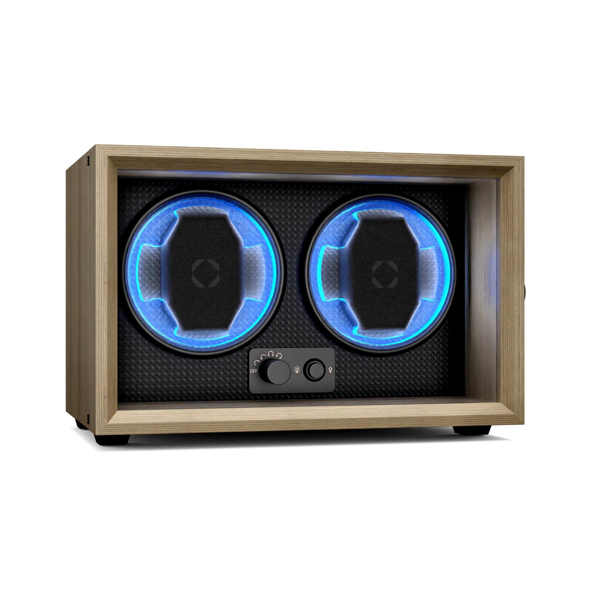 Der Brienz 2 Uhrenbeweger überzeugt mit einem eleganten Gehäuse in Holz-Optik, das sich stilvoll in jedes Raum-Ambiente einfügt. Mit der einfachen und intuitiven Bedienung kann auch die stilvolle, integrierte, blaue LED-Beleuchtung eingestellt werden. Rechts befindet sich der praktische Drehknopf zur Einstellung des gewünschten Modus. Durch das integrierte Memory-Schaum-Kissen können Uhren verschiedener Armbandgrößen sowie Damen- und Herrenuhren problemlos im Uhrenbeweger eingesetzt werden. Die Stromversorgung erfolgt über ein USB-Kabel, das mit jedem USB-Netzteil verwendet werden kann, und ist damit völlig unabhängig vom vorherrschenden Steckdosentyp.
