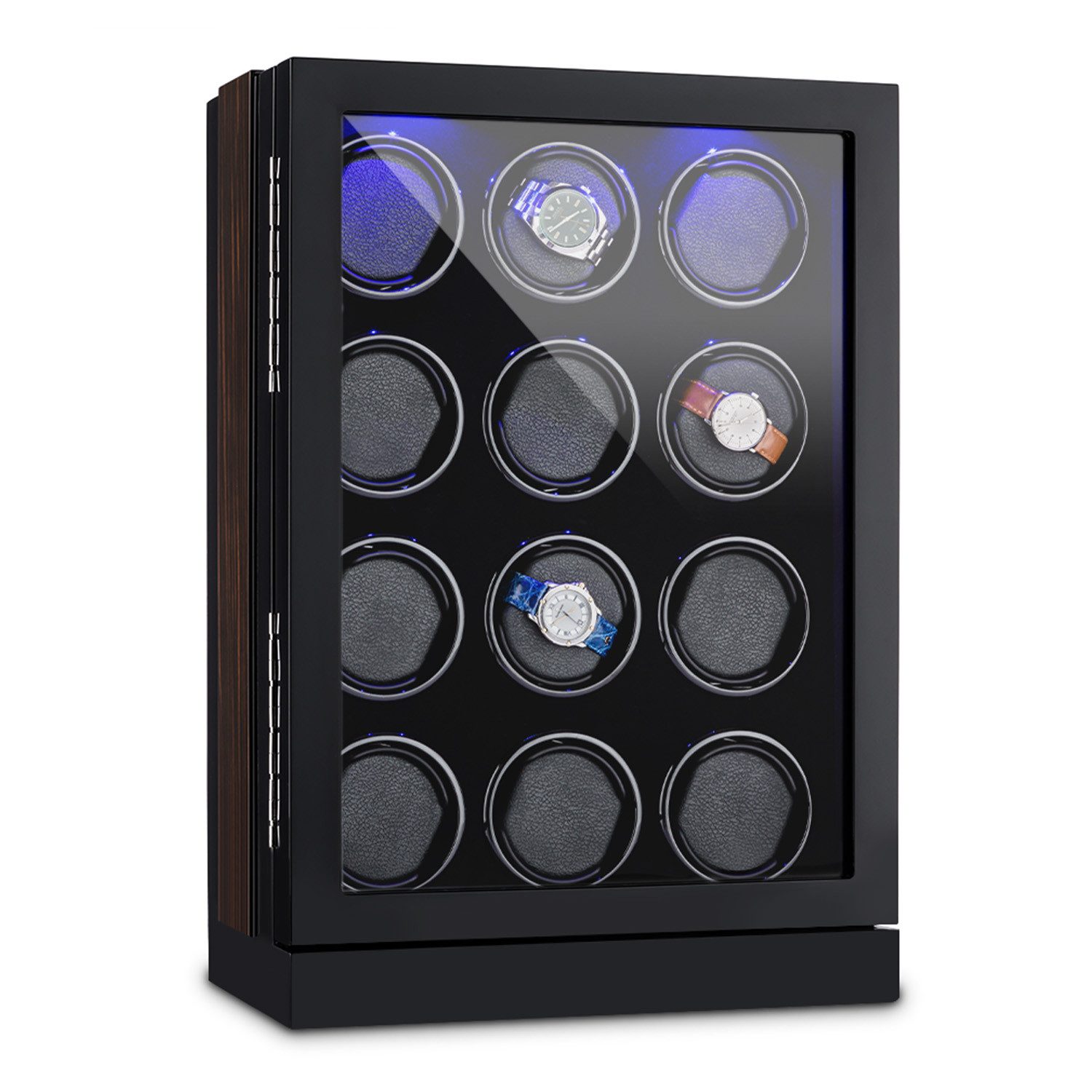 Der luxuriöse, schwarze Schaukasten des Klarstein Klagenfurt Uhrenbewegers wartet mit zwölf Aufnahmen mit jeweils einem schwarzen Kissen auf, und setzt jede Uhr elegant in Szene. Der Uhrenbeweger für 12 Uhren stellt sicher, dass sowohl Chronometer mit langem als auch kurzem Armband festen Sitz finden. Die ebenfalls schwarze Samibespannung des Inneren vervollständigt den edlen Gesamteindruck. Eine Kunststofftür schützt die wertvollen Zeitmesser vor Staub und Schmutz, während eine einschaltbare, blaue LED-Beleuchtung für einen guten Einblick ins Innere sorgt. Zwei einfach verständliche, digitale Touch-Displays mit jeweils 6 Tastfeldern dient der separaten Steuerung der zwölf Rotatoren. So lassen sich für jede Aufnahme einzeln Rechts-, Links- oder Rechts-Links-Lauf sowie die gewünschten Umdrehungen pro Tag - bis 2200 - einstellen.