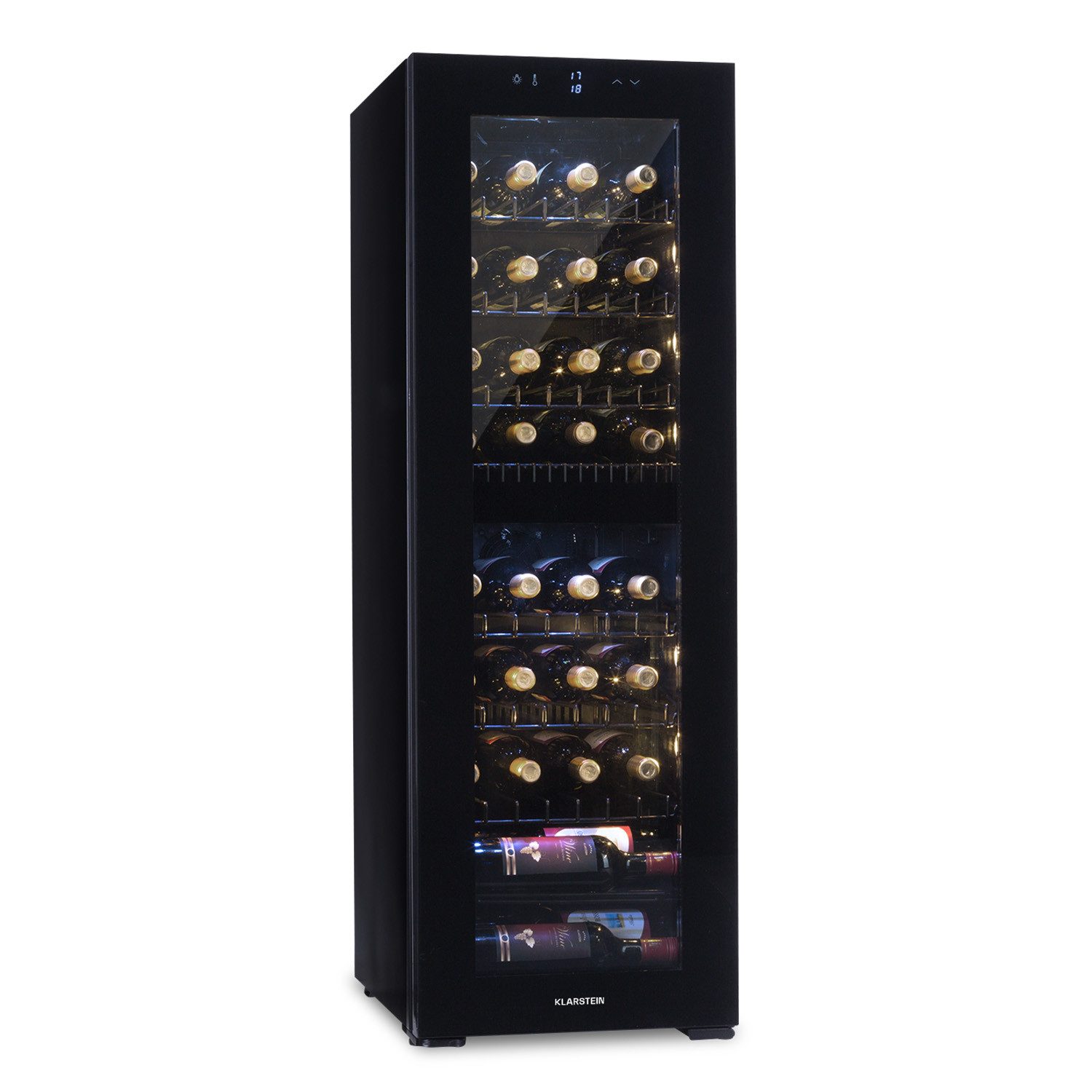 Ausgezeichnet Schoppen: deshalb liegt die Stärke des Klarstein Shiraz 39 Duo Weinkühlschranks nicht nur in der perfekten Kühlung und flexiblen Lagerung von Wein, sondern auch auf der ansprechenden Präsentation der edlen Tropfen. Die schwarz glänzende Fronttür ist mit einem Panoramafenster aus temperiertem Glas ausgestattet, das die Begutachtung der Weine ohne Kühlungsunterbrechung erlaubt. Eine dezent-elegante Innenbeleuchtung aus warmweißen Seiten-LEDs und einer kaltweißen LED-Oberleuchte setzt Glanzpunkte auf den Flaschen. Sein elegantes Design verträgt sich bestens mit einem gediegenen Einrichtungsverständnis und eignet sich durch den hohen Präsentationsfaktor bestens zur Aufstellung in Barbereichen von Hotels oder Restaurants.