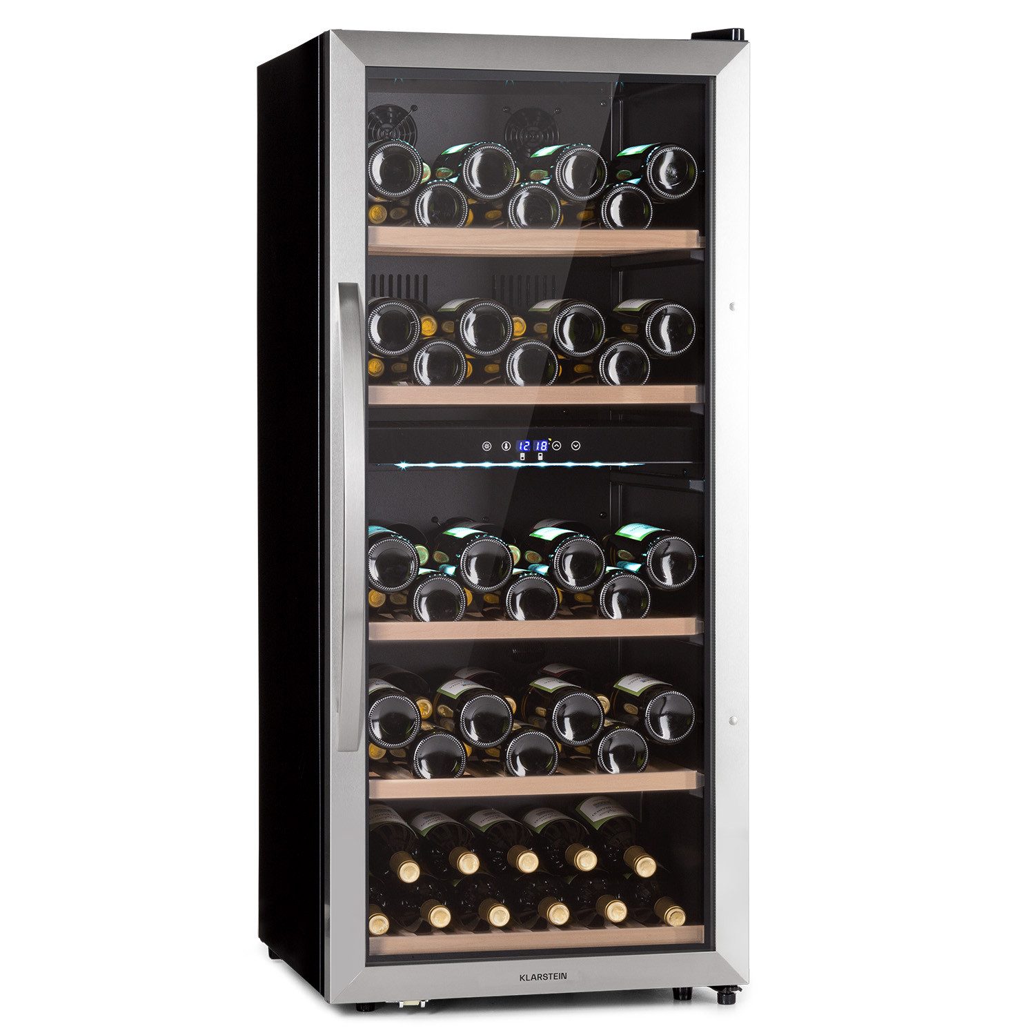 Der Klarstein Vinamour 66 Duo Weinkühlschrank sorgt für besten Weingenuss. Dank zwei getrennter Kühlzonen schenkt er insgesamt 79 Flaschen Rot- oder Weißwein zeitgleich die richtige Trinktemperatur. Per Touch-Bedienfeld lassen sich Kühltemperaturen von 5 bis 18 °C einstellen - ideal auch für prickelnden Champagner. Dabei sorgt der Weinkühlschrank 2 Zonen für ein luxuriöses Ambiente und präsentiert die edlen Tropfen auf besondere Weise. Die weiße Beleuchtung setzt einen eleganten Fokus auf die gelagerten Weine und durch die Panorama-Glastür hast du alles bestens im Blick.