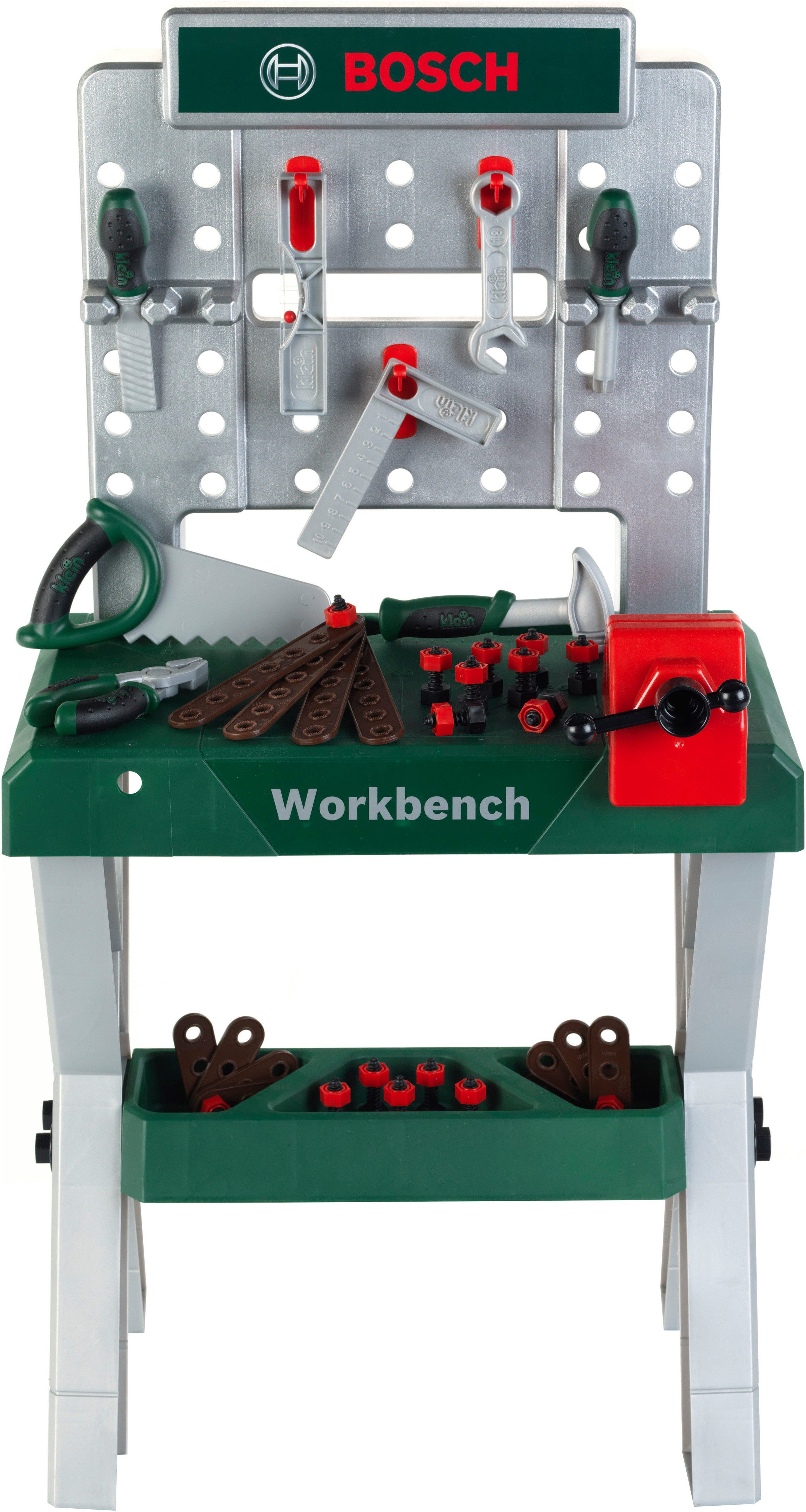 Die 56-teilige Werkbank im Bosch-Design ist aus hochwertigem Kunststoff, sehr stabil und robust gebaut. Zur Ausstattung gehört eine Arbeitsplatte an der Kinder schrauben, drehen, hämmern und sägen können. Всеs, was sie dafür brauchen, liefert Theo Klein gleich mit: zahlreiches Werkzeug und viel Zubehör, das die Entwicklung der Kinder fördert: Das Schrauben und Werken schult die Feinmotorik, das räumliches Vorstellungsvermögen sowie das technische Verständnis. Die Bosch Werkbank passt in jede Werkstatt. Ihr merkt man die Erfahrung und Entwicklungsarbeit von Theo Klein an: abgerundete Kanten, kindgerechte Formen, Passgenauigkeit für kleine Hände - perfekt für den Spielspaß. Die Werkbank im Bosch-Design hat eine Arbeitsplatte mit Lernfunktion, enthält hochwertiges Werkzeug, darunter eine Feile, eine Säge, eine Zange, einen Hammer, einen Winkel, eine Wasserwaage, einen Schraubendreher und einen Schraubenschlüssel. Hinzu kommt zahlreiches Zubehör ein Schraubstock, Schrauben und Muttern sowie kurze und lange Latten.