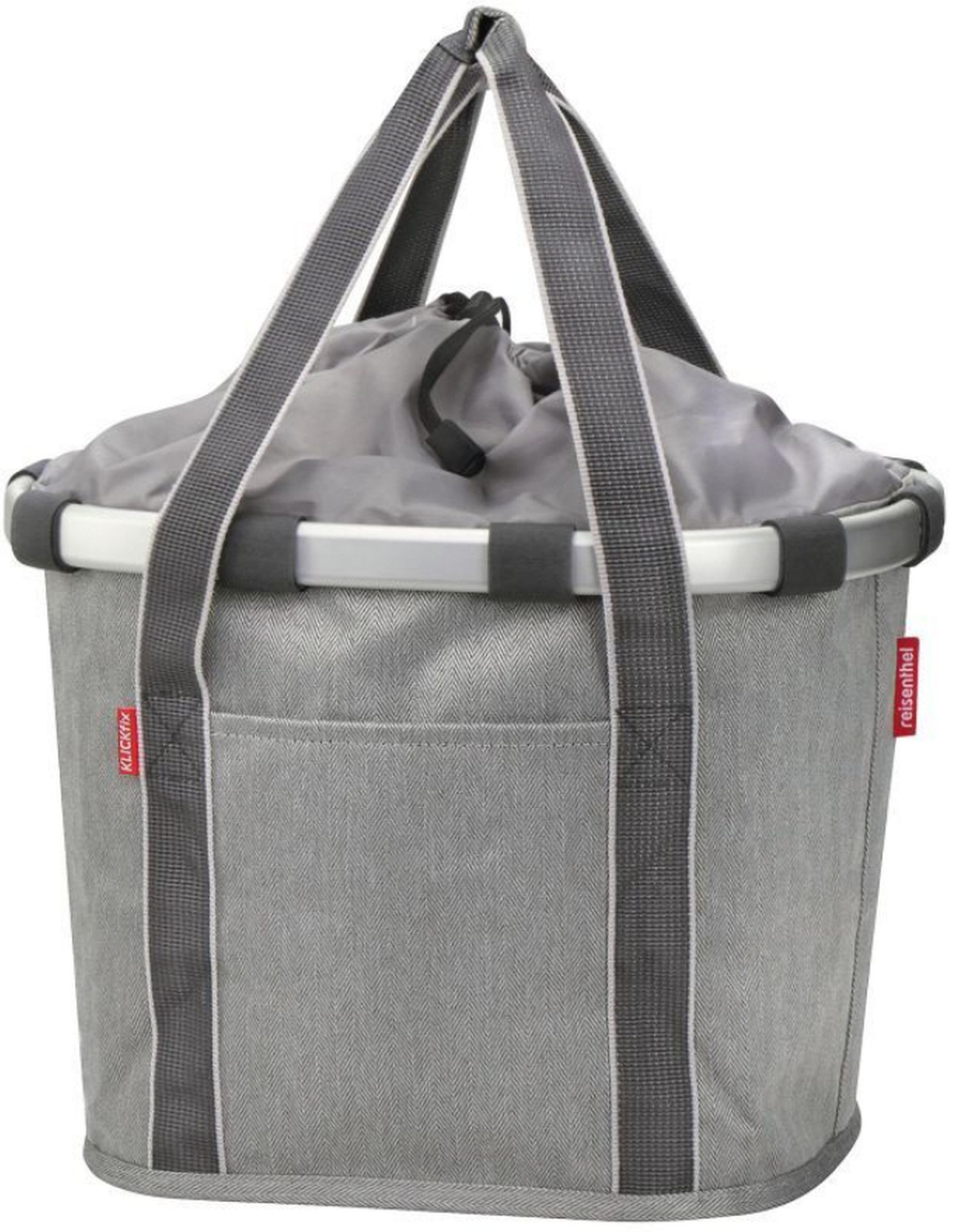 Eine moderne Textiltasche, aus strapazierfähigem Polyester, von Reisenthel, mit Klickfix Kupplung am markanten Aluminiumrahmen. Auch ohne Fahrrad glänzt der Bike Basket in der City und läuft so mancher Handtasche den Rang ab. Er ist ausgestattet mit einer Front- und Innentasche, Handyfach, Kordelverschluss und einem abnehmbaren Utensilientäschchen. Die Innentasche lässt sich mit einem Reißverschluss schließen und öffnen. Sie hat eine Belastbarkeit von maximal 5 kg.