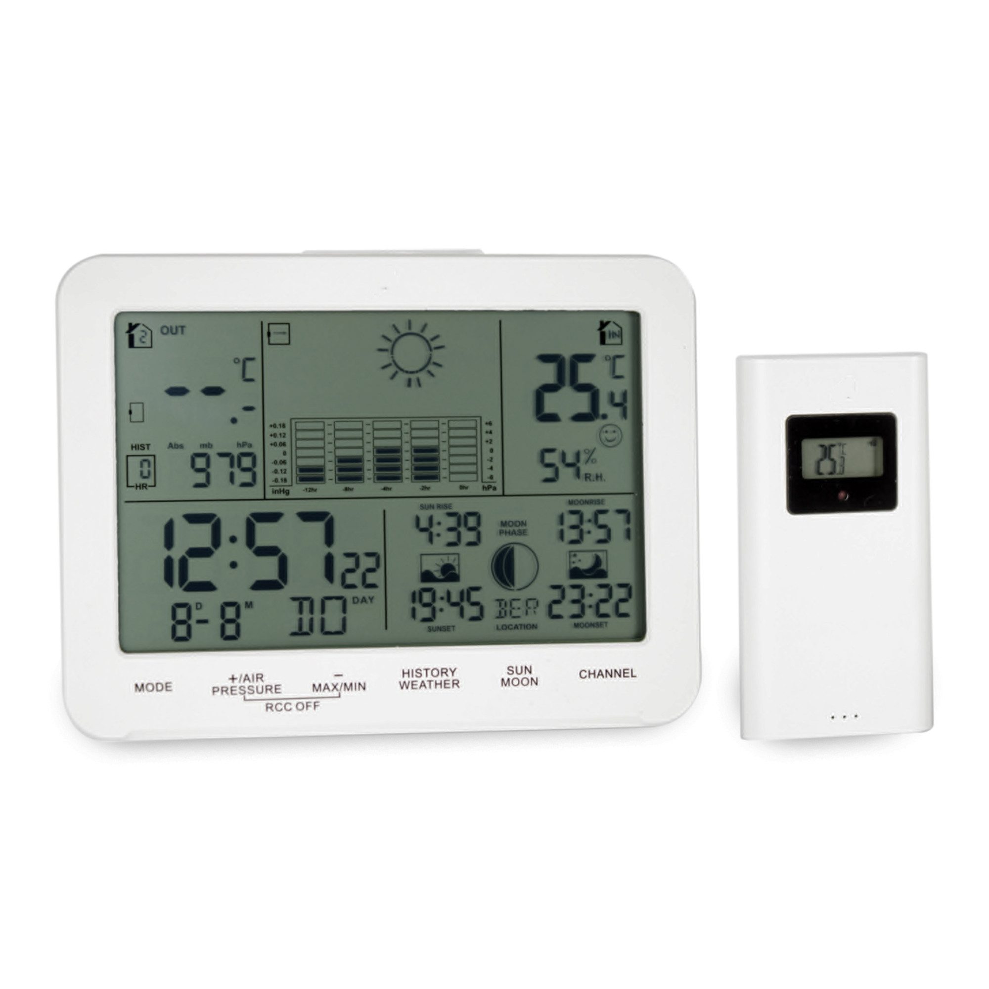 Die Wetterstation verfügt über zwei Alarme, Anzeigen für Sonnen- und Monduntergang sowie Sonnen- und Mondaufgang und eine Mondphasenanzeige.