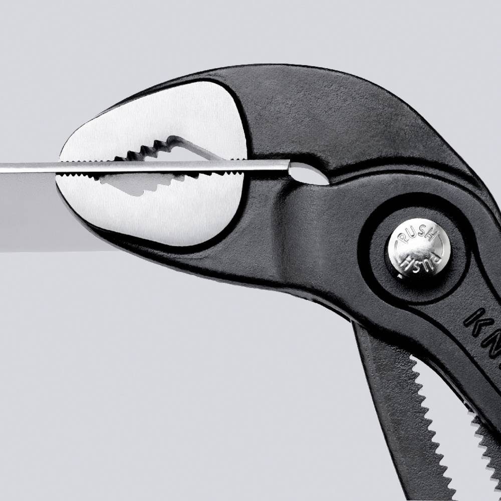 Einstellung per Knopfdruck direkt am Werkstück: schnelle und bequeme Handhabung. Feinverstellung: ermöglicht optimale Anpassung an verschiedenste Werkstückgrößen und handfreundliche Griffstellung. Anzahl Einstellpositionen siehe Tabelle.. Sicheres Einrasten des Gelenkbolzens: keine unbeabsichtigte Verstellung. Durchgestecktes Gelenk: hohe Stabilität durch doppelte Führung. Selbstklemmend an Rohren und Muttern: kein Abrutschen am Werkstück, kraftsparendes Arbeiten. Greifflächen mit spezialgehärteten Zähnen, Härte der Zähne ca. 61 HRC: dauerhaft sicheres Greifen durch hohe Verschleißfestigkeit. Einhandverstellung. Klemmschutz verhindert Quetschverletzungen. Günstige Hebelwirkung: optimale Kraftübertragung. Chrom-Vanadin-Elektrostahl, geschmiedet, mehrstufig ölgehärtet.