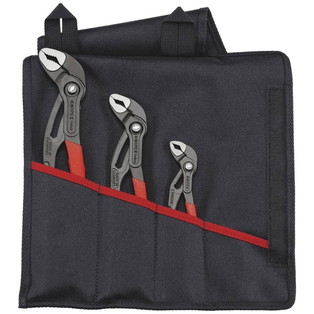 ● Die KNIPEX Cobra® ist die legendäre Hightech-Wasserpumpenzange aus dem Hause KNIPEX ● Mit ihrem enorm festen Selbstklemmeffekt ermöglicht sie kraftsparendes Arbeiten ohne Abrutschen am Werkstück ● Jetzt als Set in verschiedenen Größen erhältlich in unseren langlebigen Rolltaschen mit passender Motivbestickung ● Die Sets enthalten jeweils drei unterschiedlich große Hightech-Wasserpumpenzangen mit schlanken, kunststoffüberzogenen Griffen ● Sie überzeugen durch ihren enorm festen Selbstklemmeffekt und die geniale Feineinstellung per Druckknopf.