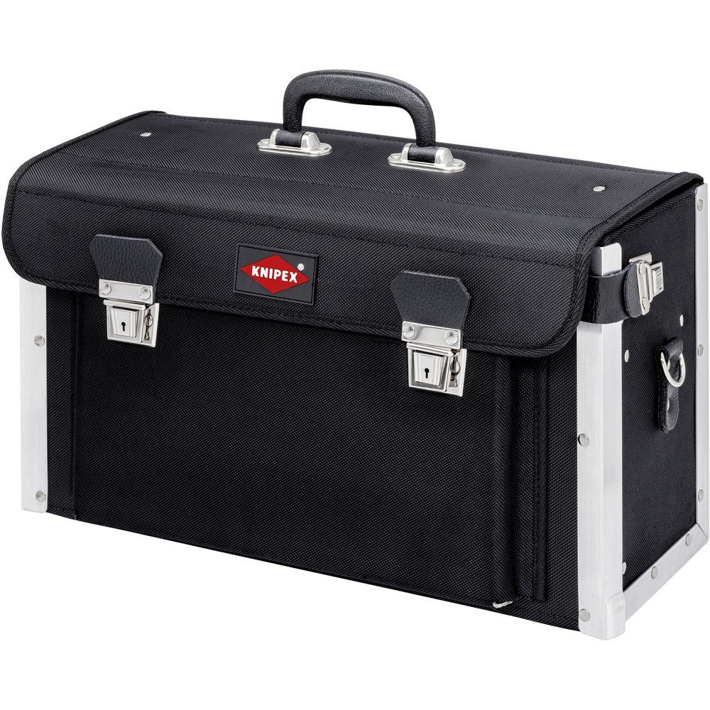 ohne Werkzeug Werkzeugtasche mit Seitenwänden und Bodenschale aus doppelwandigem, feuchtigkeitsresistentem, schwarzem HDPE-Kunststoff. Vorderwand, Rückwand und Deckel aus Rindleder, schwarz. Vorderwand zusätzlich mit Aluminiumwinkeln verstärkt. Vorderwand teilweise aufklappbar mit verstellbaren Schlaufen und Dokumentenfach auf der Außenseite. Rückwand mit einem gespritzten Kunststoff-Schlaufenhalter mit elf Schlaufen. Tragegriff. Abmessungen, innen (B x H x T): 420 x 250 x 160 mm. Leichte Ausführung aus strapazierfähigem, verstärktem Polyester-Gewebe. Mit verzinkter Bodenschale. Mit Tragegriff und verstellbarem Schultergurt