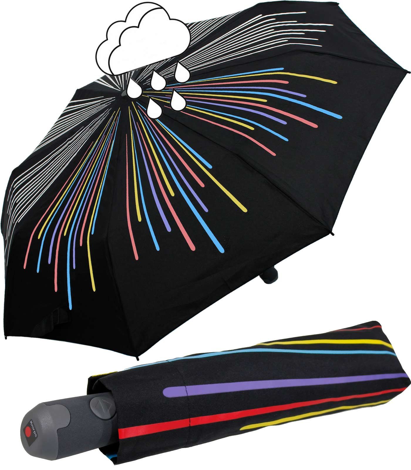 Wenn Sie einen besonderen Regenschirm suchen, dann ist dieser Wet Print Taschenschirm von Knirps bestimmt das Richtige. Das weiße Muster auf dem schwarzen Schirmdach färbt sich bei Nässe zu auffällig bunten Farben. Trocknet der Schirm, wird es wieder weiß. Mit solch einem Schirm freut man sich schon auf den nächsten Regen. Die Farbe des Schirmdaches ist schwarz-weiß, bei Nässe schwarz-bunt, das verwendete Material besteht aus 100% Polyester. Klein und leicht wiegt der Schirm nur ca. 335 Gramm. Geöffnet ist das Schirmdach 96 cm groß. Geschlossen misst der Regenschirm 29 cm. Der Taschenschirm überzeugt mit einer leicht zu handhabenden Auf-Zu-Automatik, einer hochwertigen Verarbeitung und einem komfortablen Griff mit samtartiger Oberfläche. Das ausreichend große 8-teilige Dach bietet guten Schutz gegen jede Witterung und hält dank seines sehr robusten Stahlstocks und Fiberglas in den Speichen dem Wind problemlos stand.