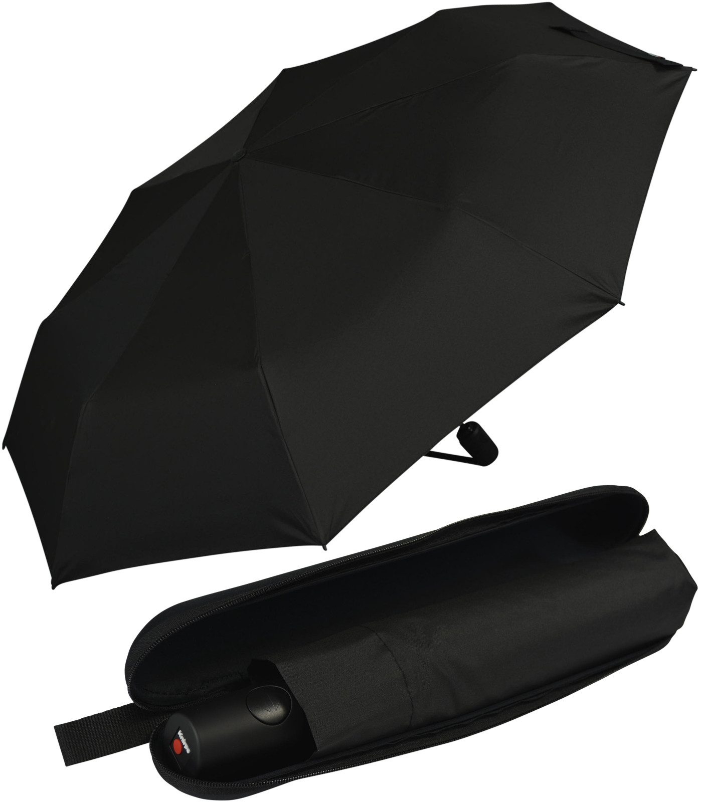 Dieser Taschenschirm besitzt ein großes Dach bei kompakten Maßen im geschlossenem Zustand. Seine Auf-Zu-Automatik macht die Bedienung auch mit einer freien Hand sehr bequem.