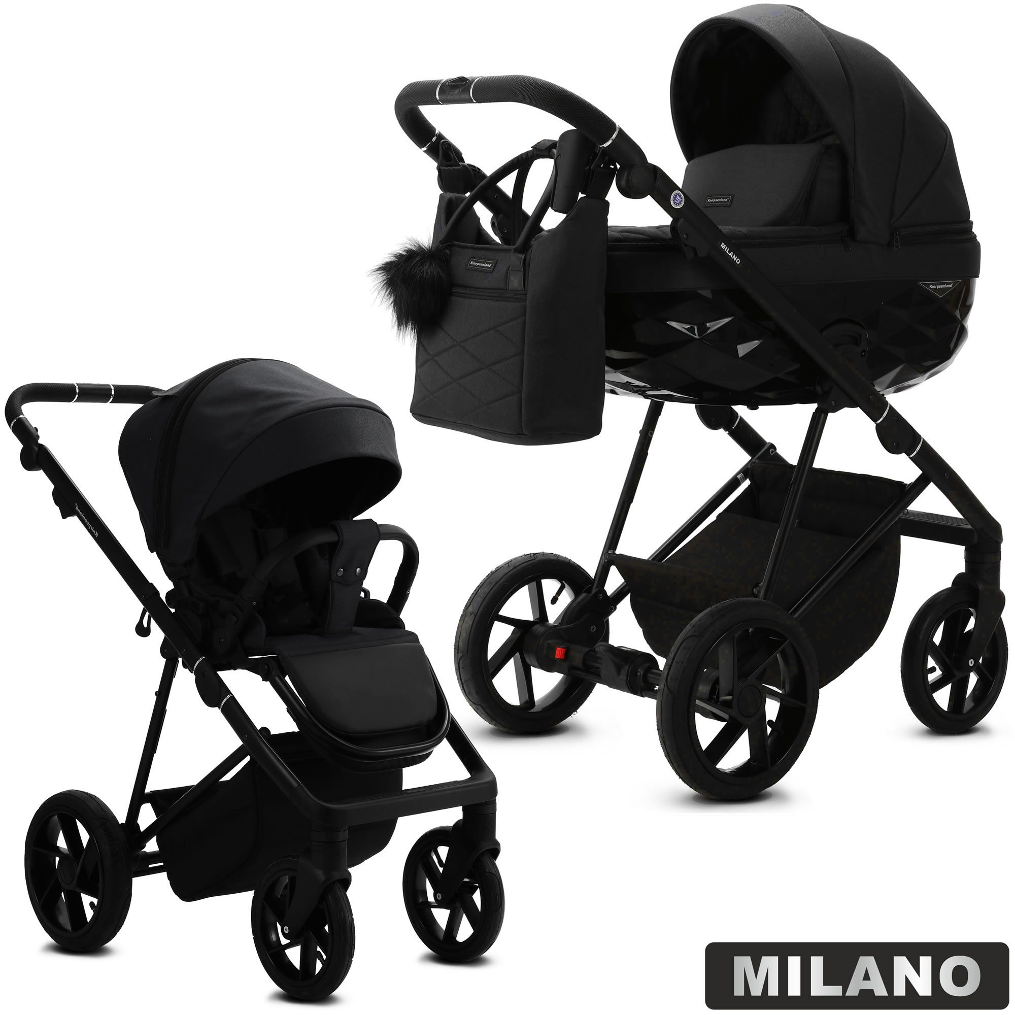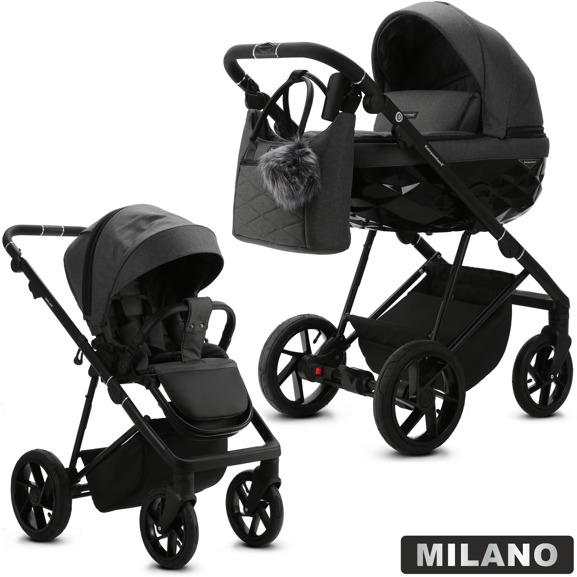 Modern, schlicht und komfortabel ist das Modell Milano von Knirpsenland. Eine große, bequeme, dreidimensionale Babywanne kombiniert mit einem schwarzen Alu Gestell sind die perfekte Kombination für Fans zeitlosen Designs. Stilvoll ergänzt wird der Alltag durch den mitgelieferten Sportwagenaufsatz, der in beide Richtungen auf dem Gestell montiert werden kann. Das Beste ist, Sie können ihn mit dem Gestell zusammenklappen. Entdecken Sie die perfekte Harmonie aus Funktionalität, Stil und Design mit dem Kinderwagen Milano von Knirpsenland. Ausgestattet mit einer belüfteten Babywanne und einem verstellbaren Sportwagenaufsatz mit hochwertigen Bezügen bietet der Kinderwagen nicht nur Komfort für den kleinen Reisenden, sondern auch Benutzerfreundlichkeit für die Eltern. Wir liefern Ihnen das Rundum Sorglos Paket mit praktischen Zubehör wie einer Wickeltasche, ein Insektenschutz, Regenschutz und ein Paar Kinderwagenhandschuhen was den täglichen Spaziergang noch angenehmer macht. Das Modell Milano ist nicht nur ein Kinderwagen – er ist viel mehr ein stilvoller, ergonomischer und sicherer Begleiter, angepasst an die Bedürfnisse der modernen Familie von heute. Entdecke den komfortablen und absolut luxuriösen Premium Kinderwagen „Milano“ aus dem Hause Knirpsenland welcher für besondere Momente geschaffen wurde. Bei dem Modell Milano handelt es sich um einen eleganten und zugleich komfortablen Kinderwagen, der durch schöne Details und durchdachte Funktionen, viele frischgebackene Mamas tagtäglich überzeugt. Der brandneue Milano Kinderwagen wurde für das moderne Leben entwickelt und bietet Ihnen und Ihrem Kind all die Flexibilität und den luxuriösen Komfort, den Sie sich wünschen. Details: - Der Sitz des Kinderwagens kann in Fahrtrichtung oder entgegen der Fahrtrichtung angebracht werden - hohe Sicherheit durch One-Klick System der Kinderwagenaufsätze - mit 360° wendigen / feststellbaren Schwenkrädern - Verdeck mit Sicht und Belüftungsöffnung für erstklassigen Luftaustausch - Inkl. eleganter Wickeltasche, welche direkt am Gestell befestigt oder als Umhängetasche genutzt werden kann - Moderne Gestell Optik mit Alu-Rahmen - Geländetauglichkeit: ja, auch für Schotterwege und Feldwege bestens geeignet - Federung: Ja, alle 4 Räder sind extra gefedert - Feststellbremse: SAFE STOP Fußbremse zum Feststellen - Anzahl der Räder: 4 Räder - Art der Räder: Lufträder - Vorderräder: abnehmbar, 360° schwenkbar / feststellbar - Hinterräder: abnehmbar - nach der europäischen Sicherheitsnorm DIN EN 1888 gefertigt - Textilien sind Schadstoffgeprüft und umweltfreundlich hergestellt - Verwendung als 3in1 Travelsystem (mit Autoschale) möglich Babywanne: - Extra leicht, mit einzigartigen dreidimensionalen Muster in Hochglanz - innovative Thermoregulierung sorgt für optimale Belüftung und Schlafkomfort - große und geräumige Liegefläche - klappbares Verdeck mit integriertem Lüftungsfenster samt Moskitonetz und Sonnenblende - Abdeckung mit Sichtfenster lässt sich zusätzlich aufstellen für Schutz vor Sonne und Wind - von außen höhenverstellbares Kopfteil - inkl. weicher Matratze, Insekten und Regenschutz, Fußabdeckung - Maße der Liegefläche (LxB): 70 x 35 cm - Altersempfehlung: 0 bis 6-8 Monate (9kg) - Gewicht Babywanne: ca. 4,8 kg Sportwagenaufsatz: - abnehmbares Verdeck mit Belüftungsöffnung - das Gestell kann samt dem Sportwagenaufsatz zusammengelegt werden - 3-fachverstellbare Rückenlehne von Liege bis in die Sitzposition - Fußstütze 4-fach höhenverstellbar - Abnehmbarer Sicherheitsbügel aus hochwertigen Eco Leder für leichteres Ein- und Aussteigen - Gepolsterter 5-Punkt-Sicherheitsgurt - Altersempfehlung: ab ca. 6 Monaten bis 3 Jahre (15kg) - Liegefläche: 85 cm x 32 cm - Длина der Rückenlehne: 48 cm - Maße der Sitzfläche (L/B): 25 x 32 cm - Gewicht: ca. 3,2 kg Maße & Gewicht: - Schiebehöhe verstellbar: 80 – 112 cm - Radgröße vorne/hinten: 24,5cm (10 Zoll) / 29,5cm(12 Zoll) - Maße Kinderwagens aufgebaut (L/B/H): 101 x 57,5 x 119 cm - Maße zusammengeklappt Gestell mit Rädern (L/B/H): 81 x 57,5 x 39 cm - Höhe der Liege / Sitzfläche vom Boden aus: 61 cm - Gewicht Kinderwagen: 14,7 kg - Gewicht Sportwagen: 13,1 kg - Gewicht Gestell: 9,9 kg Material & Pflege: - modernste Stoffe und Materialien - UPF50+ Filter - wasserfestem Material (Water Proof) - Innenmaterial Babywanne: 100% Baumwolle - Bezug: 100% Polyester - Gestell: Aluminium - Handwäsche bei 30 Grad