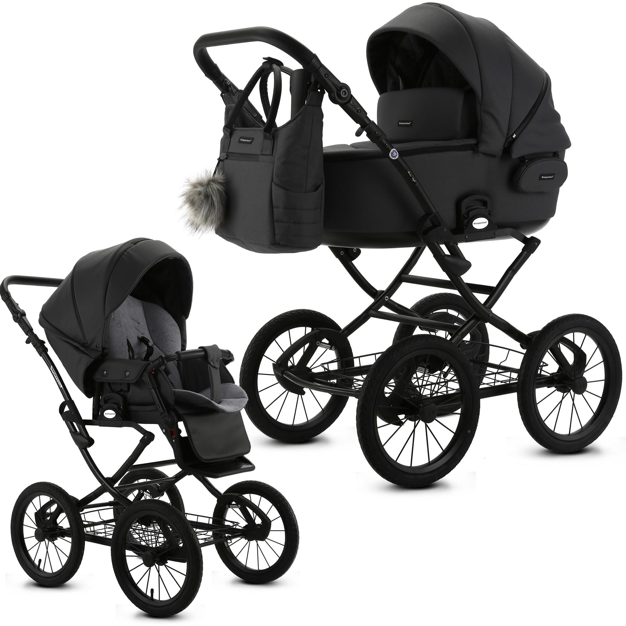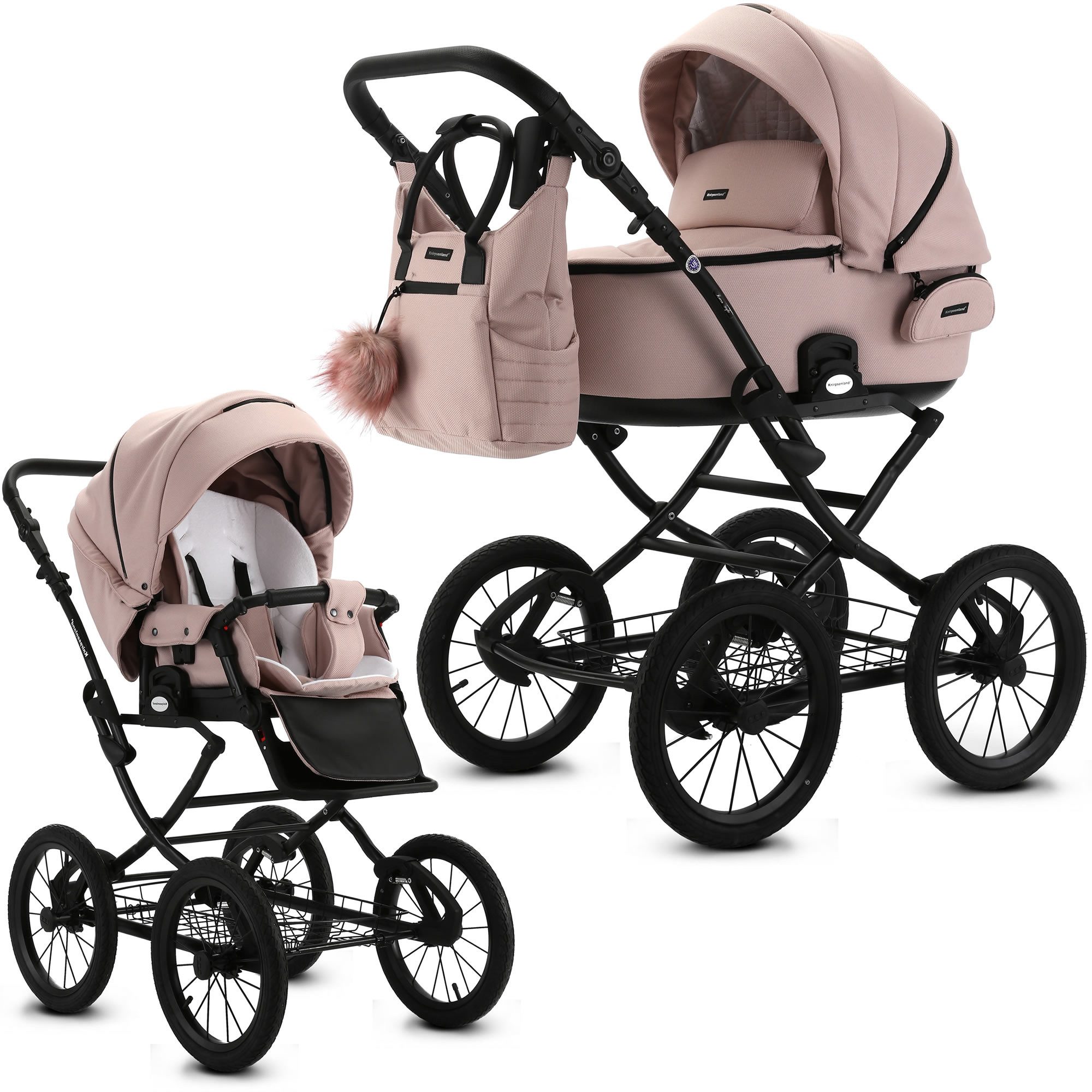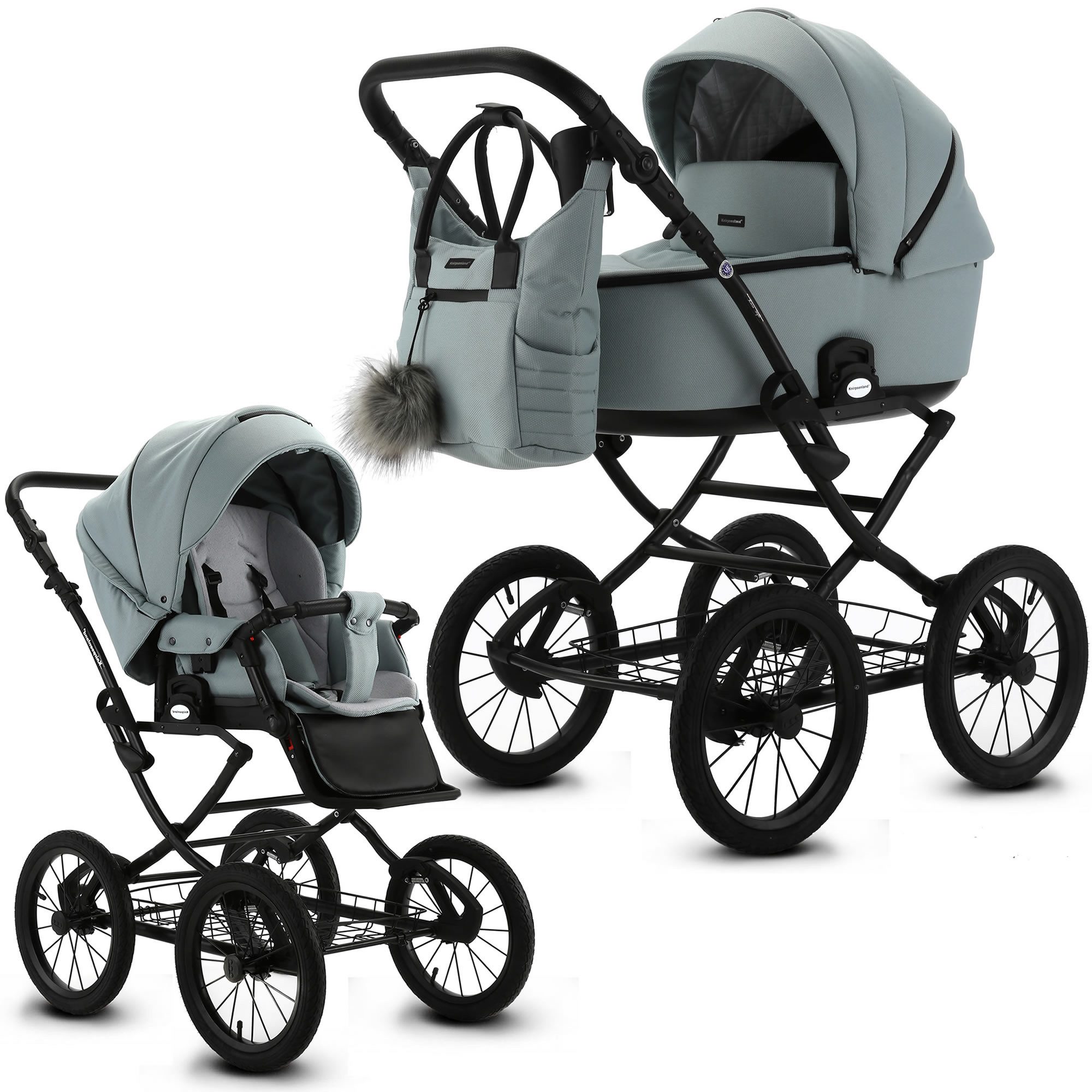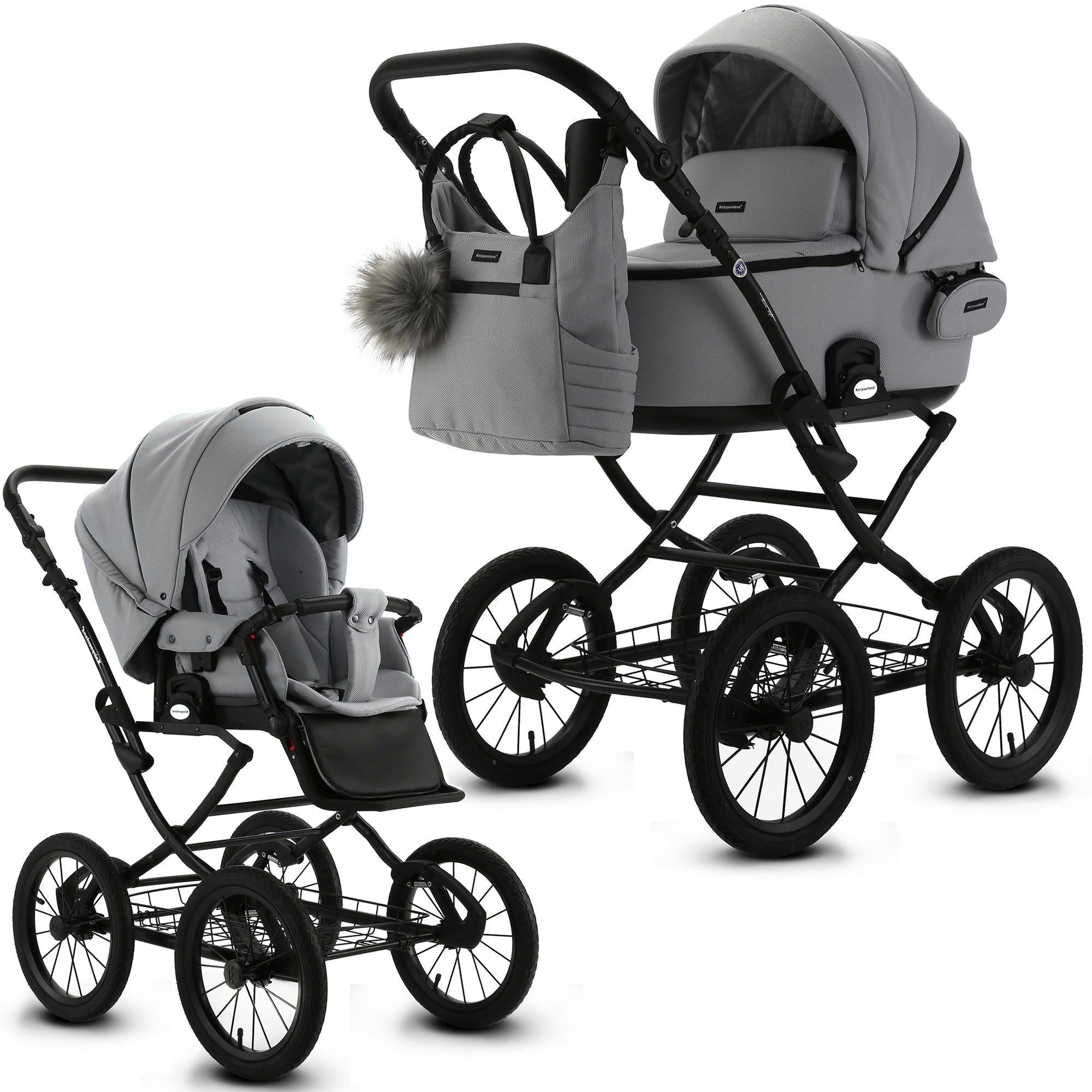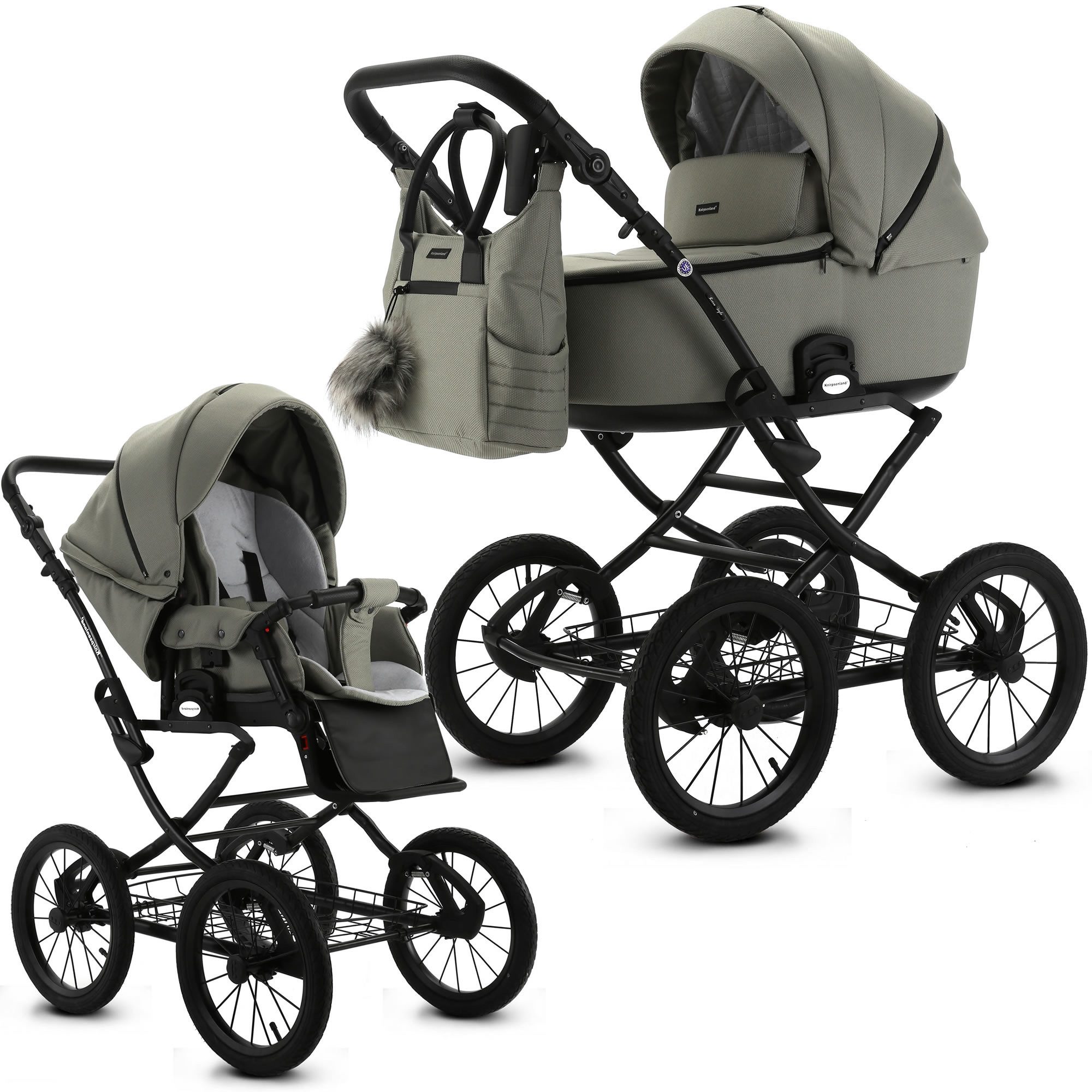 Entdecken Sie den neuen Knirpsenland Retro Style 2.0 Kinderwagen In neun wunderschönen Trendfarben. Willkommen in der Welt des stilvollen und praktischen Reisens mit Ihrem kleinen Schatz! Unser neuer Retro Style 2.0 Kinderwagen im 2 in 1 Set – selbstverständlich auch optional als 3 in 1 Set mit Babyschale erhältlich – vereint klassisches Design mit modernen Funktionen, um Ihnen und Ihrem Baby ein unvergessliches Erlebnis beim Entdecken der Welt zu bieten. Dieser Luxus-Kinderwagen wurde speziell entwickelt, um Ihr Leben zu erleichtern. Mit seinem hochwertigen Gestell im robusten X-Design und den 14 Zoll Lufträdern meistert er mühelos alle Wege – sei es auf dem Gehweg oder im Park. Die sanfte Federung wiegt Ihr Kind behutsam in den Schlaf, während Sie entspannend die Umgebung erkunden. Dank unseres praktischen One Click Systems lassen sich die Babywanne, der Sportsitz und die Autoschale schnell und sicher mit dem Gestell verbinden. Sie entscheiden selbst über die Fahrtrichtung und können den mehrfach verstellbaren Schieber aus hochwertigem Eco-Leder individuell anpassen, sodass Sie immer optimalen Komfort genießen. Besonders hervorzuheben ist die SAFE STOP Fußbremse, die ein einfaches Feststellen des Kinderwagens ermöglicht. Die abnehmbaren Lufträder erleichtern den Transport und bieten zusätzliche Flexibilität. Um das Gesamtbild perfekt abzurunden, liefern wir Ihnen eine elegante Wickeltasche im passenden Design, die Platz für alle wichtigen Utensilien bietet. Darüber hinaus sorgen der mitgelieferte Regenschutz, der Insektenschutz sowie die Kinderwagenhandschuhe dafür, dass Sie jederzeit gut auf alles vorbereitet sind. Der Knirpsenland Retro Style 2.0 Kinderwagen entspricht höchsten Sicherheitsstandards. Er erfüllt die aktuellen Vorgaben der europäischen Sicherheitsnormen und wird durch stetige Qualitätskontrollen überwacht. Textilien sind Schadstoffgeprüft und umweltfreundlich hergestellt. Erleben Sie mit dem Knirpsenland Retro Style 2.0 Kinderwagen die perfekte Kombination aus Stil, Komfort und Sicherheit für Sie und Ihr Baby. Machen Sie jeden Ausflug zu einem besonderen Erlebnis! Details: - hohe Sicherheit durch One-Klick System der Kinderwagenaufsätze - Verdeck mit Sicht und Belüftungsöffnung für erstklassigen Luftaustausch - Der Sitz des Kinderwagens kann in Fahrtrichtung oder entgegen der Fahrtrichtung angebracht werden - Inkl. eleganter Wickeltasche, welche direkt am Gestell befestigt oder als Umhängetasche genutzt werden kann - Klassische Gestell Optik mit robusten Metall-Rahmen - Geländetauglichkeit: ja, auch für Schotterwege und Feldwege bestens geeignet - Federung: Ja, alle 4 Räder sind extra gefedert - Feststellbremse: SAFE STOP Fußbremse zum Feststellen - Anzahl der Räder: 4 Räder - Art der Räder: Lufträder - Räder: abnehmbar - nach der europäischen Sicherheitsnorm DIN EN 1888 gefertigt - Textilien sind Schadstoffgeprüft und umweltfreundlich hergestellt werden - Verwendung als 3in1 Travelsystem (mit Autoschale) möglich Babywanne: - große und geräumige Liegefläche - innovative Thermoregulierung sorgt für optimale Belüftung und Schlafkomfort - klappbares Verdeck mit integriertem Lüftungsfenster samt Moskitonetz und Sonnenblende - Abdeckung mit Sichtfenster lässt sich zusätzlich aufstellen für Schutz vor Sonne und Wind - von außen höhenverstellbares Kopfteil - inkl. weicher Matratze, Insekten und Regenschutz, Fußabdeckung - Maße der Liegefläche (LxB): 80 x 37 cm - Altersempfehlung: 0 bis 6-8 Monate (9kg) - Gewicht Babywanne: ca. 5,2 kg Sportwagenaufsatz: - extra großer, flexibler Sportsitz mit einstellbarer Sitz- und Liegeposition - Inkl. weichere Sitzeinlage - abnehmbares Verdeck mit Belüftungsöffnung - 4-fachverstellbare Rückenlehne von Liege bis in die Sitzposition - Fußstütze 4-fach höhenverstellbar - Abnehmbarer Sicherheitsbügel aus hochwertigen Eco Leder für leichteres Ein- und Aussteigen - Gepolsterter 5-Punkt-Sicherheitsgurt - Altersempfehlung: ab ca. 6 Monaten bis 3 Jahre (15kg) - Liegefläche: 87 cm x 35 cm - Длина der Rückenlehne: 48 cm - Gewicht in kg: 4,8 kg Maße & Gewicht: - Schiebehöhe verstellbar: 78 – 115 cm - Radgröße vorne/hinten: 37cm (14 Zoll) - Maße Kinderwagens aufgebaut: (L/B/H): 107 x 60 x 122 c - Maße zusammengeklappt Gestell mit Rädern: (L/B/H): 81 x 57,5 x 39 cm - Maße zusammengeklappt ohne Räder (L/B/H): 84 x 60 x 26 cm - Höhe der Liege / Sitzfläche vom Boden aus: 60 cm - Gewicht Kinderwagen: 16,6 kg - Gewicht Sportwagen: 16,2 kg - Gewicht Gestell: 11,4 kg Material & Pflege: - modernste Stoffe und Materialien - UPF50+ Filter - wasserfestem Material (Water Proof) - Innenmaterial Babywanne: 100% Baumwolle - Bezug: 100% Polyester - Gestell: Metall - Handwäsche bei 30 Grad