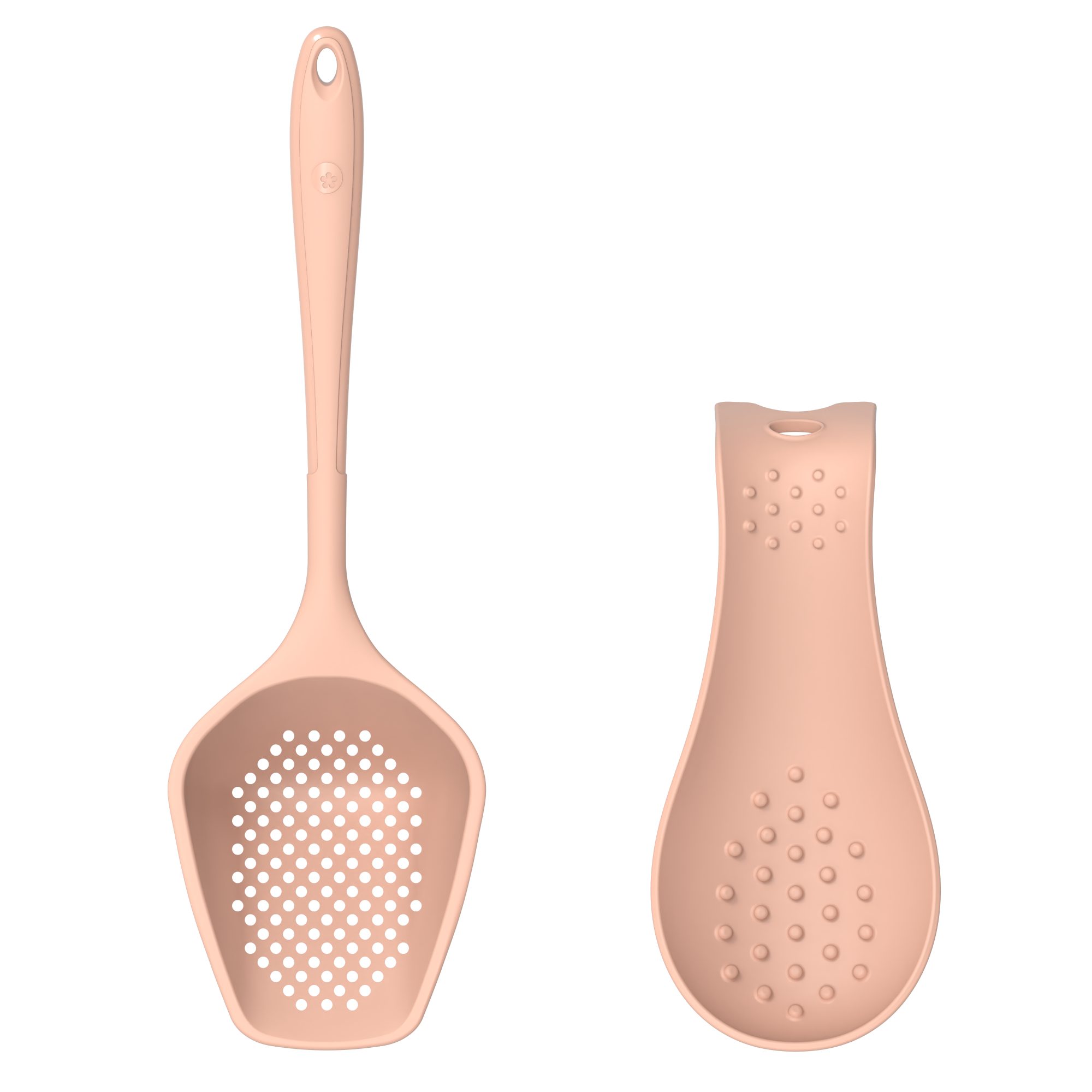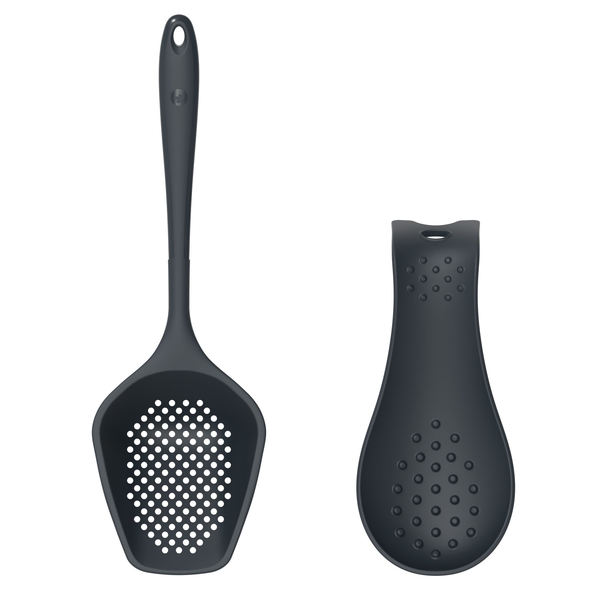 WEICHE SCHALE HARTER KERN: Durch den festen Edelstahlkern bleibt die Siebschaufel formstabil, während die Ummantelung aus Silikon die Oberfläche schützt.