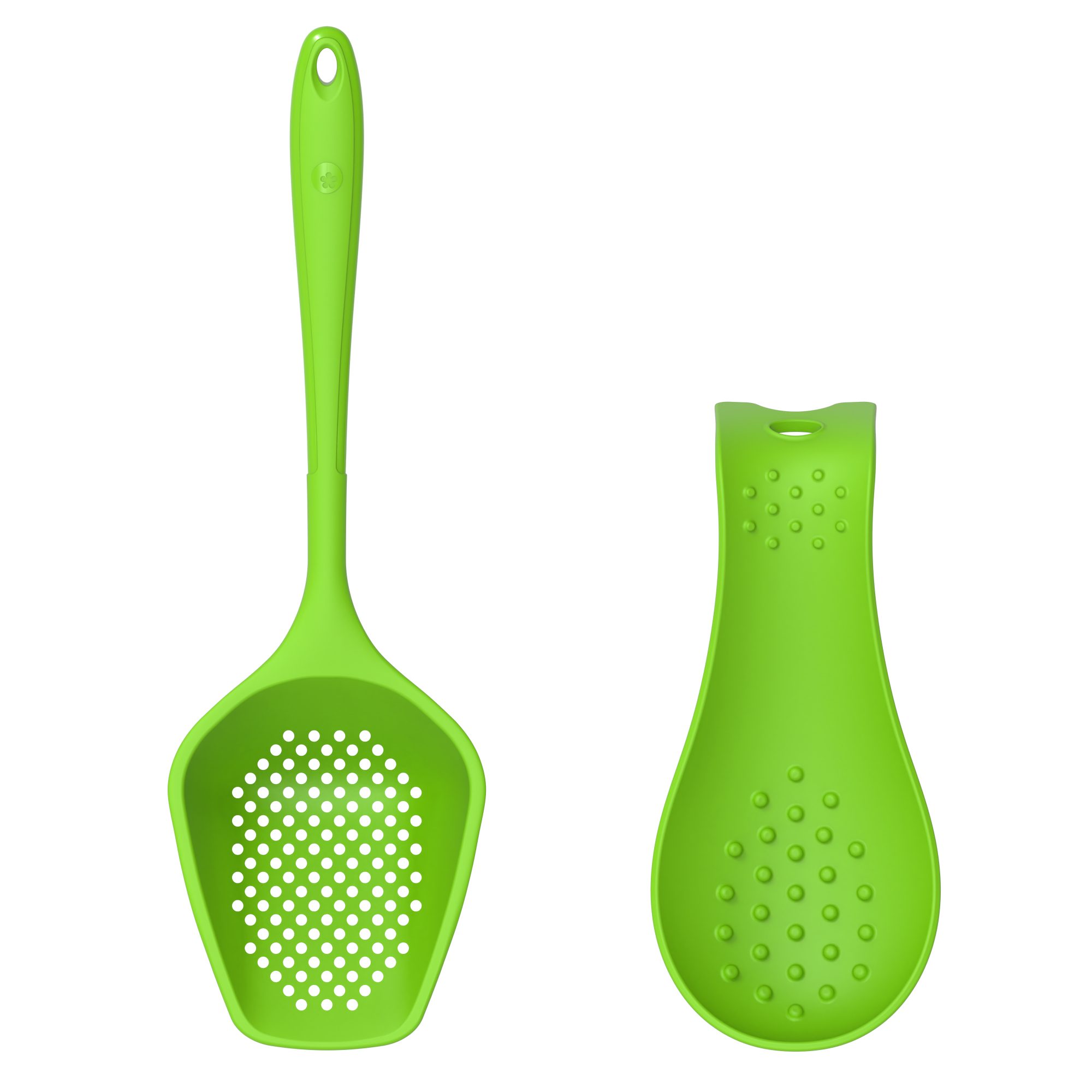 Die Löffelablage ist der ideale Helfer, wenn es um saubere Arbeitsflächen geht. Schmutziges oder fettiges Küchenzubehör kannst Du ganz einfach darauf ablegen und bei Bedarf wieder verwenden. Lebensmittelechtes Silikon und BPA-frei Hitzebeständigkeit bis 260°C Spülmaschinenfest Edelstahlkern Schont die Oberfläche von Töpfen, Pfannen und Schüsseln 2er Set