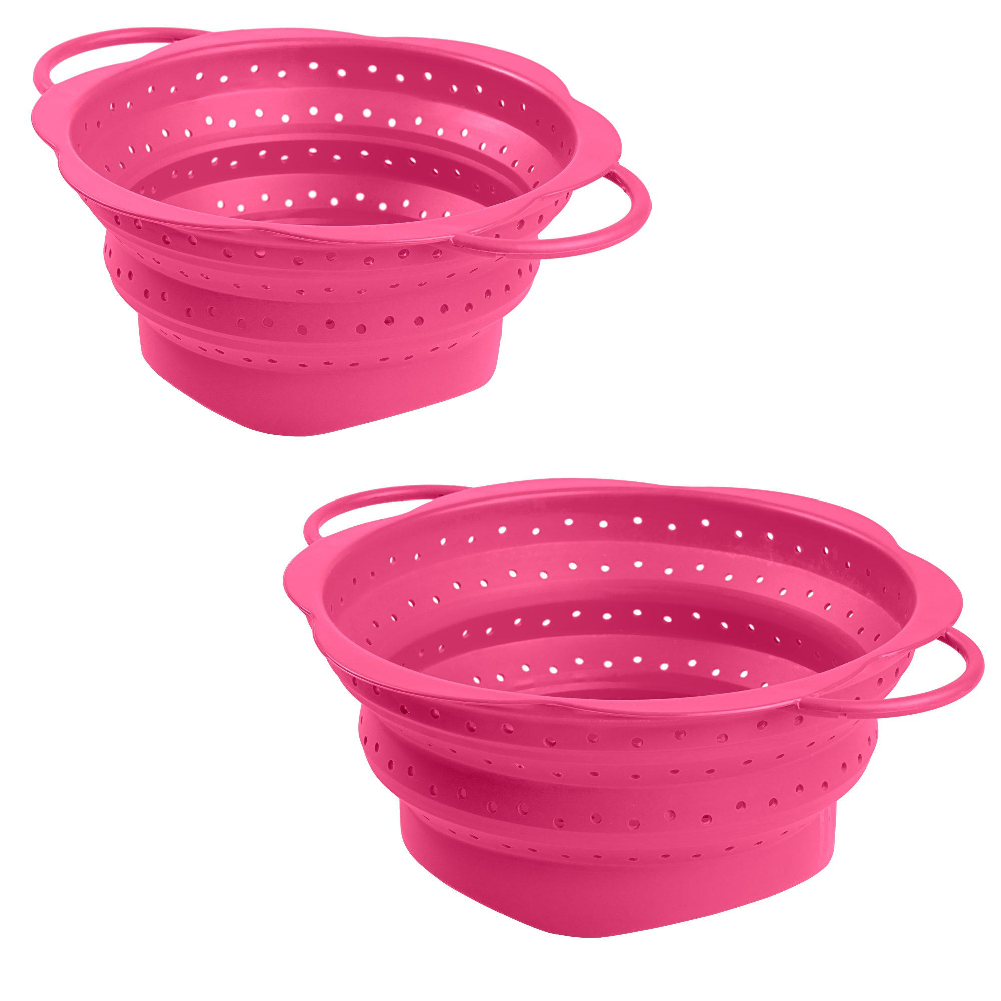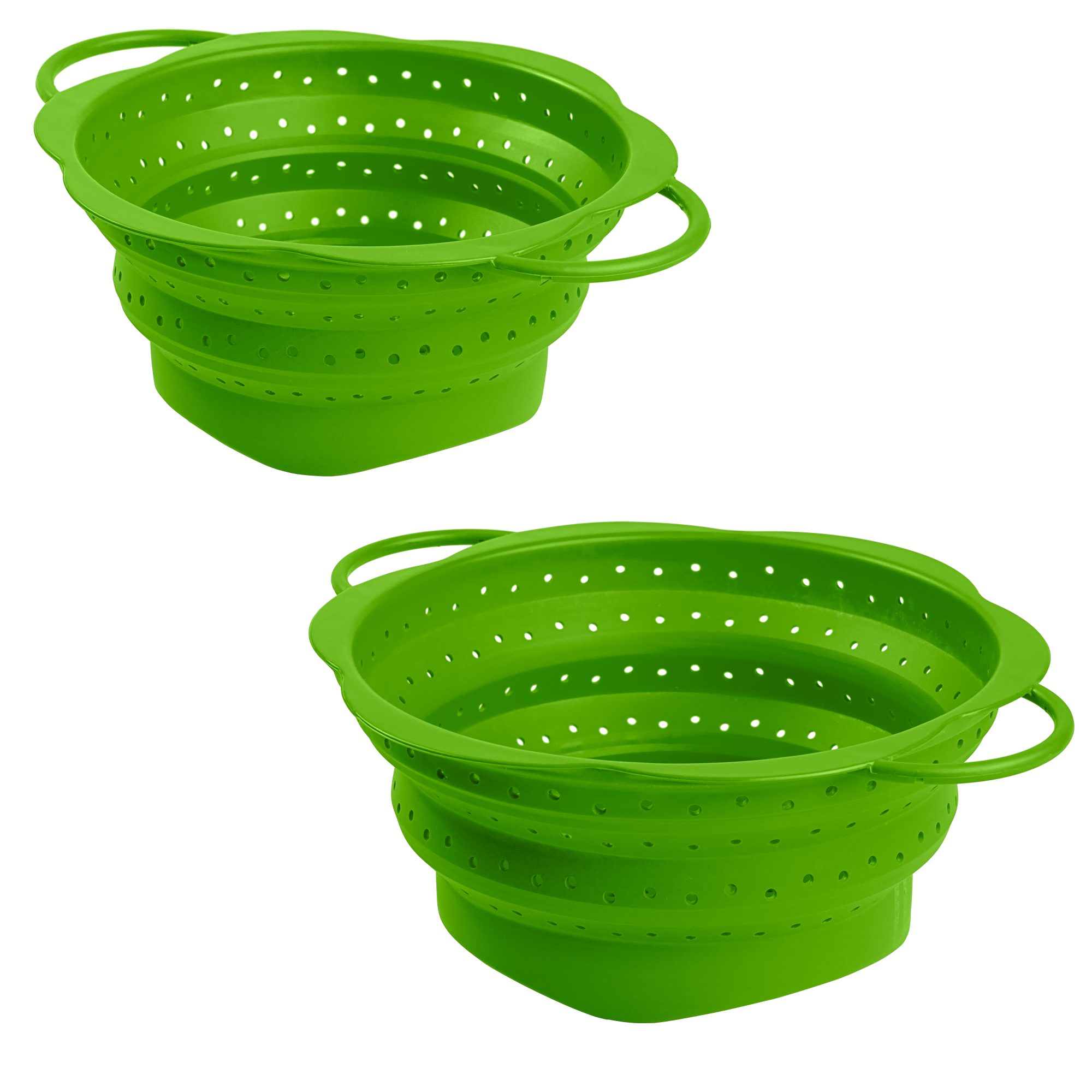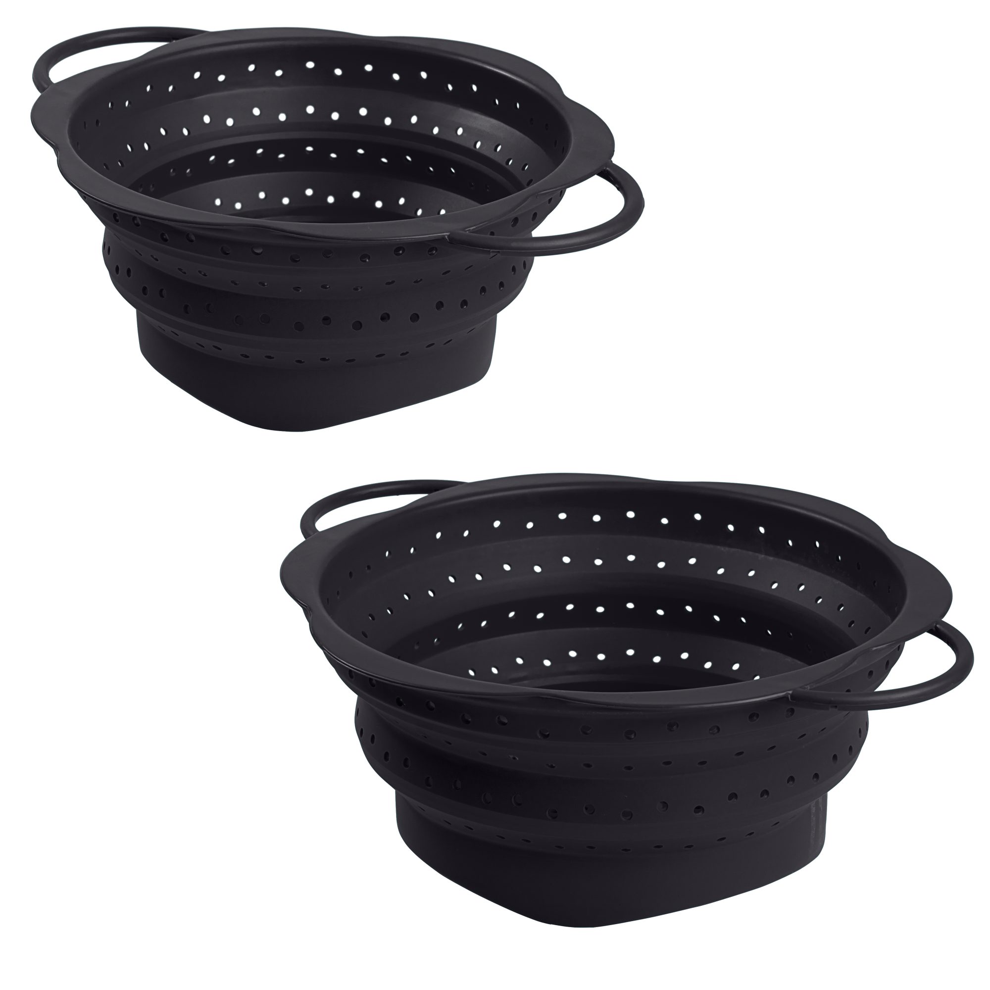 WEICHE SCHALE HARTER KERN: Das Faltsieb mit Edelstahlkern in Rand und Griffen ist ideal zum Einhängen in Töpfe und effizientes Abtropfen von Lebensmitteln.