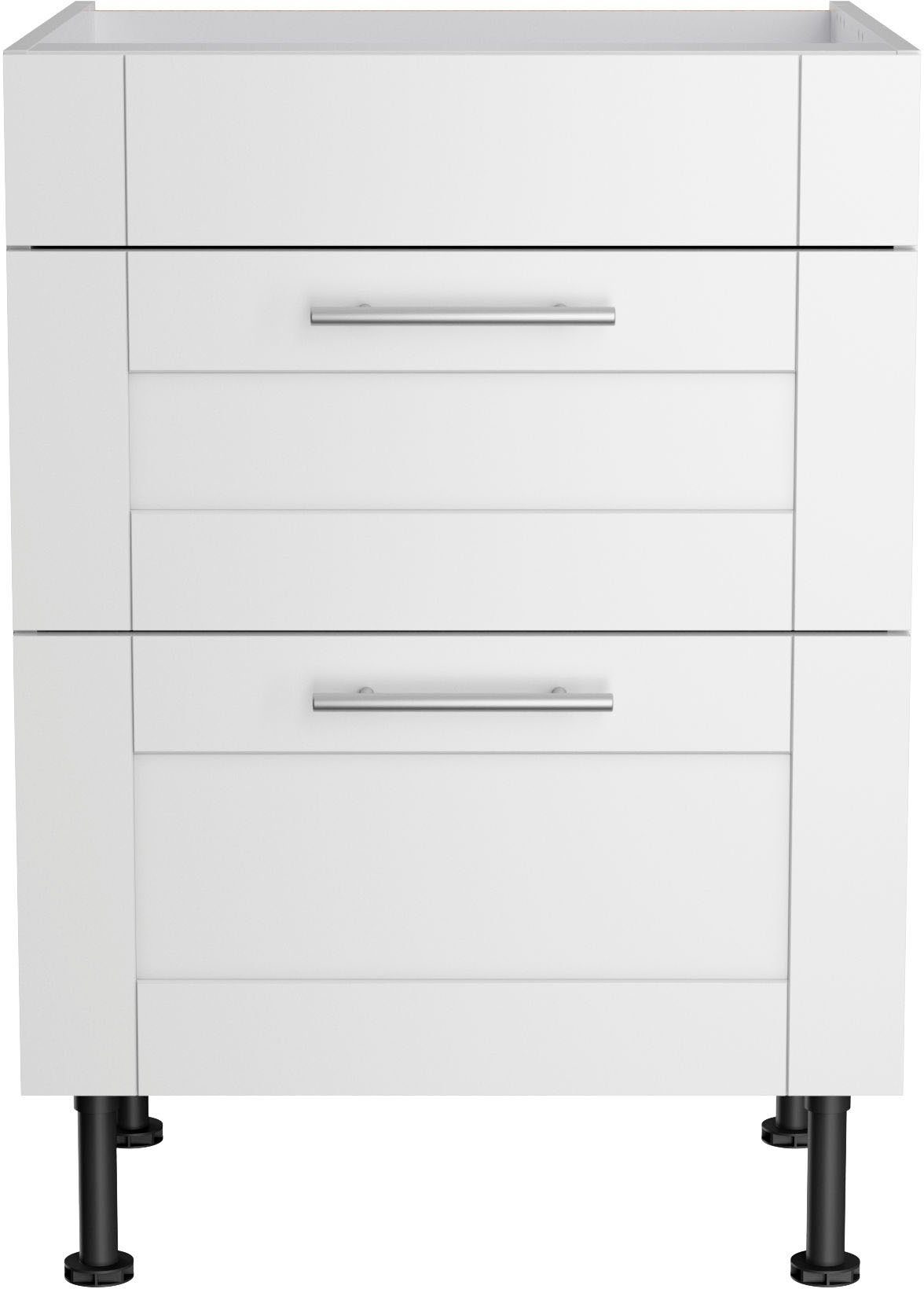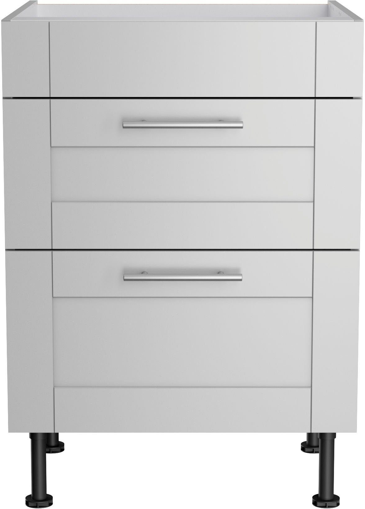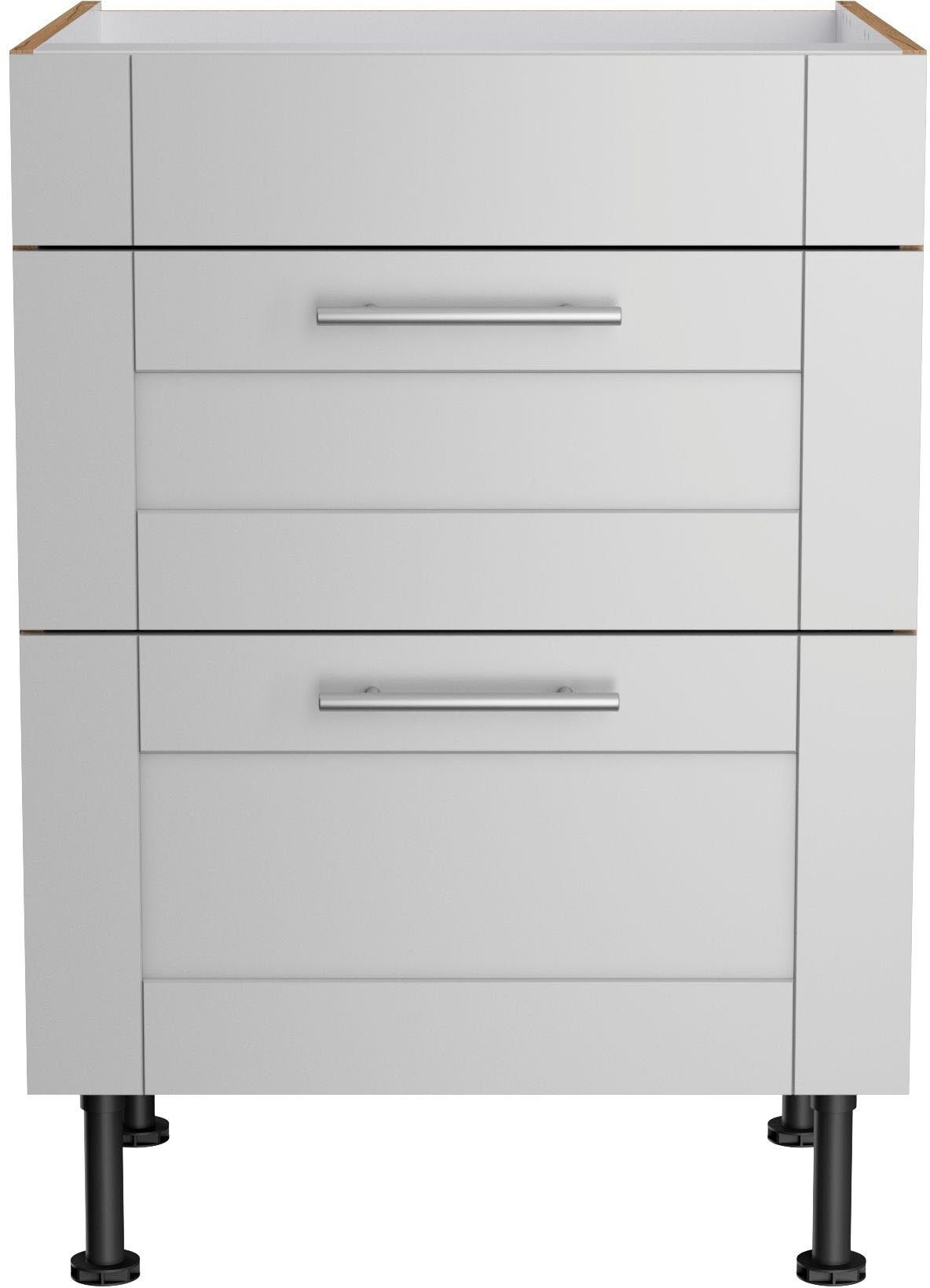 Mit diesem Kochfeldumbauschrank »KS-Ahus« von KOCHSTATION ist das Kochfeld optimal auf die anderen Elemente deiner Küche abgestimmt. Die Schubladen lassen sich komplett ausziehen und bieten dir weitere Unterbringungsmöglichkeiten. Mit den höhenverstellbaren Füßen kannst du die Schrankhöhe flexibel anpassen, um sie beispielsweise anderen Möbeln anzugleichen.