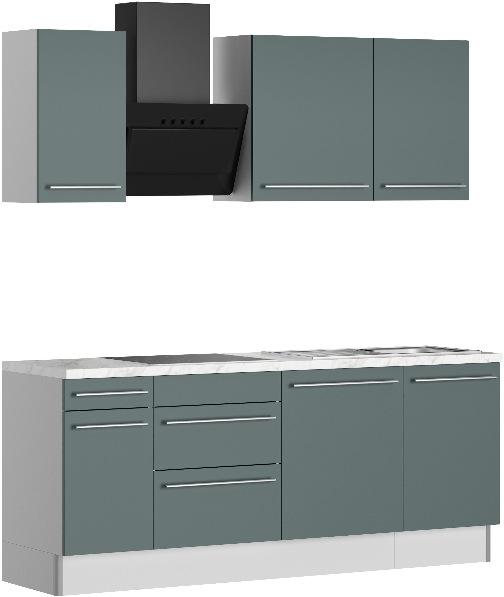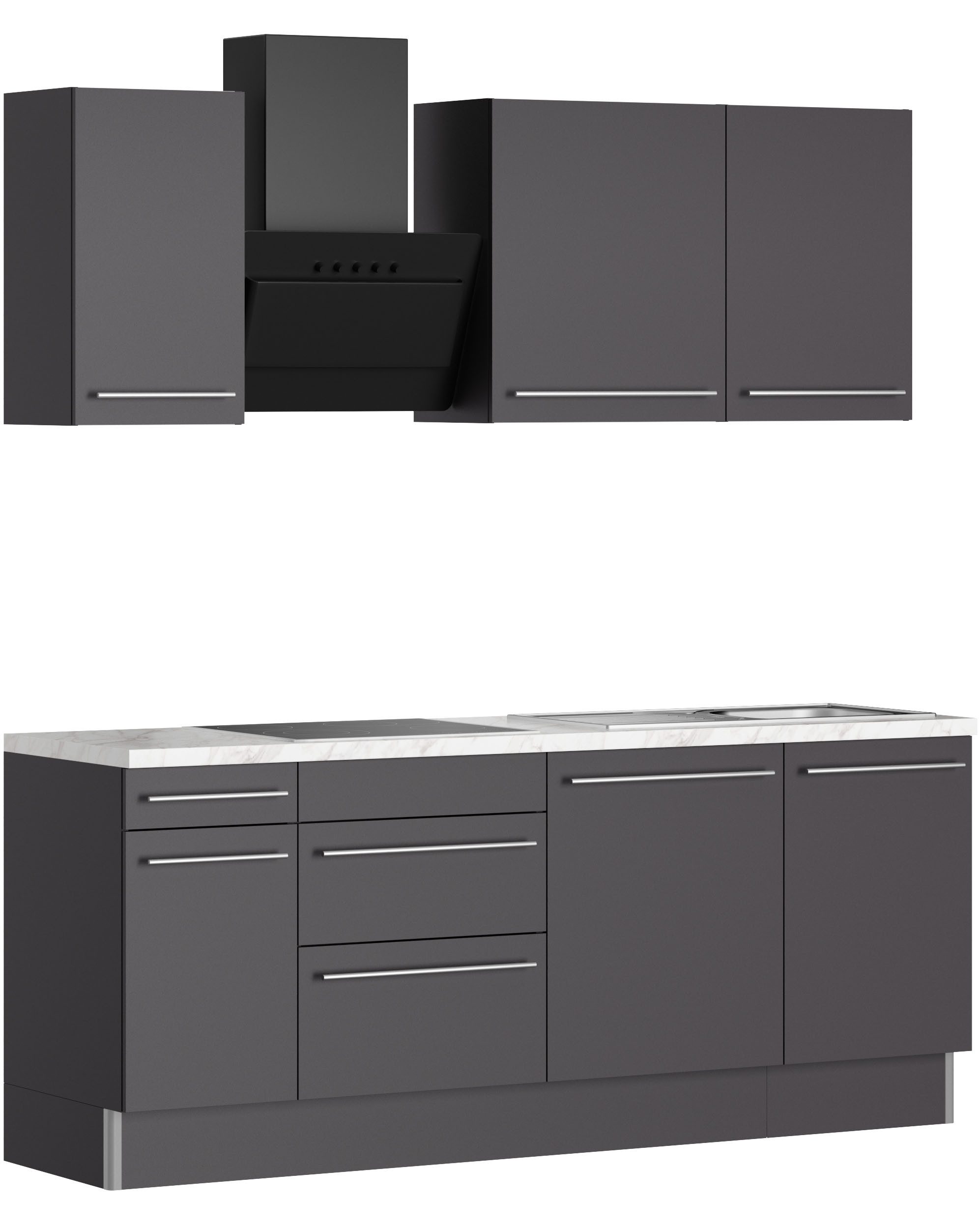 Ausstattung | Durchgehende Arbeitsplatte Einlegeböden höhenverstellbar Höhenverstellbare Füße Metallgriffe Seitenverkehrt stellbar Stabile Metallauszüge inkl. Edelstahl-Einbauspüle, mit Abtropffläche |