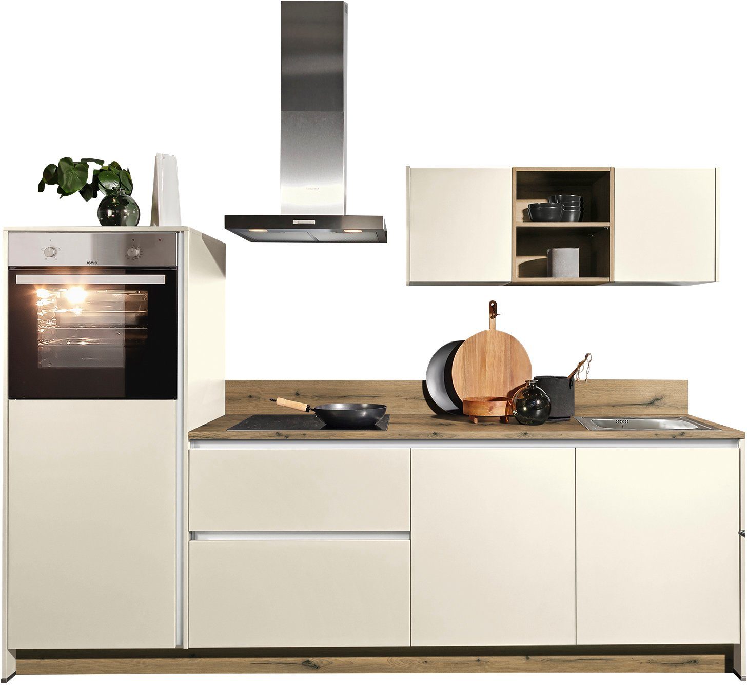 Ausstattung | Durchgehende Arbeitsplatte Griffleiste Grifflose Optik Höhenverstellbare Füße Nischenrückwand Schubkästen mit Vollauszug und Soft-Close-Funktion inkl. Edelstahl-Einbauspüle, ohne Abtropffläche ohne E-Geräte |