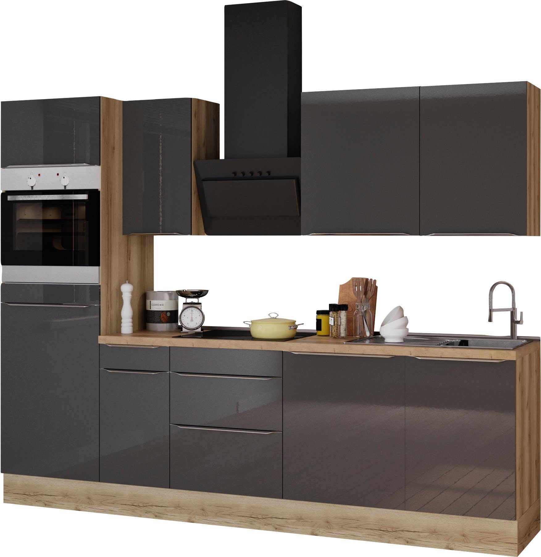 Ausstattung | Durchgehende Arbeitsplatte Schubkästen und Türen mit Soft-Close-Funktion Stabile Metallauszüge Wandabschlussleiste inkl. Edelstahl-Einbauspüle, mit Abtropffläche |