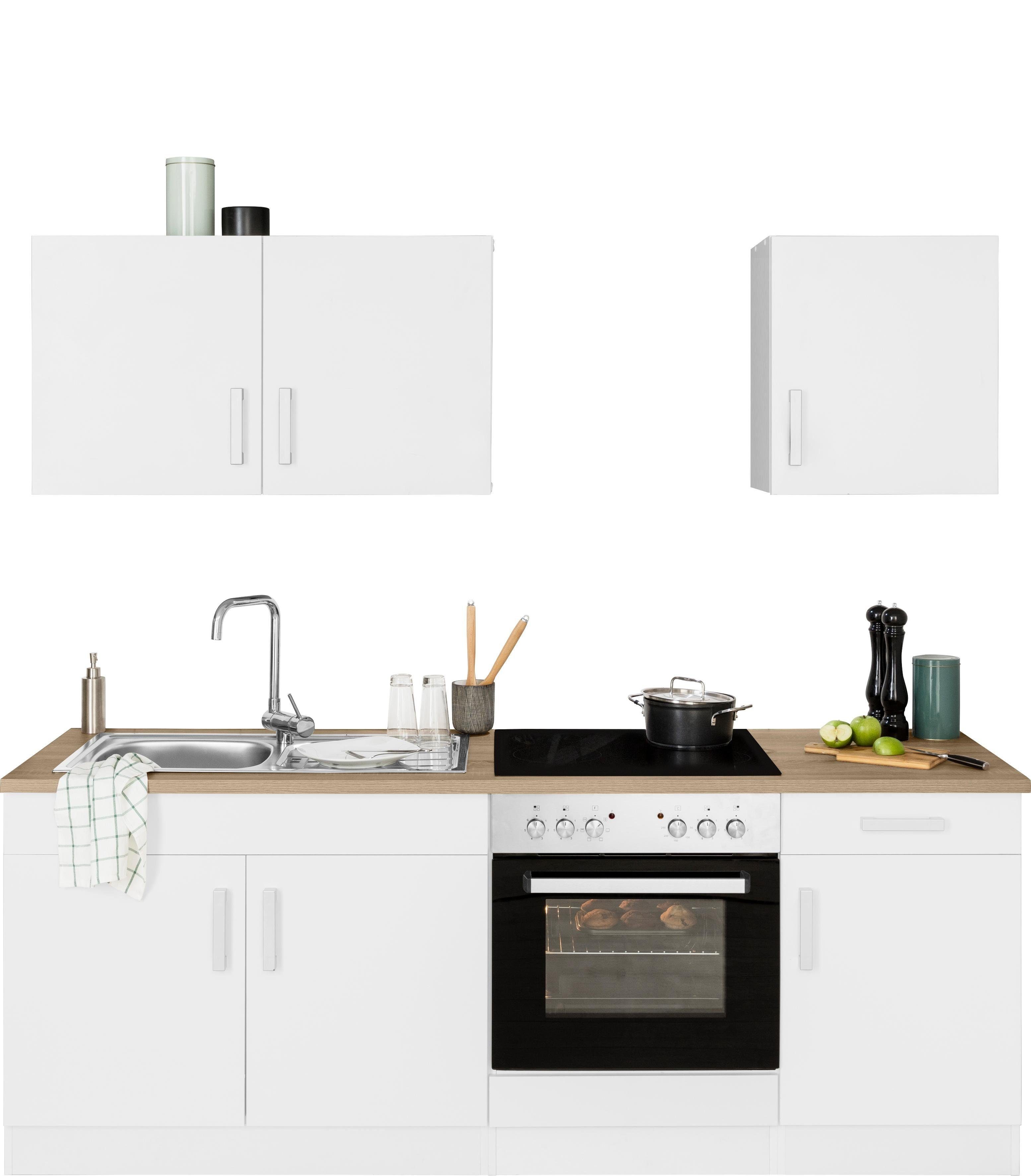 Ausstattung | Durchgehende Arbeitsplatte inkl. Edelstahl-Auflagespüle, mit Abtropffläche mit E-Geräten |