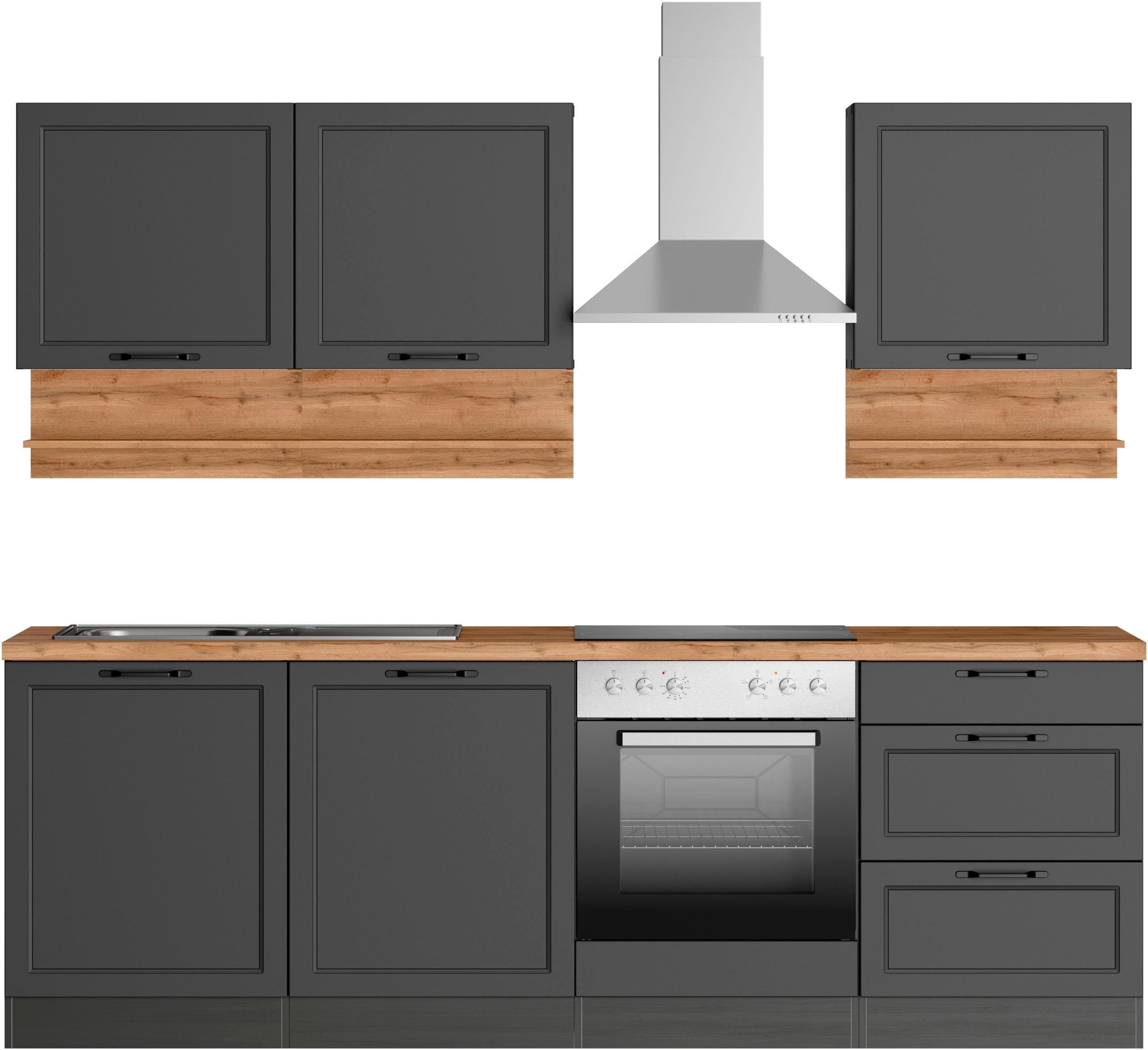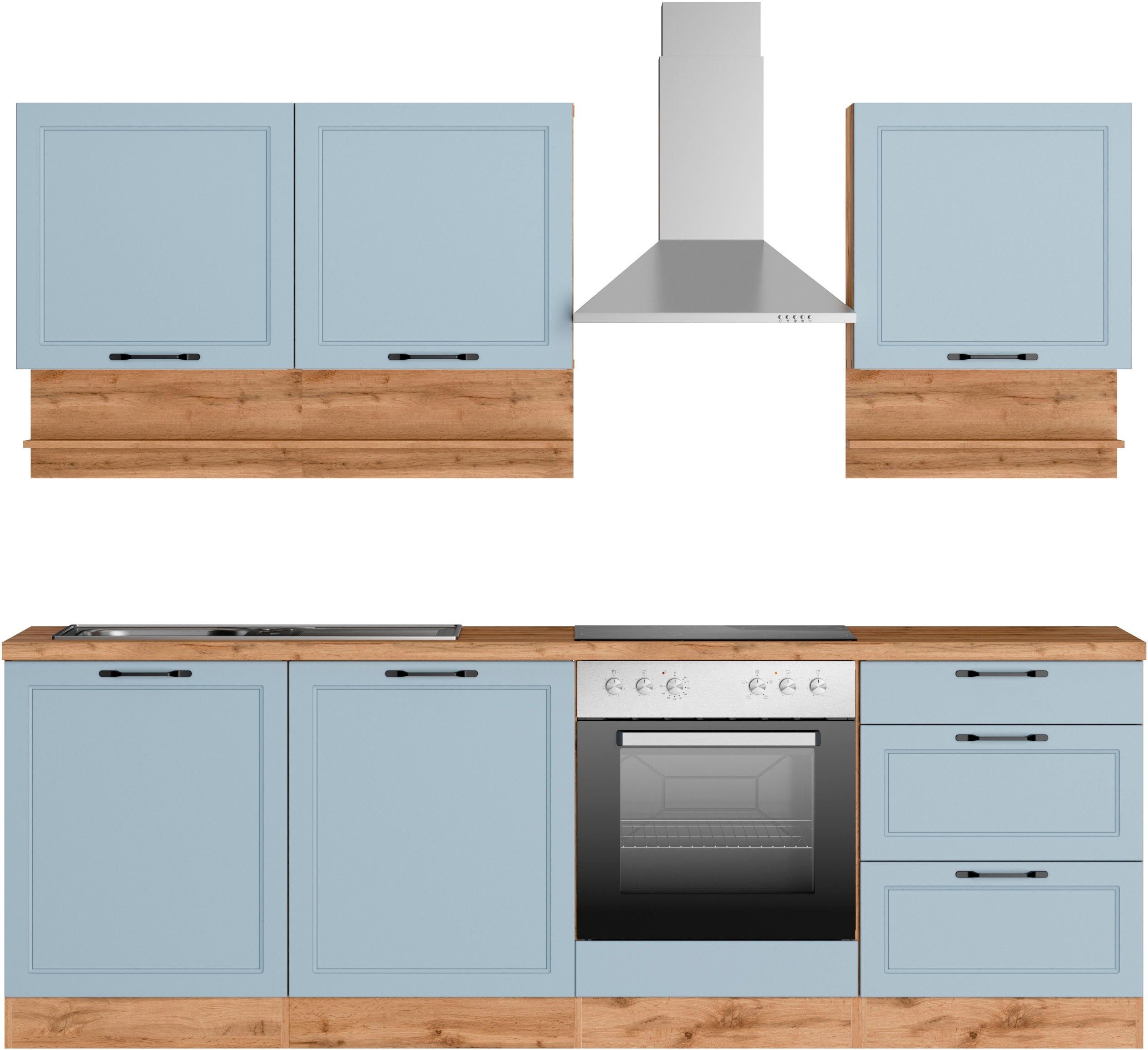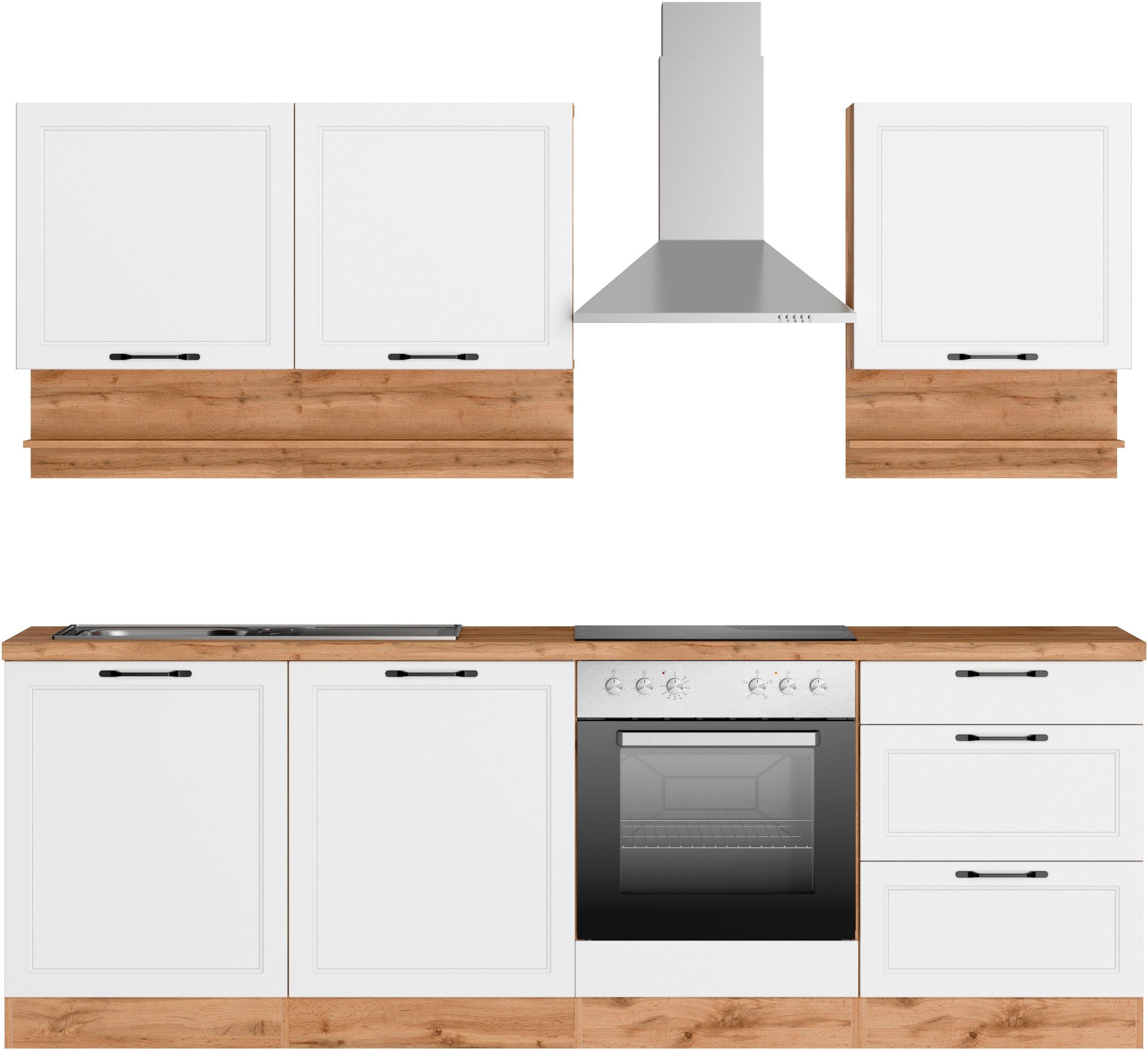 Ausstattung | Durchgehende Arbeitsplatte Einlegeböden höhenverstellbar Laufleisten der Schubkästen aus Metall Metallgriffe inkl. Edelstahl-Auflagespüle, mit Abtropffläche ohne E-Geräte |