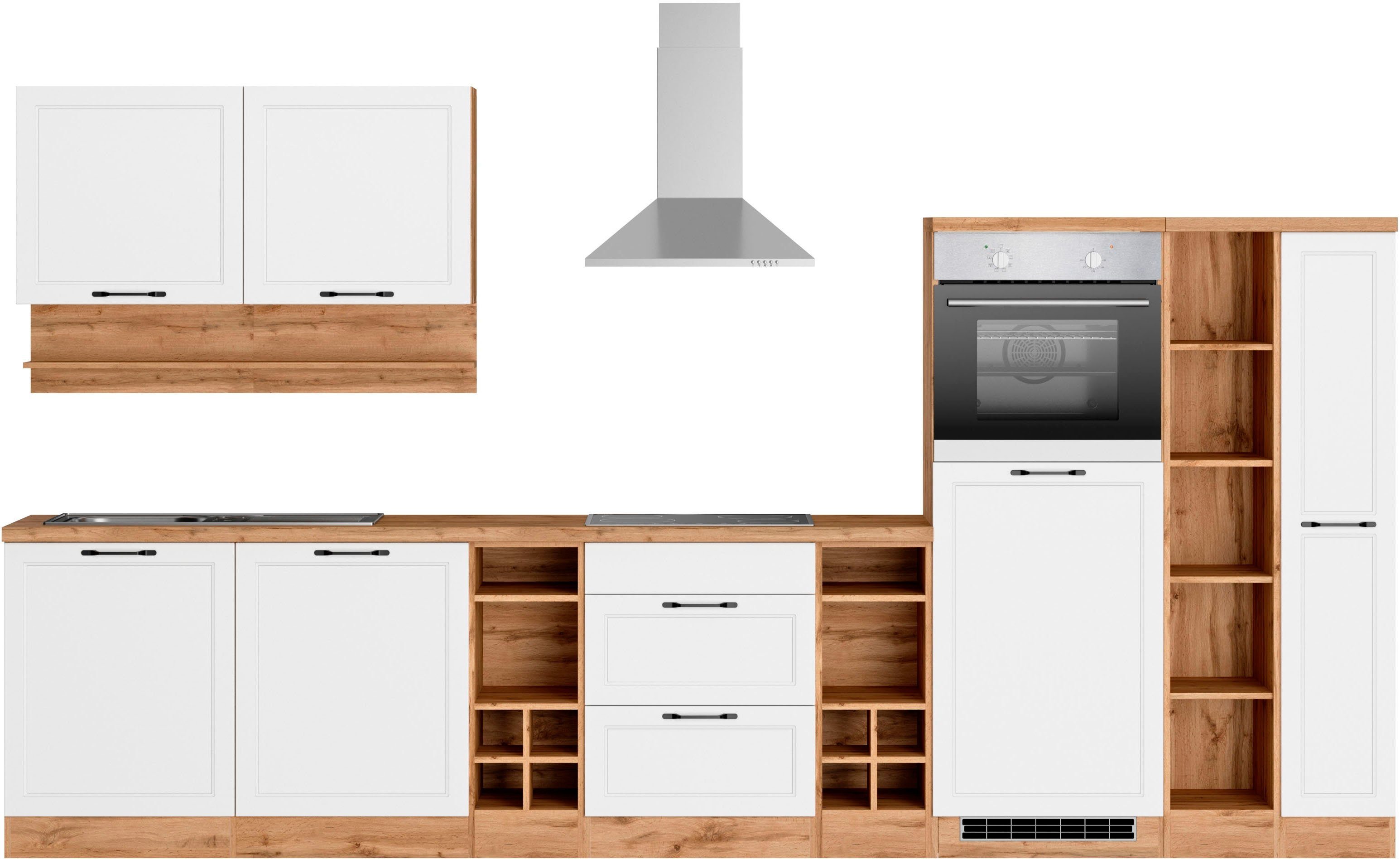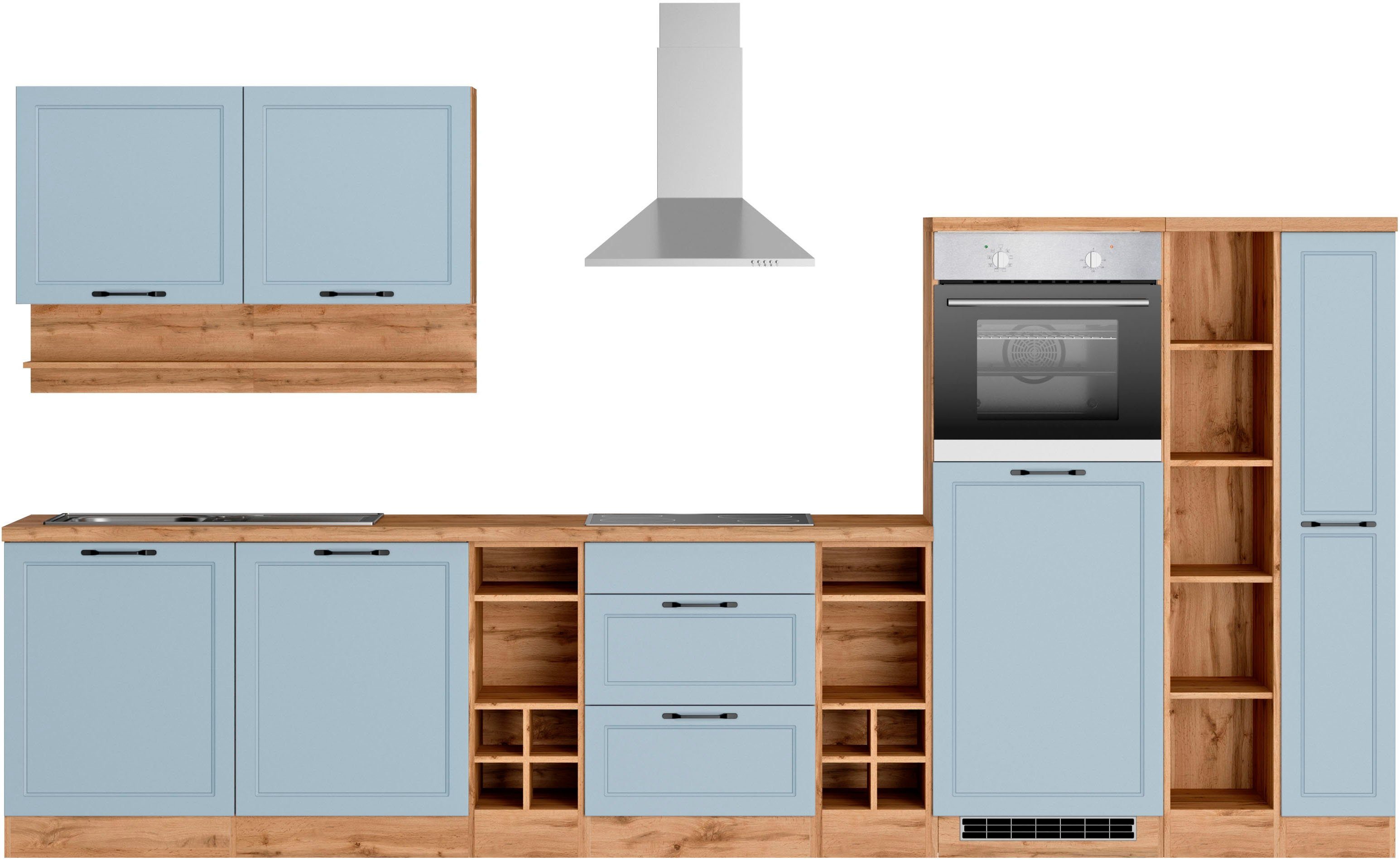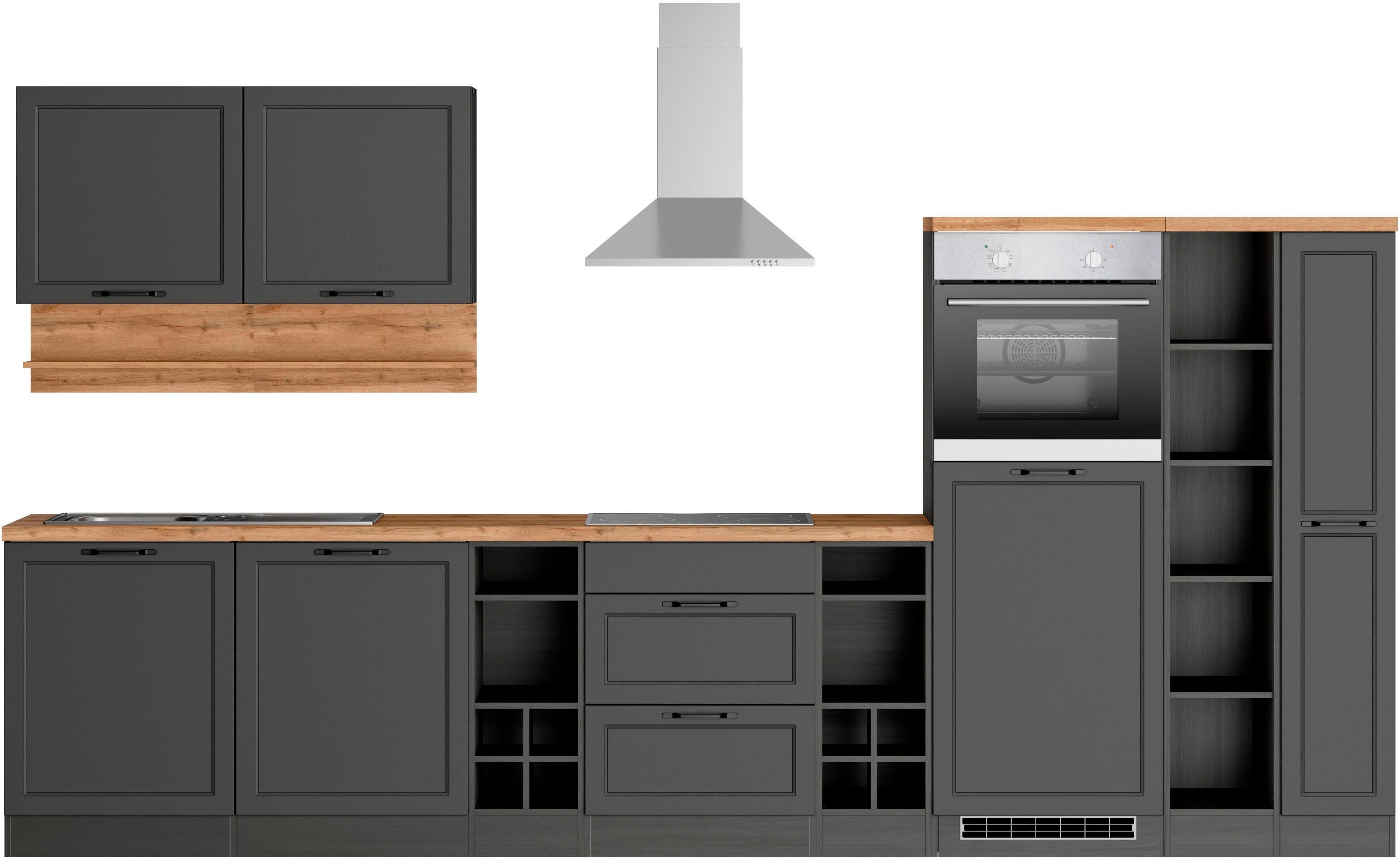Ausstattung | Durchgehende Arbeitsplatte Einlegeböden höhenverstellbar Laufleisten der Schubkästen aus Metall Metallgriffe inkl. Edelstahl-Auflagespüle, mit Abtropffläche ohne E-Geräte |