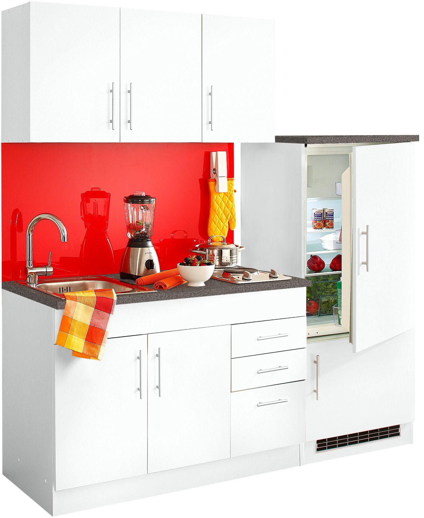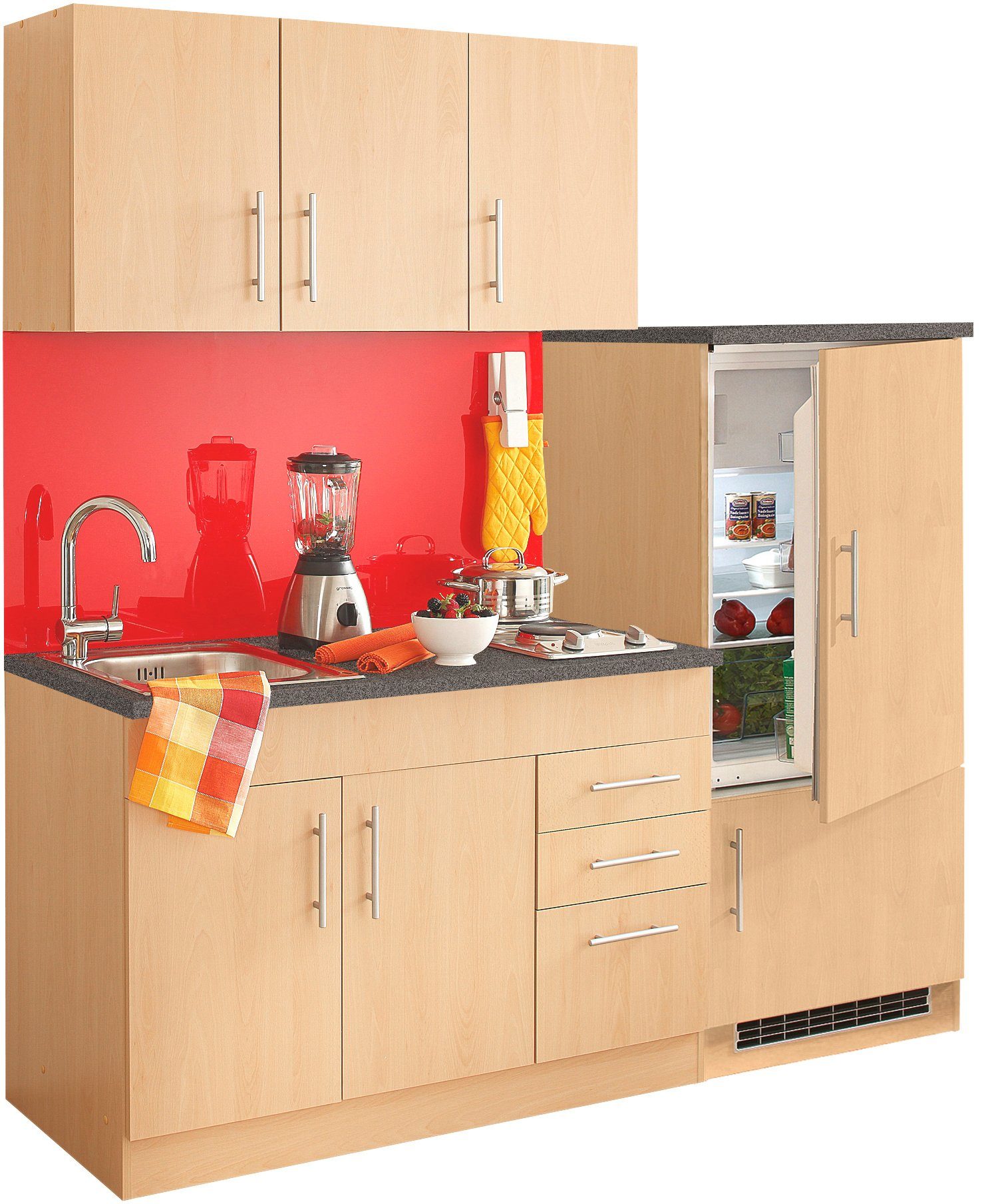 Wissenswertes | Pflegeleichte Kunststoffoberfläche, Fronten in MDF Hochglanz (außer buchefb.+ weiß). Hänge- und Unterschränke mit je 1 Einlegeboden. Türen rechts/links anschlagbar. Spüle: Edelstahlspüle Gesamtmaße Einbauspüle: (B/T): ca. 40/50 cm