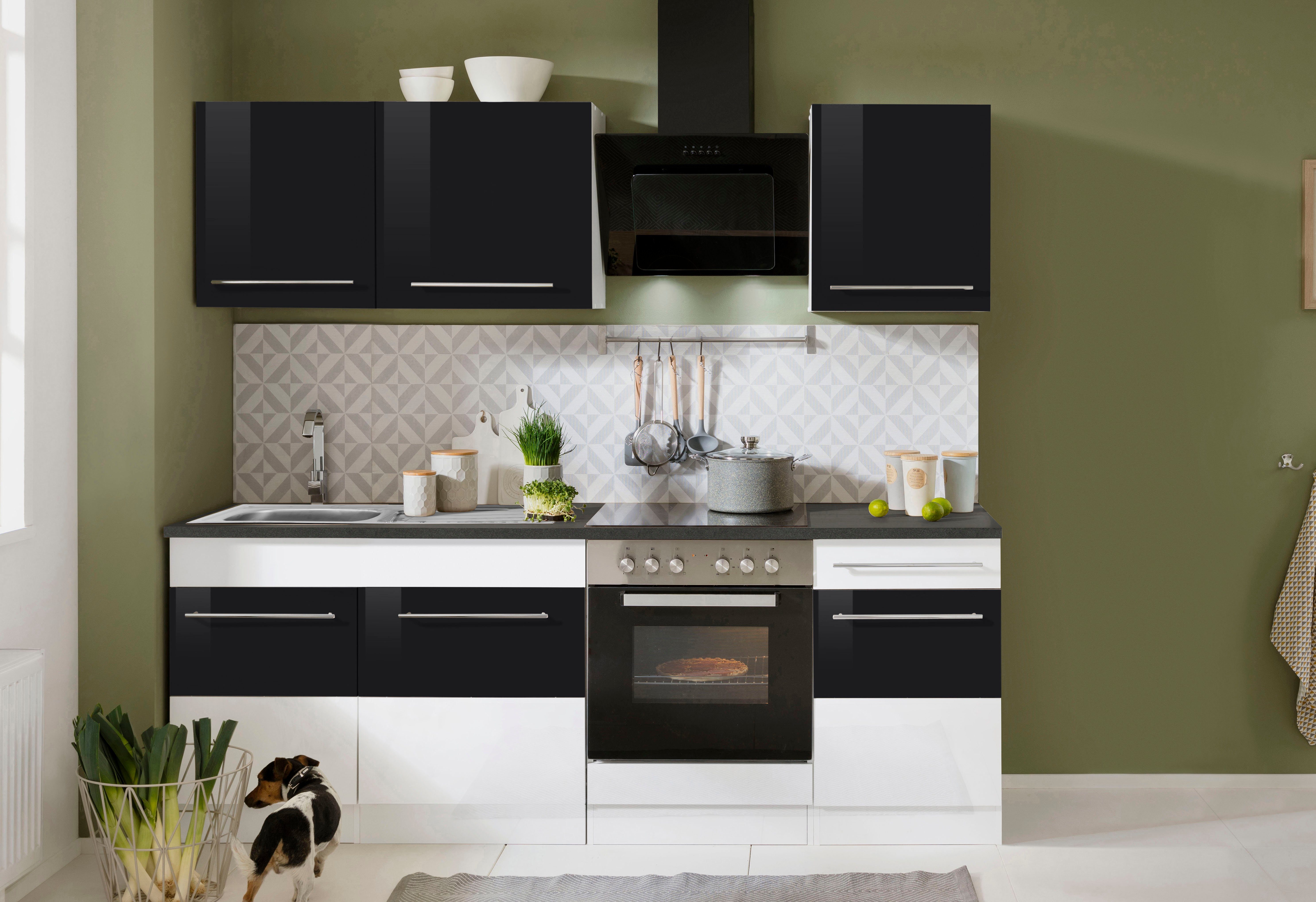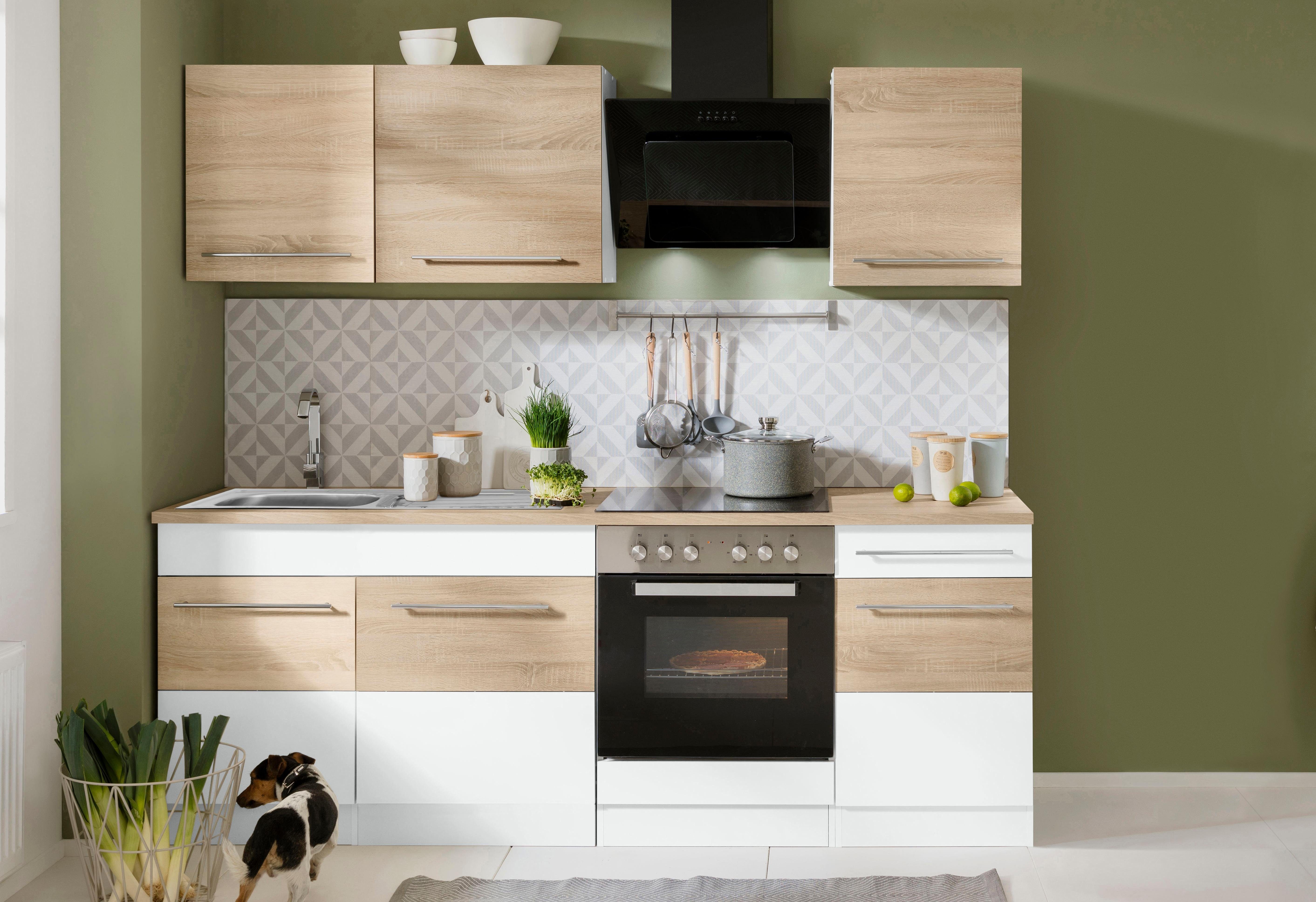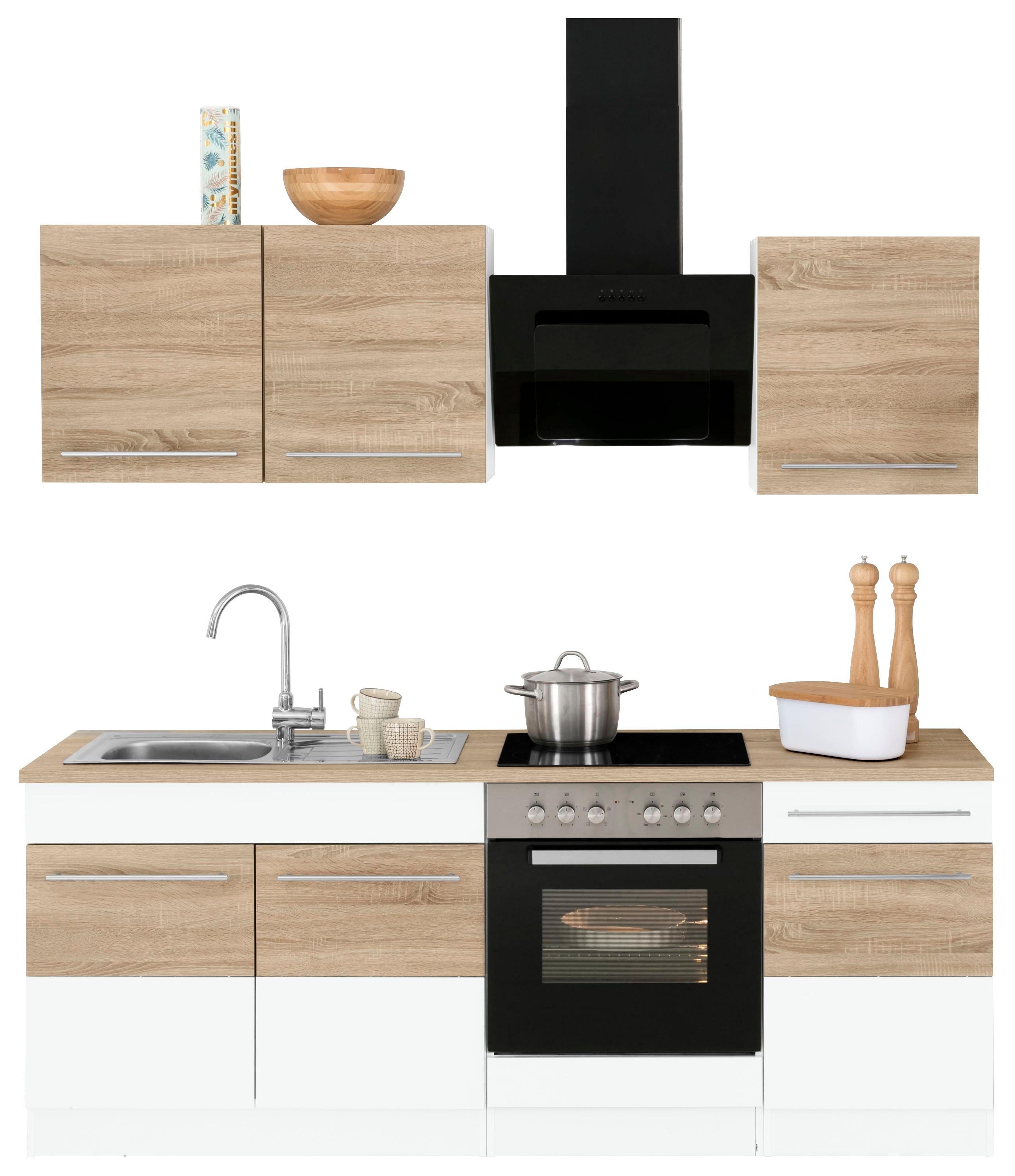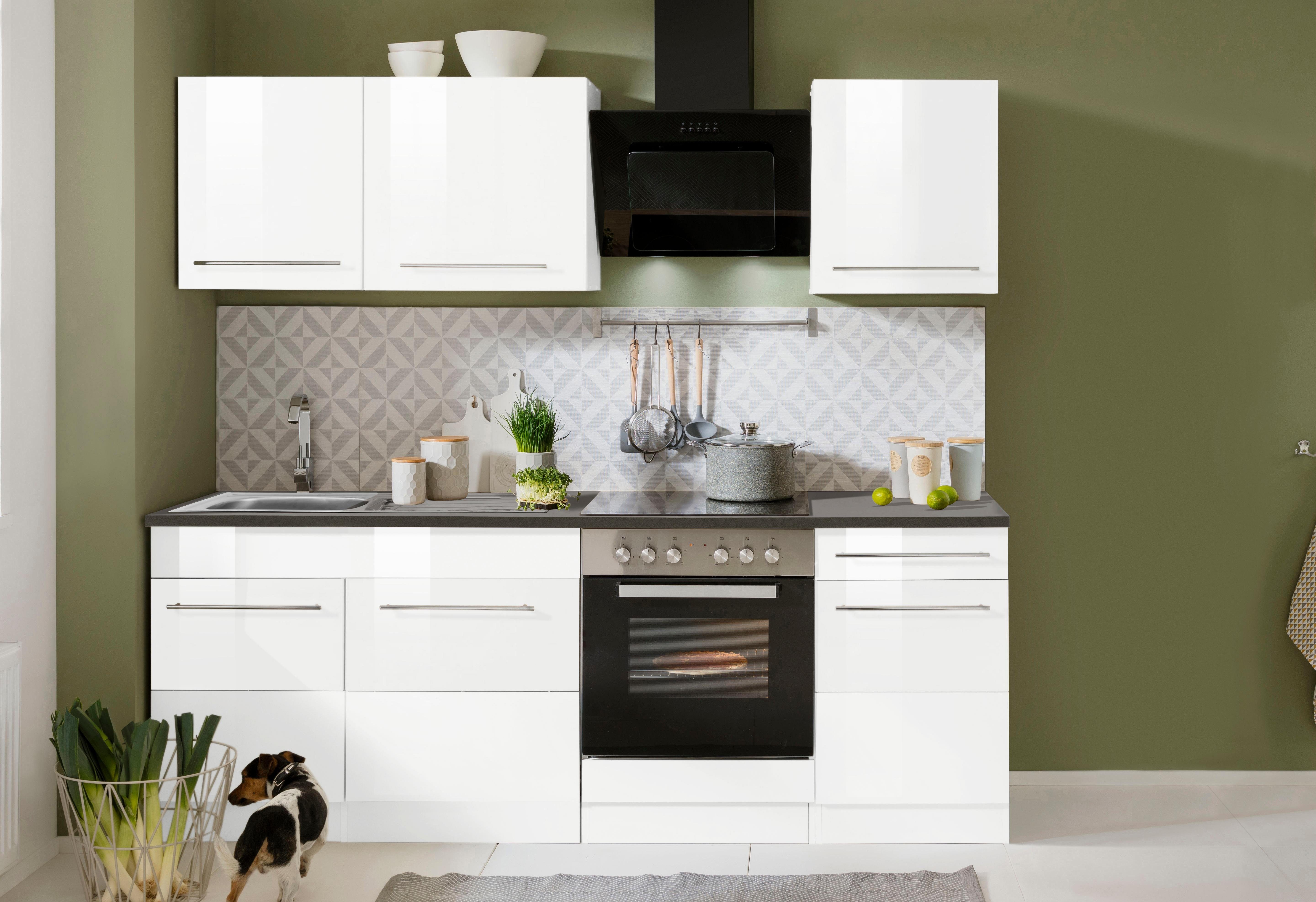 Ausstattung | Durchgehende Arbeitsplatte Einlegeböden der Hängeschränke höhenverstellbar Griffe glänzend verchromt inkl. Edelstahl-Auflagespüle, mit Abtropffläche |