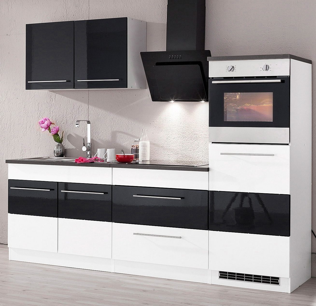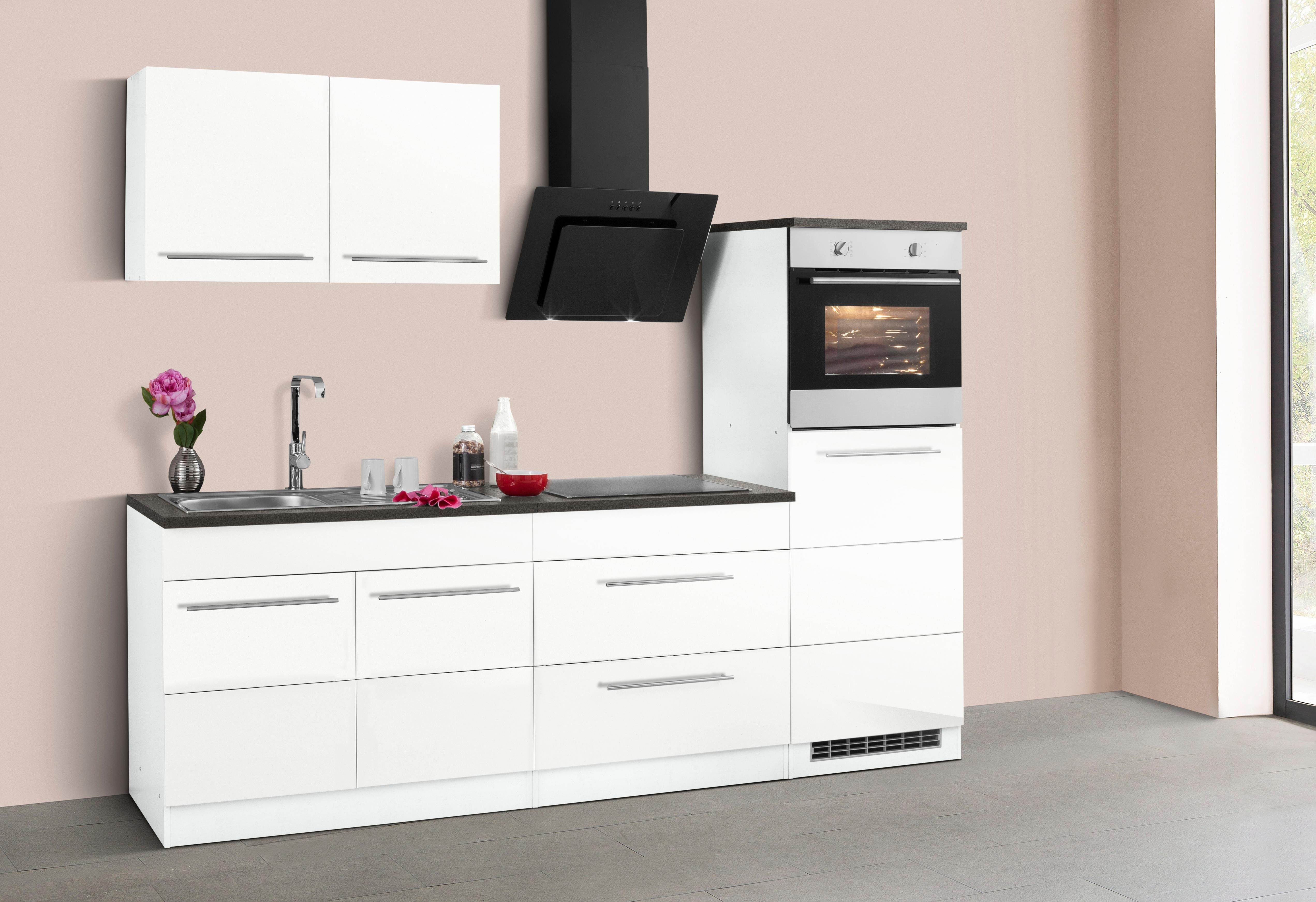 Ausstattung | Durchgehende Arbeitsplatte Einlegeböden der Hängeschränke höhenverstellbar Griffe glänzend verchromt inkl. Edelstahl-Auflagespüle, mit Abtropffläche |
