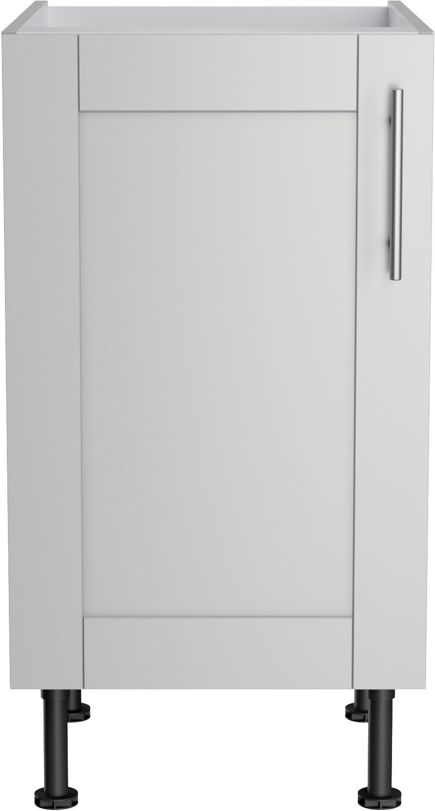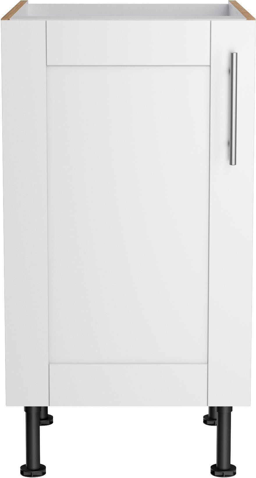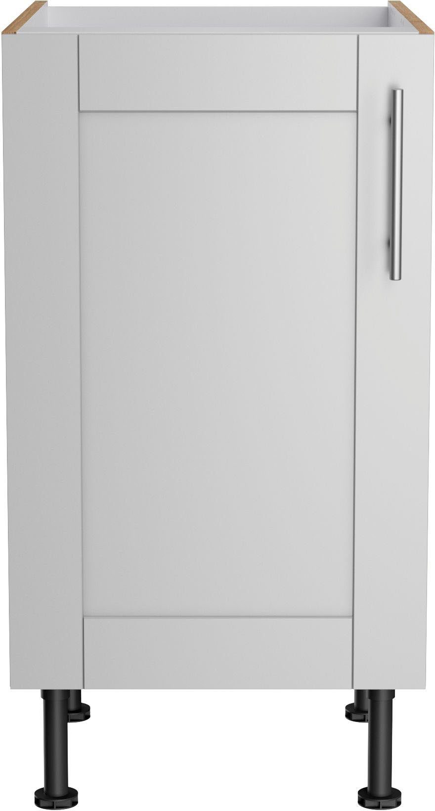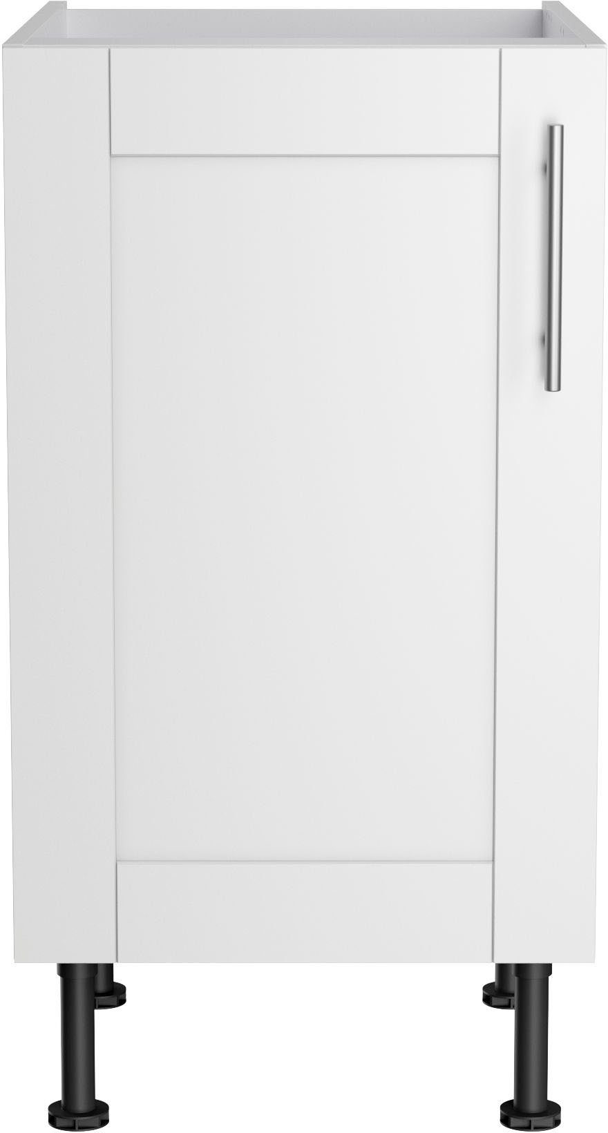 Das Modell lässt sich außerdem genau auf dich und deine Einrichtung anpassen, denn der Türanschlag kann entweder rechts oder links montiert werden. Die Füße sind besonders praktisch, da sie höhenverstellbar sind. So lassen sich mögliche Unebenheiten des Bodens ausgleichen, damit der Schrank gerade steht.