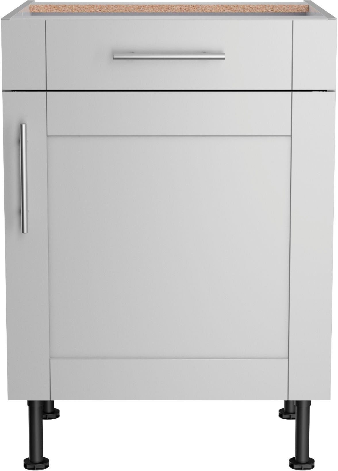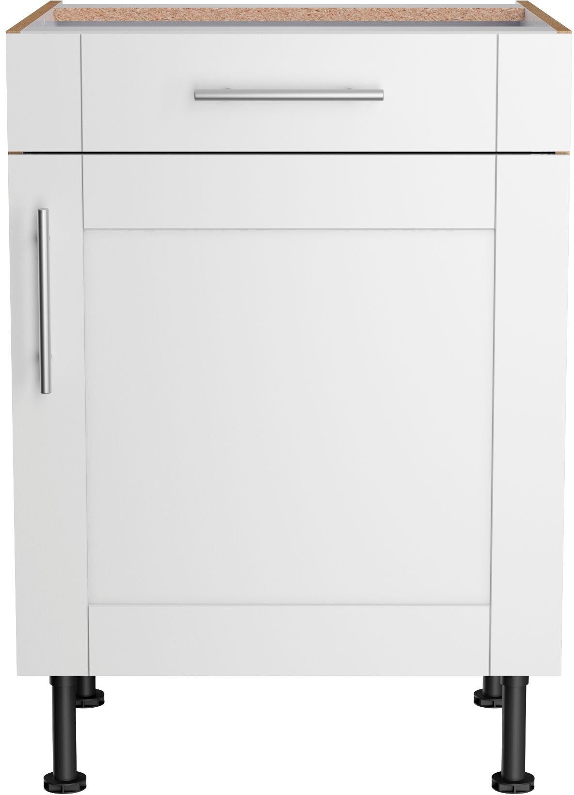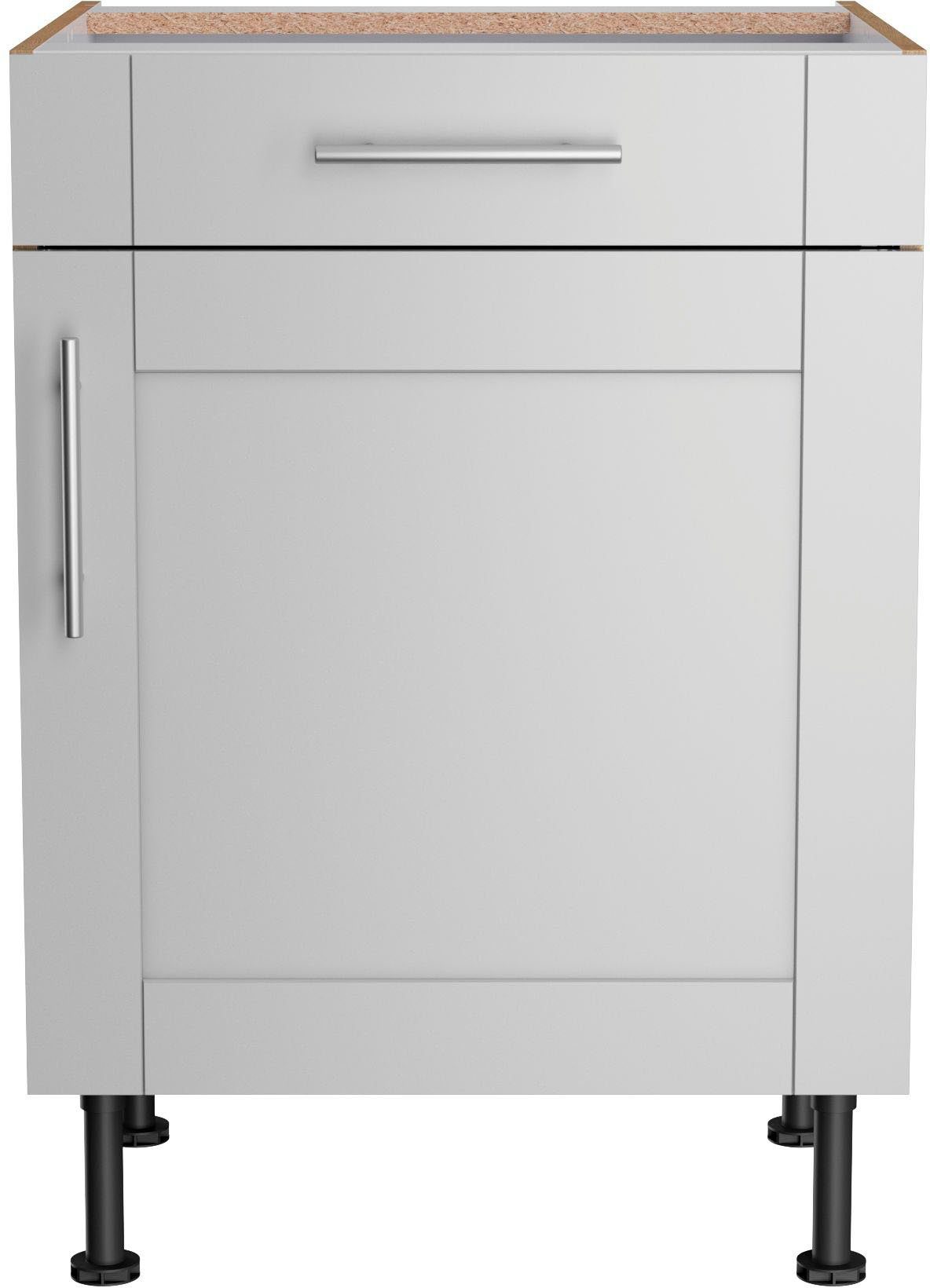 Sorgt zu Hause für Ordnung und aufgeräumte Gemütlichkeit — der Unterschrank »KS-Ahus« von KOCHSTATION. Die Öffnungsrichtung kannst du nach Belieben festlegen, da der Türanschlag sowohl rechts als auch links angebracht werden kann. Die Schubladen lassen sich komplett ausziehen und bieten dir weitere Unterbringungsmöglichkeiten. Die Einlegeböden sind variabel einsetzbar. So kannst du selbst über die Höhe der einzelnen Fächer bestimmen. Die Füße sind höhenverstellbar. Der Schrank lässt sich daher flexibel einbauen und du kannst noch ein paar Millimeter weg- oder dazu mogeln, falls zum Beispiel dein Boden zuhause nicht ganz eben ist.