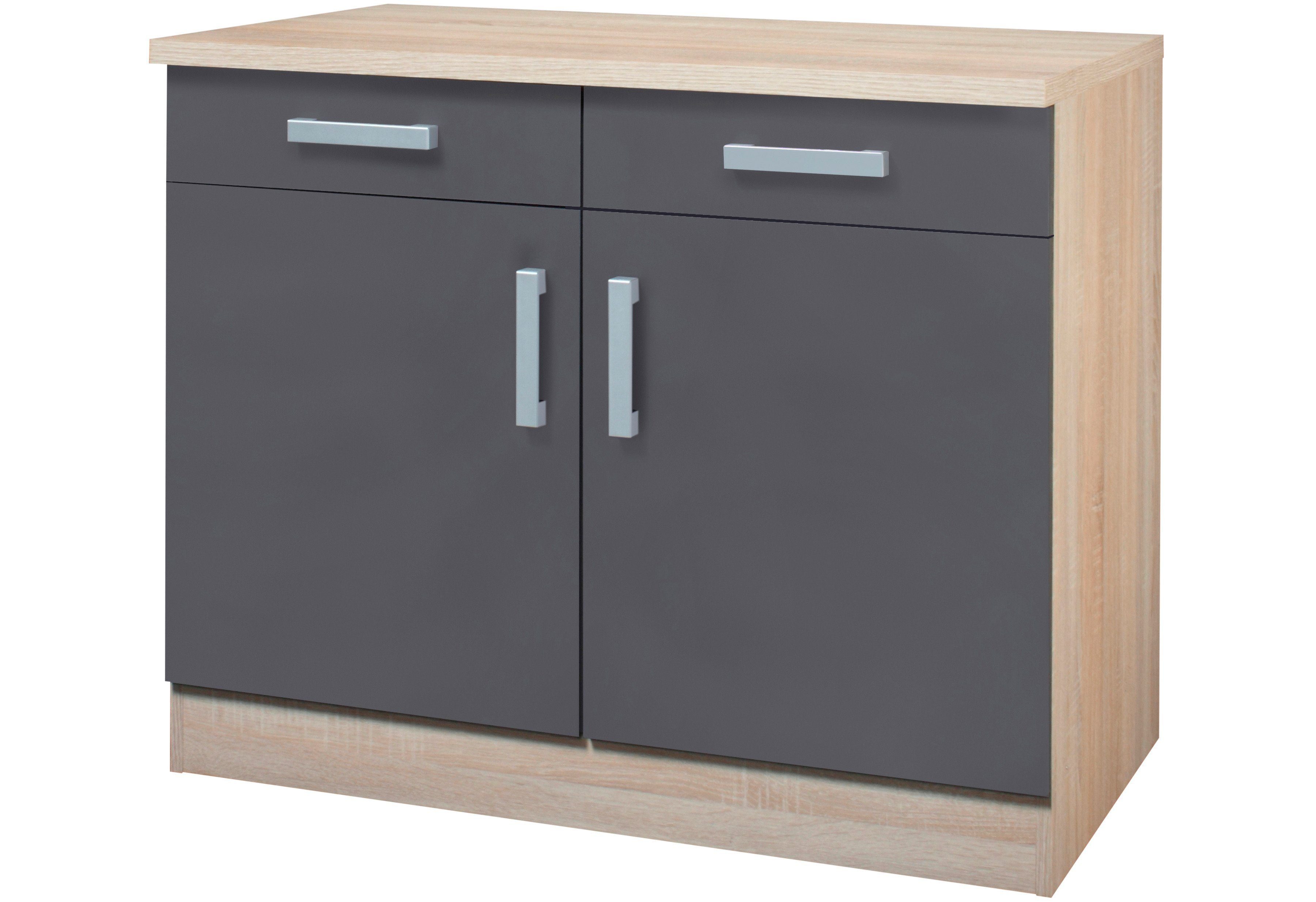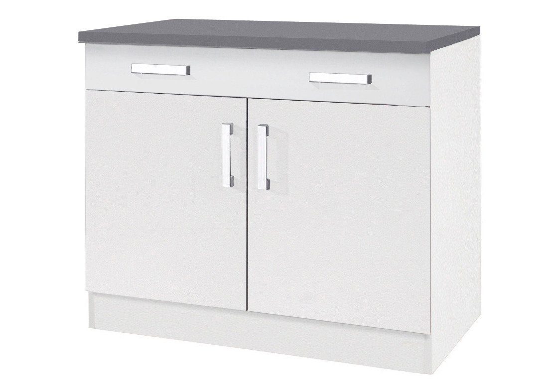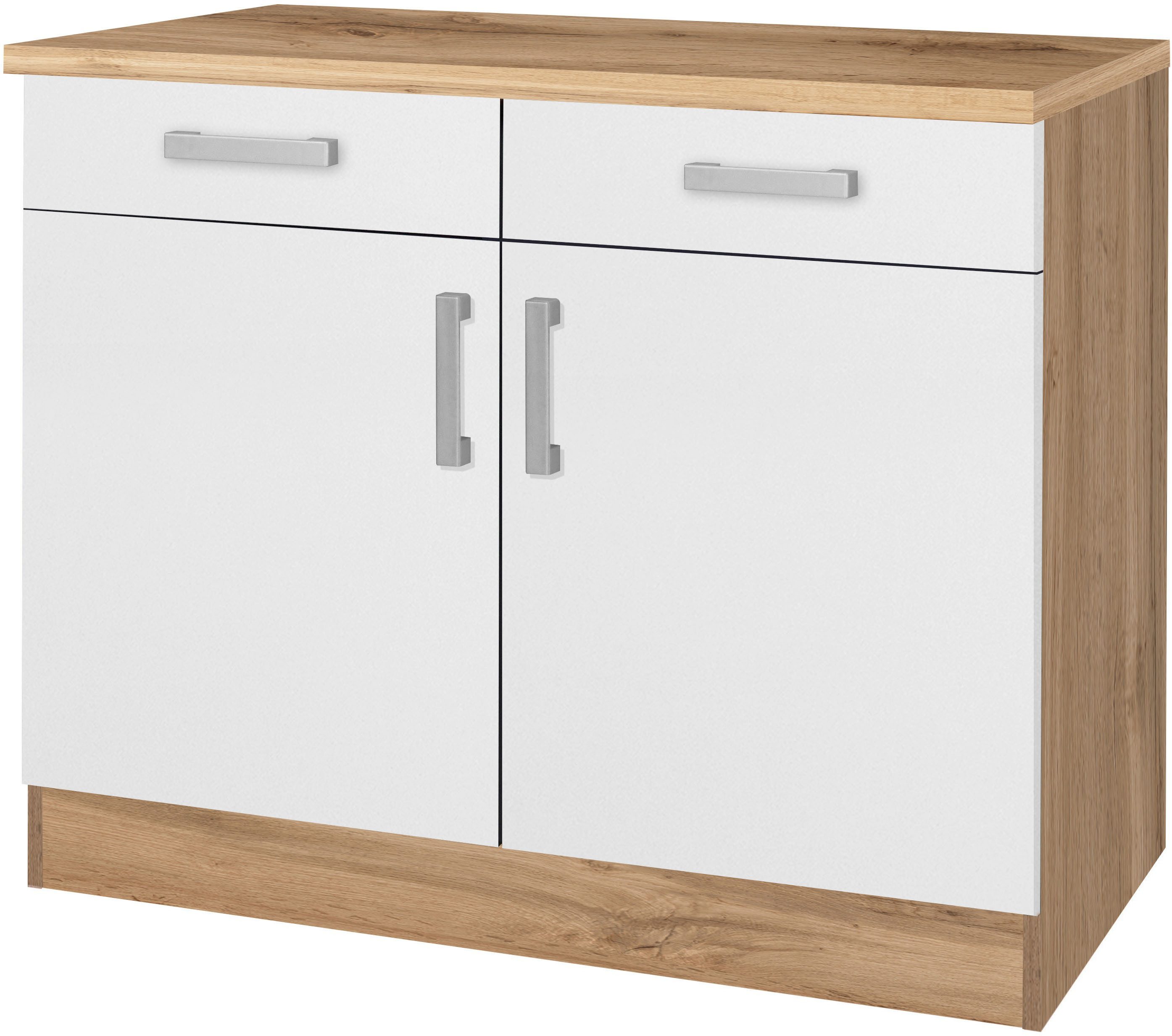 Die Küchenserie »KS-Toronto« mit ihren matten melaminbeschichteten Fronten sieht nicht nur toll aus, sondern birgt auch hinsichtlich der Platzausnutzung ein durchdachtes Konzept. So bietet der Unterschrank mit zwei Türen und zwei Auszügen viel Stauraum. Der Küchenschrank hat silberfarbene Kunststoffgriffe und eine 28 mm starke Arbeitsplatte, die Auszüge laufen leichtgängig auf Metalllaufschienen.