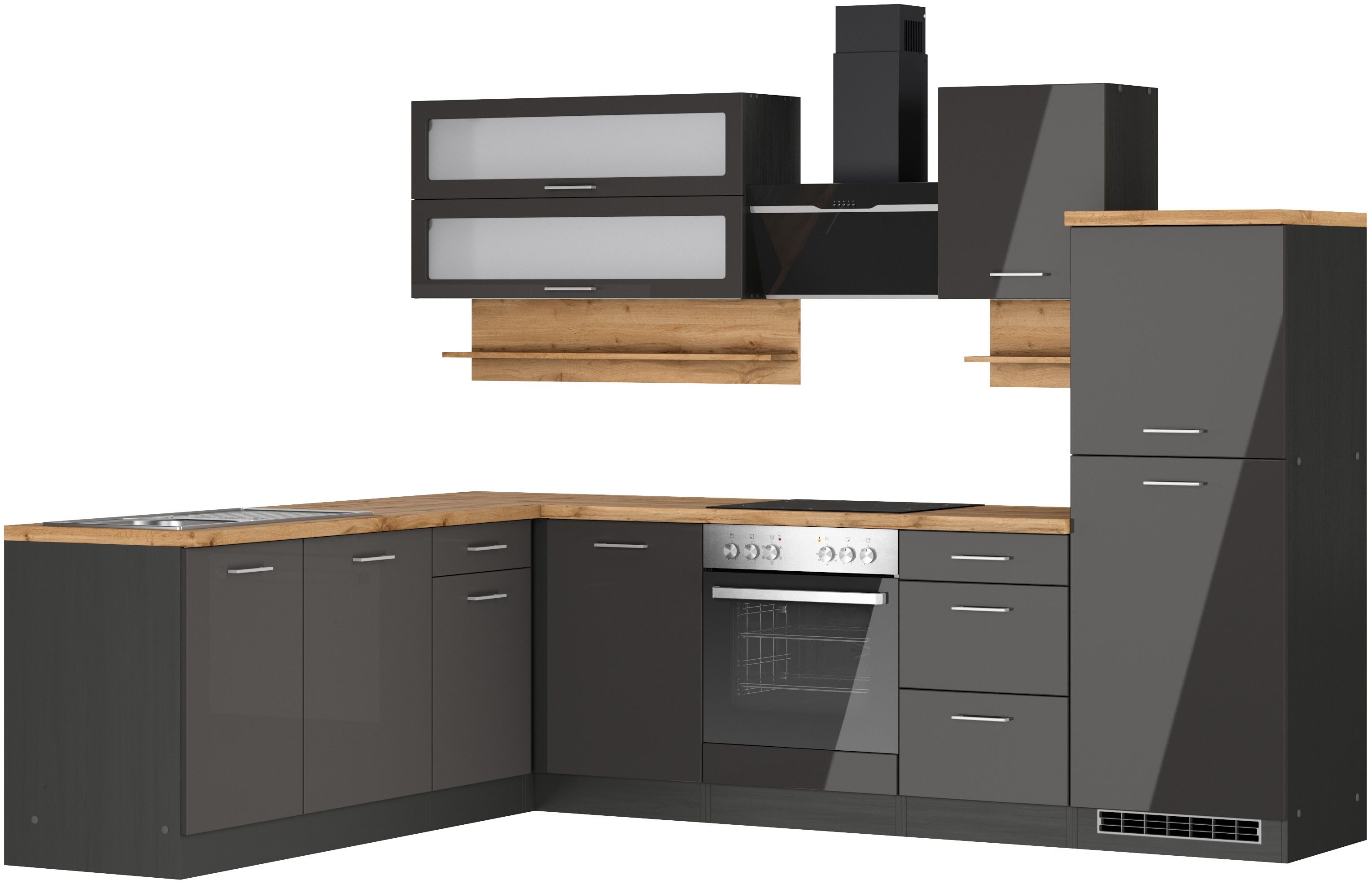 Ausstattung | Durchgehende Arbeitsplatte Einlegeböden höhenverstellbar Laufleisten der Schubkästen aus Metall Stellschrauben in den Unterschränken als Montagehilfe zum Ausgleichen von Unebenheiten: 0-4 cm inkl. Edelstahl-Auflagespüle, mit Abtropffläche ohne E-Geräte |