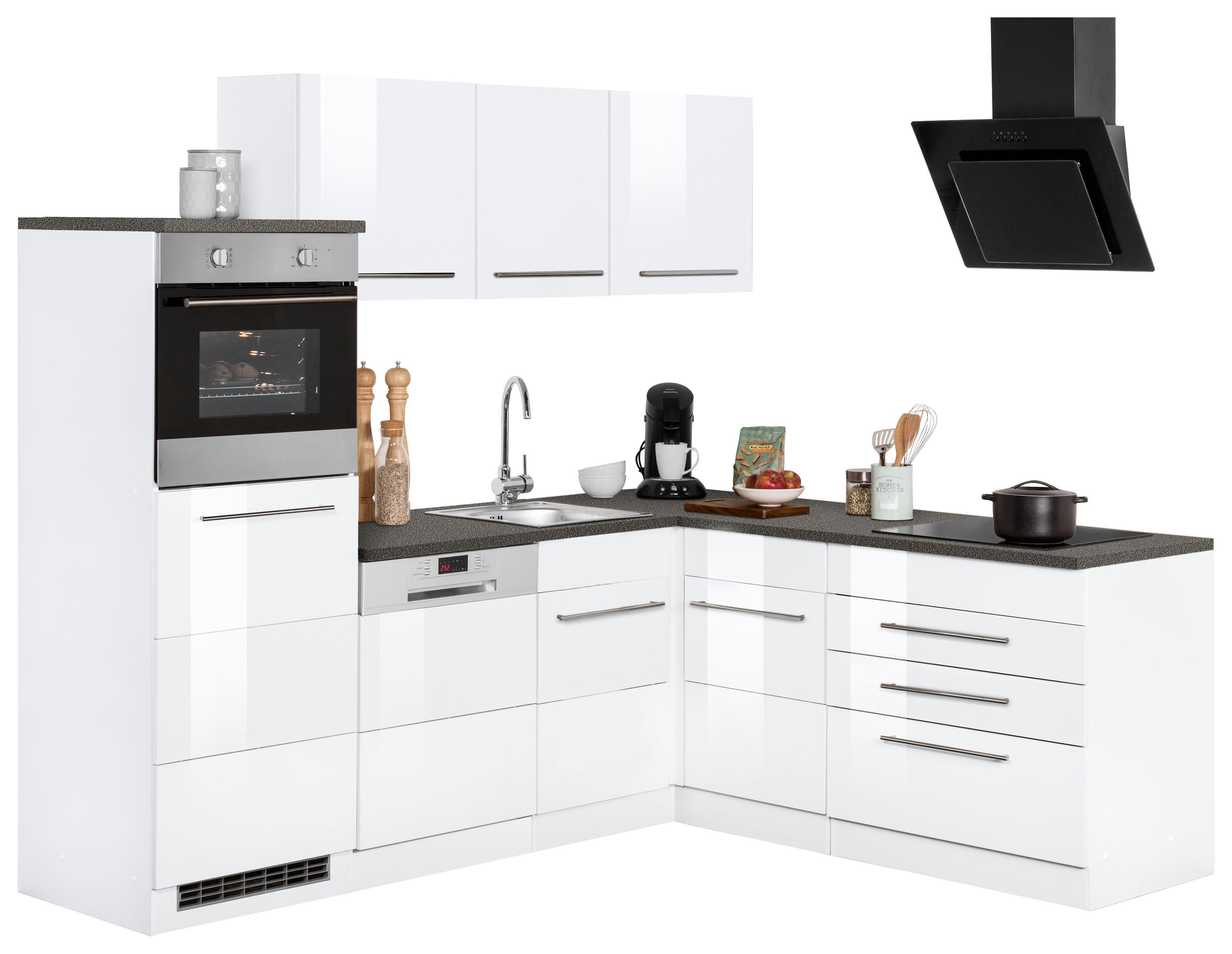 Ausstattung | Durchgehende Arbeitsplatte Einlegeböden der Hängeschränke höhenverstellbar Griffe glänzend verchromt inkl. Edelstahl-Auflagespüle, mit Abtropffläche |