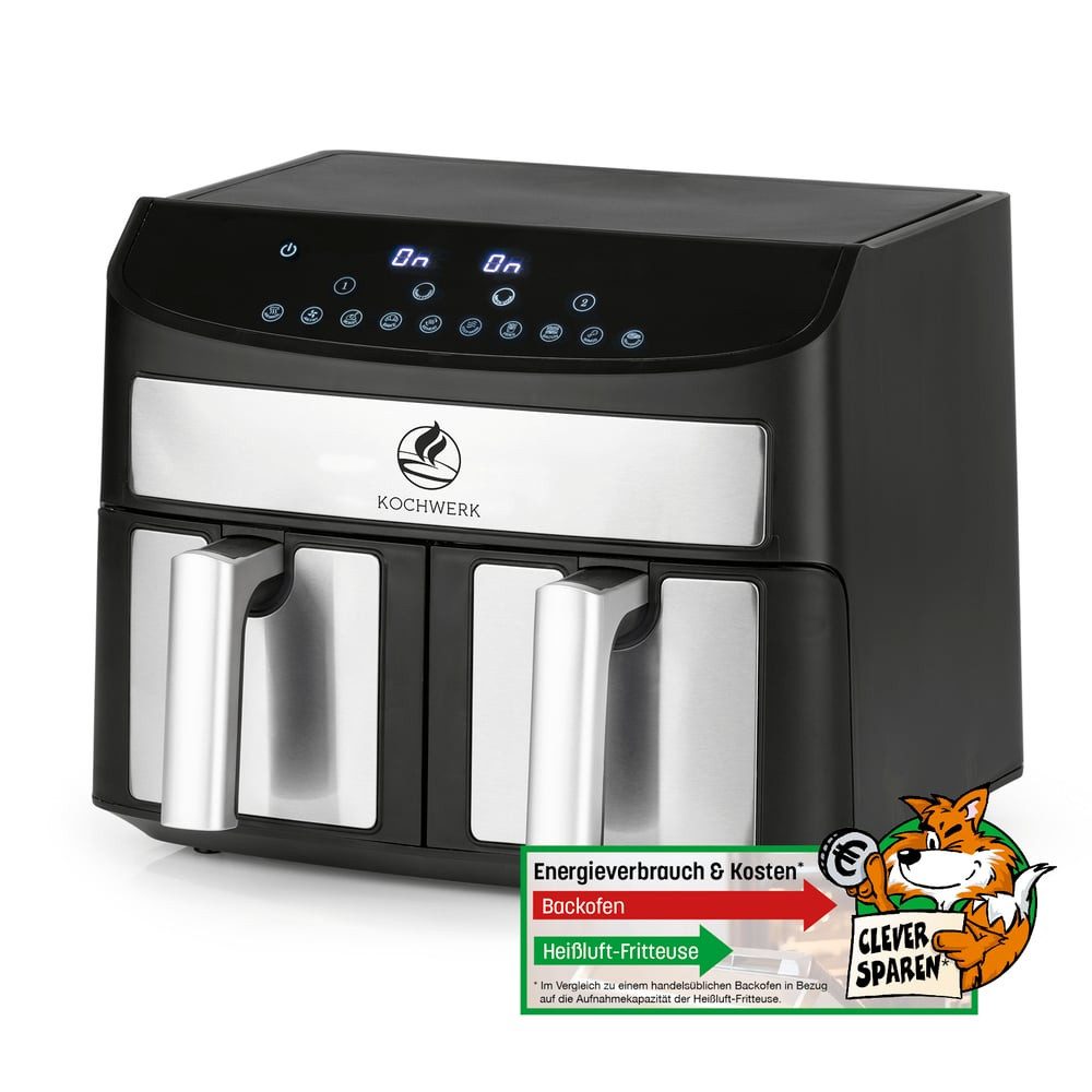 Mit der Kochwerk Doppelkammer-Heißluftfritteuse für eine einfache und gelingsichere Zubereitung Ihrer Lieblingsspeisen. Mit 60-Minuten-Timer und Warmhaltefunktion.