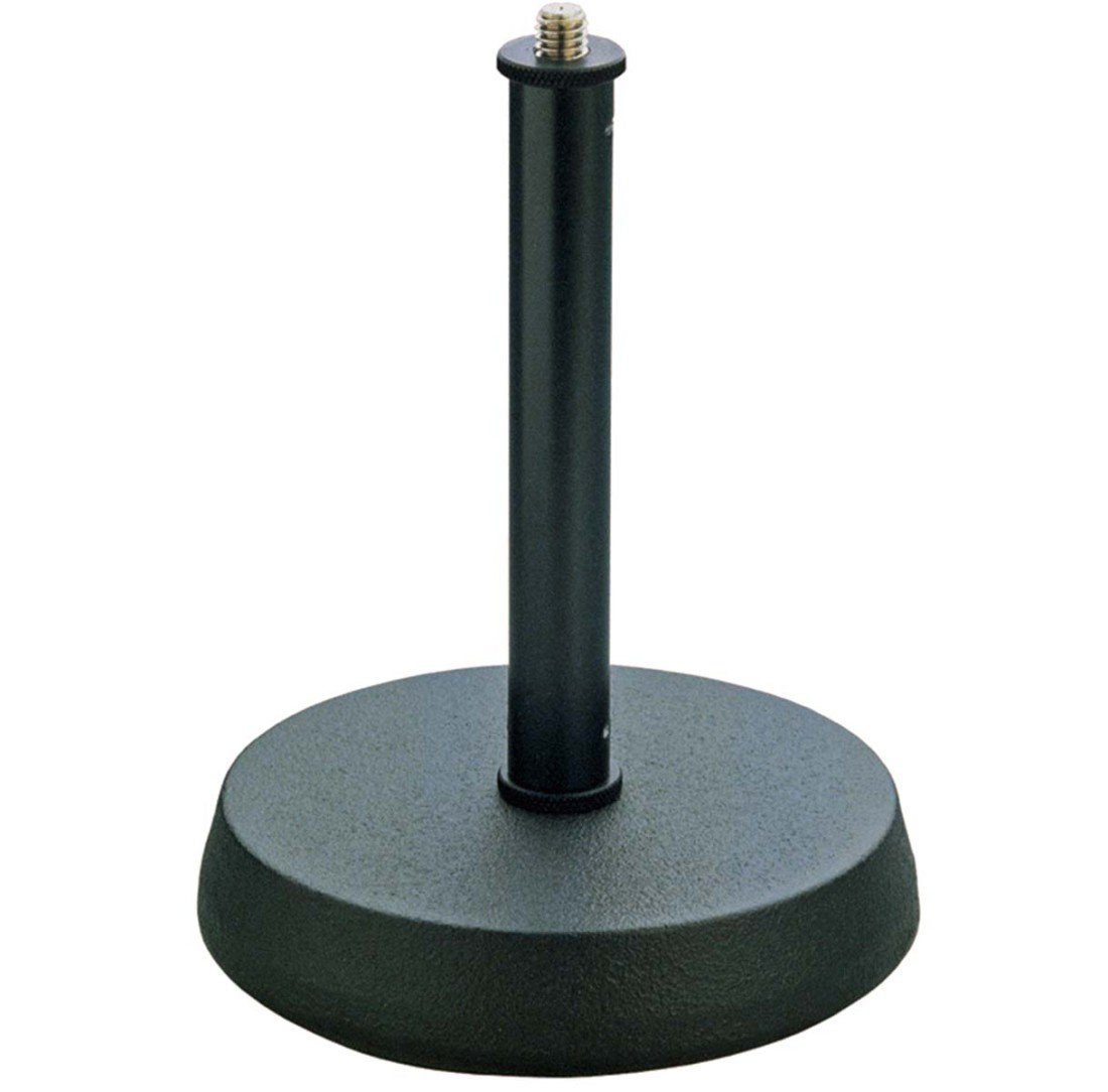 Das K&M Mikrofon-Tischstativ Modell 232 verfügt über einen Guss-Rundsockel mit spezieller Gummieinlage zur Schalldämpfung. Der Guss-Sockel hat einen Durchmesser von 13 cm, wobei das Gesamtgewicht des Tischständers bei 1,34 kg liegt. Die Höhe des Stativs beträgt 17,5 cm. Am oberen Ende des Ständers findet sich ein 3/8 Zoll Gewindeanschluss.